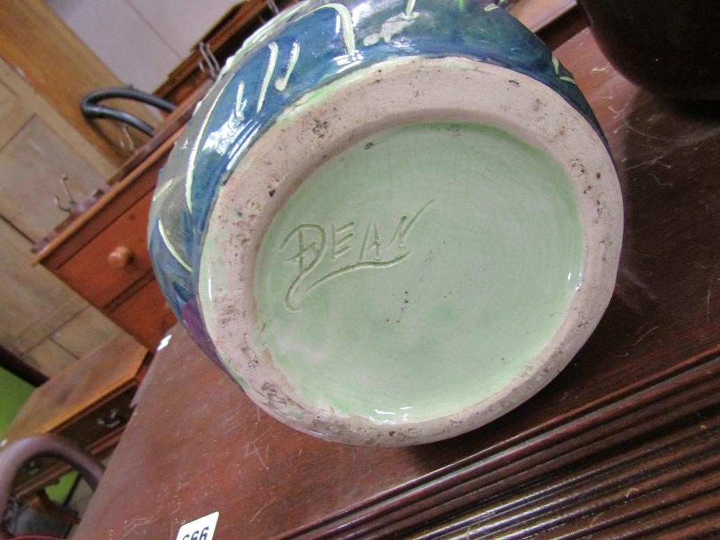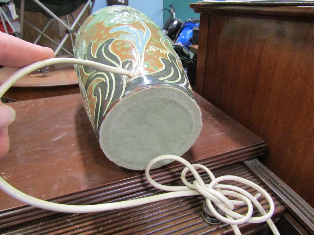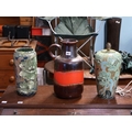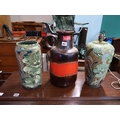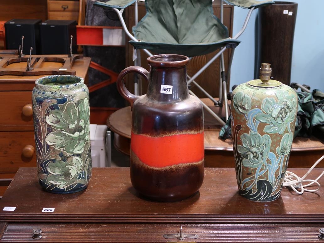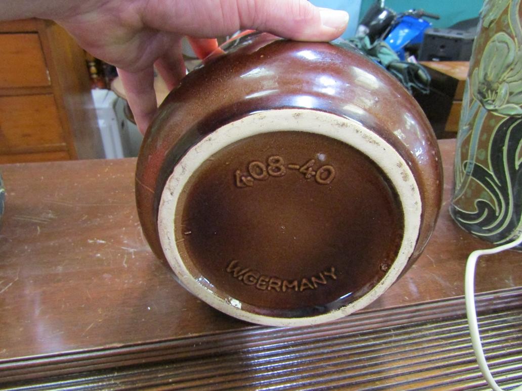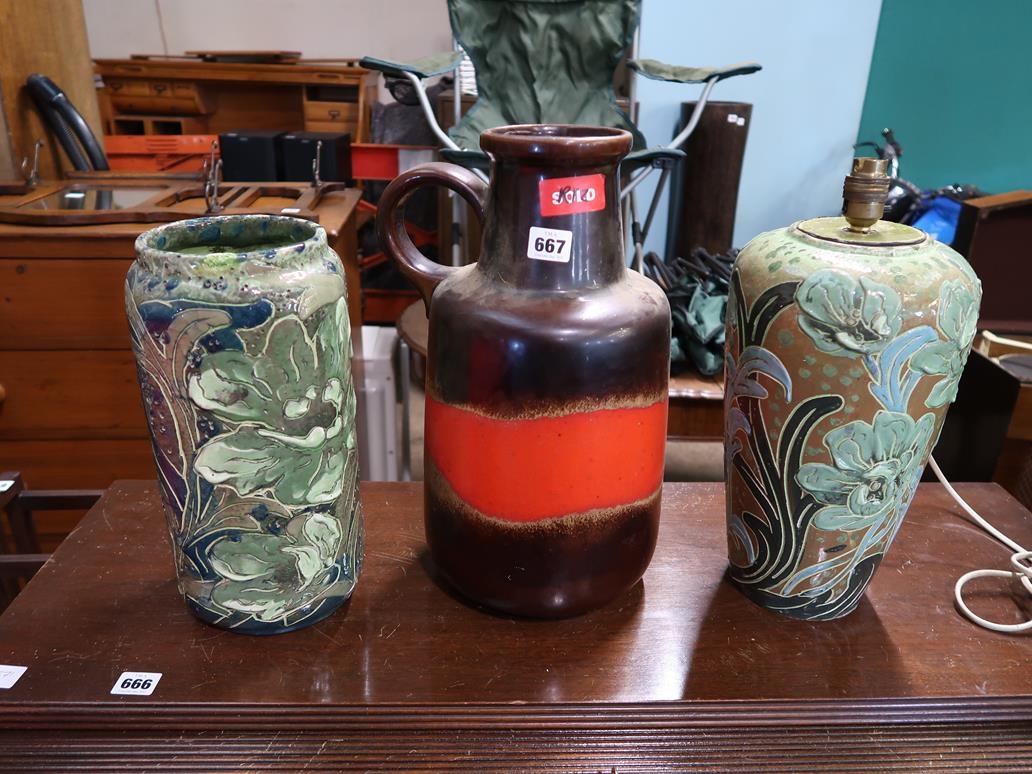 lamp - good condition but with a few chips to glaze 38.5h to top of bulb holder. w. german flagon - good condition no chips/cracks. a few firing faults. 40cms h. Vase Good condition with some chips to glaze 32cms h