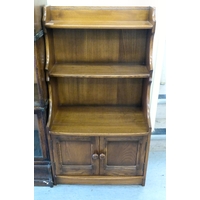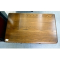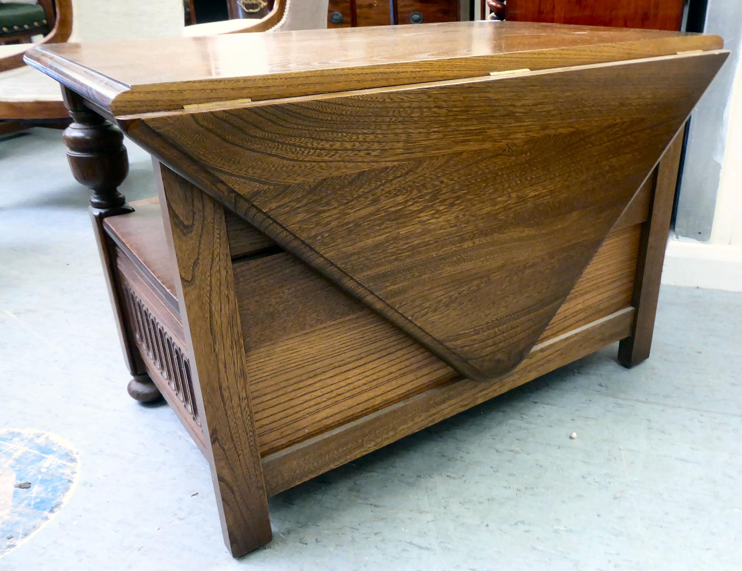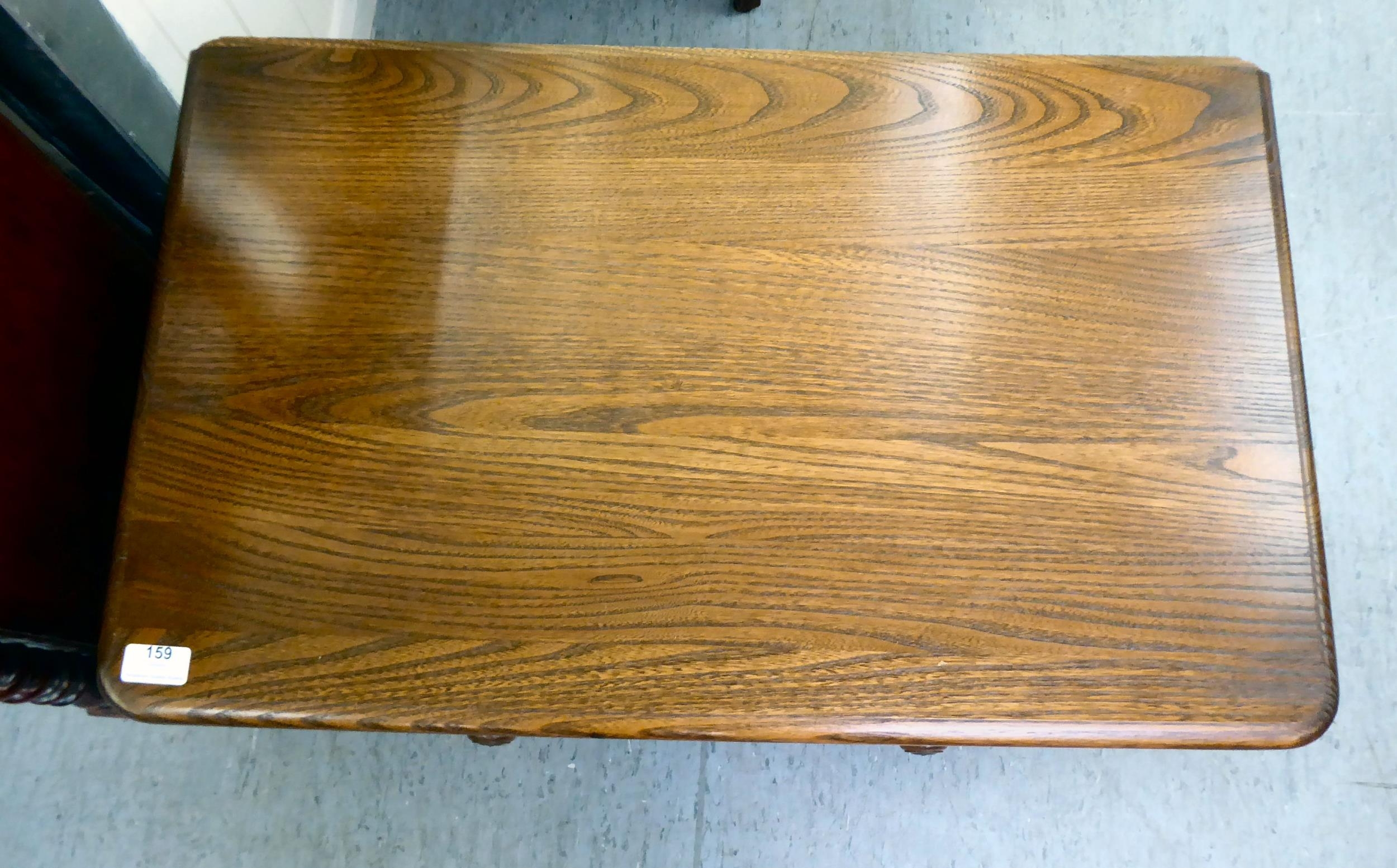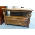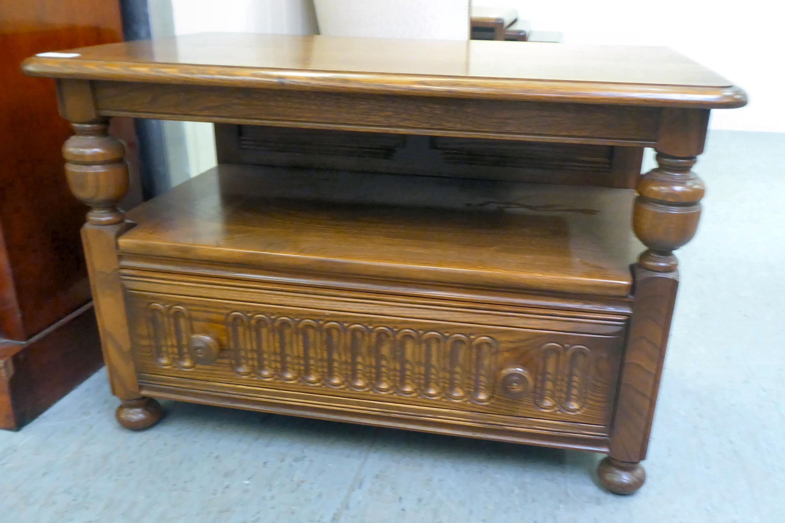 An Ercol Golden Dawn beech and elm television stand, the top with a triangular fall flap, over an open undershelf and base drawer, raised on bun feet 19"h 28"w
