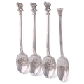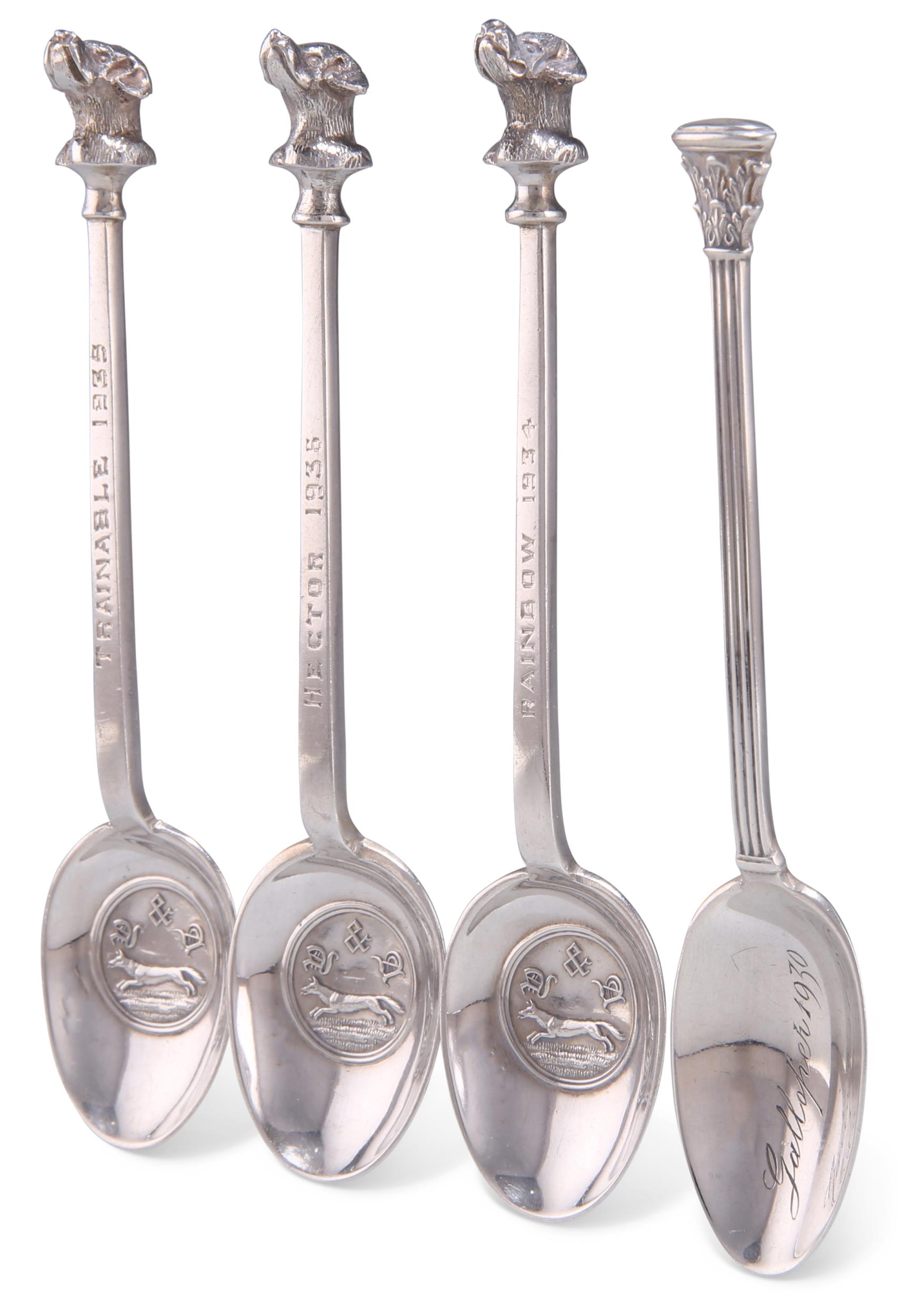 THREE GEORGE V SILVER COMMEMORATIVE HUNT TEASPOONS,Êby Thomas Bradbury & Sons Ltd, Sheffield 1933, 1934 & 1935, for the York & Ainsty Hunt, with hound head terminals, variously engraved with hound names 'RAINBOW 1934', 'TRAINABLE 1935' and 'HECTOR 1936'; andÊA GEORGE V SILVER TEASPOON,Êby David Landsborough Fullerton, London 1930,ÊengravedÊ'Galloper 1930'Êto the bowl. (4) Hunt spoons 11.2cm, 2.1 troy ounces gross