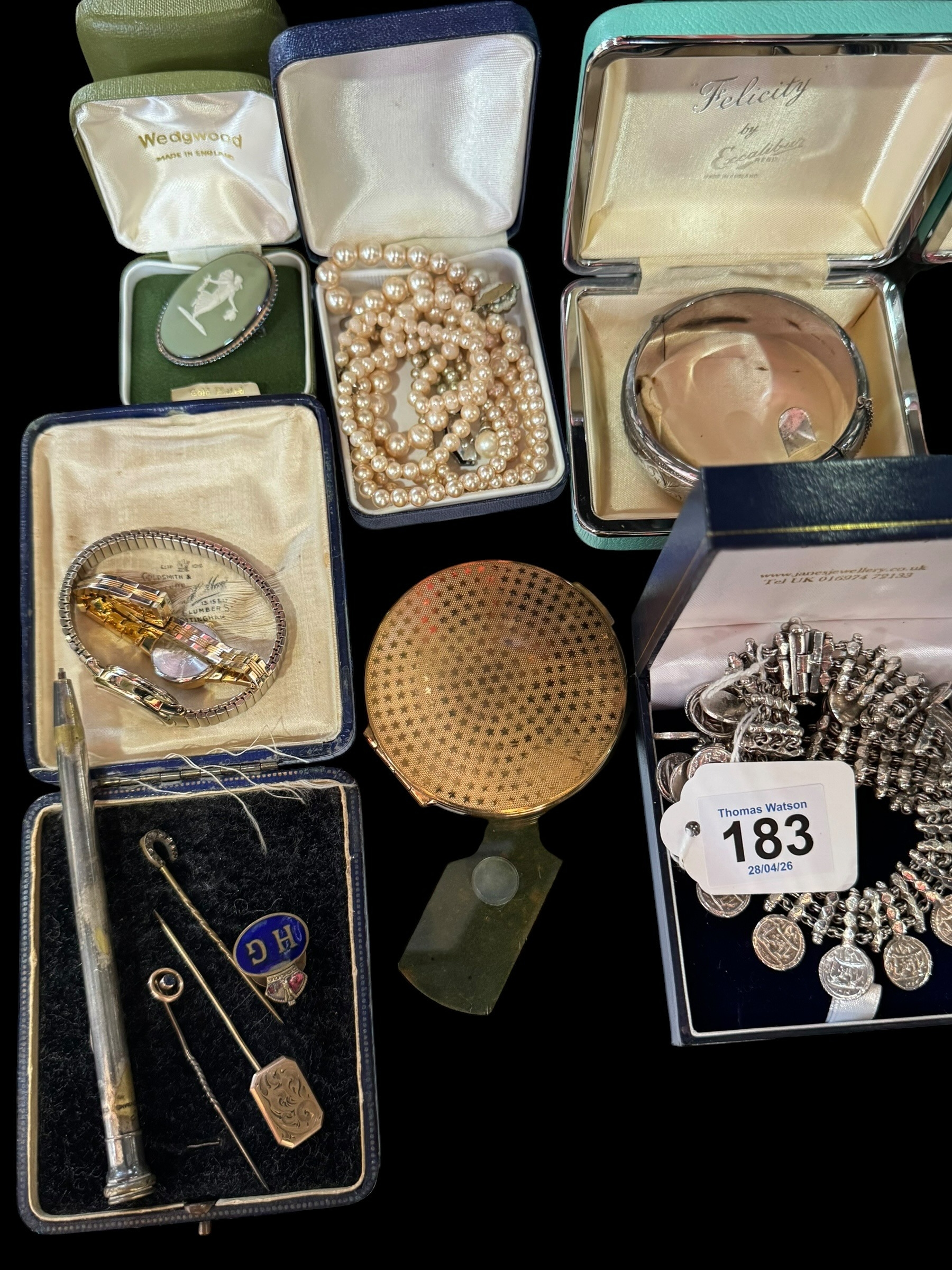 Silver necklace and bangle, two watches, stick pins, etc.