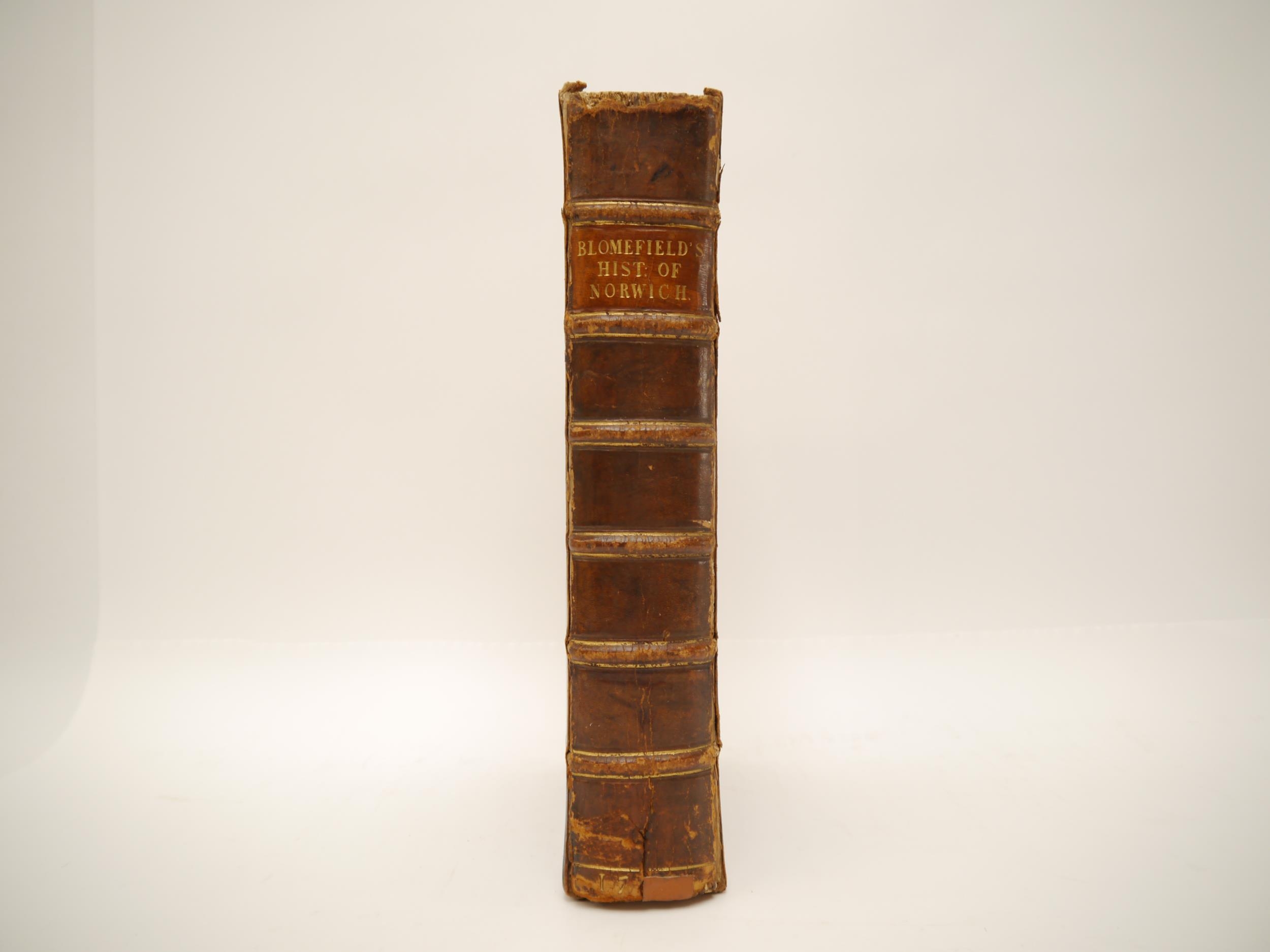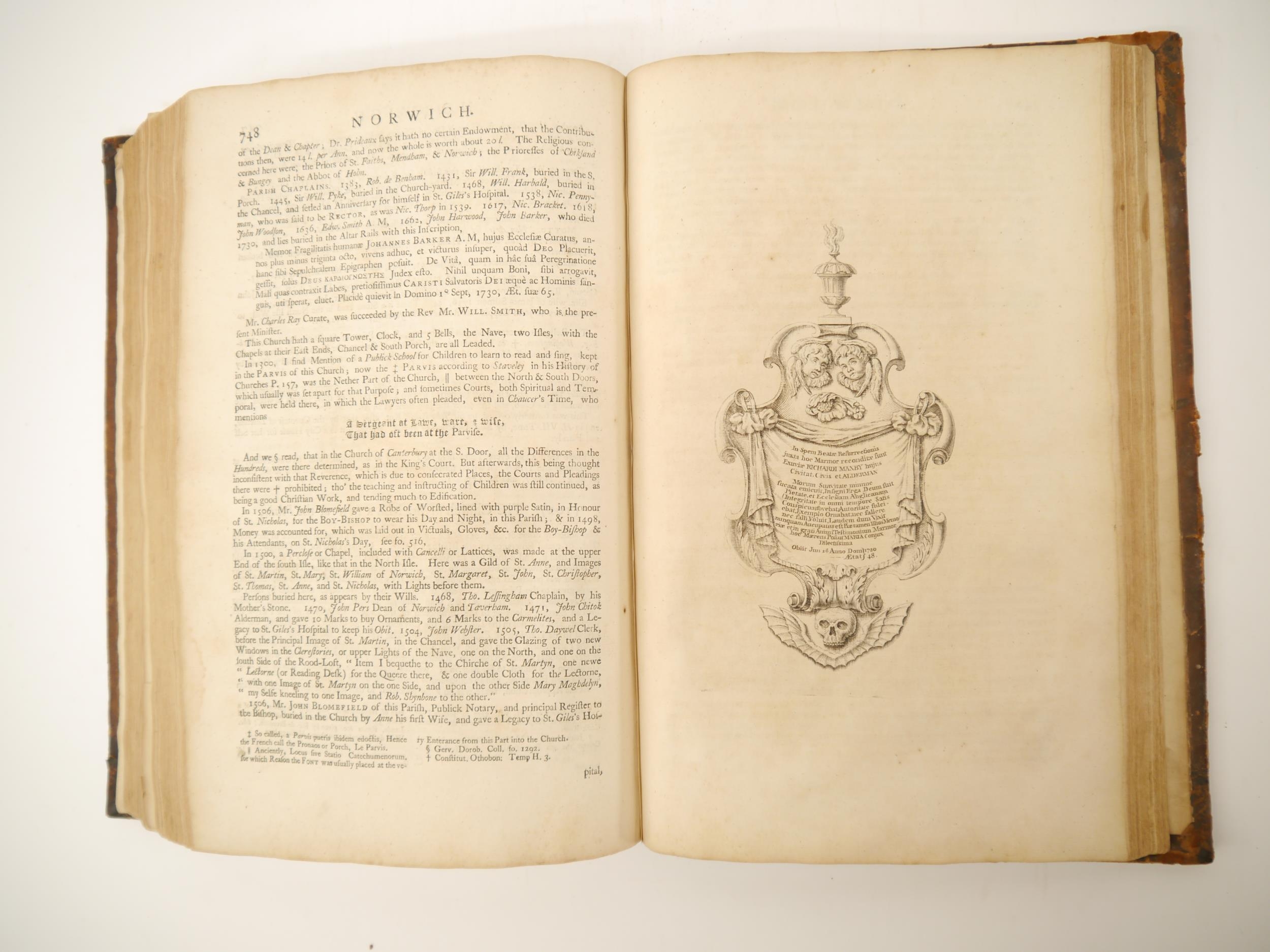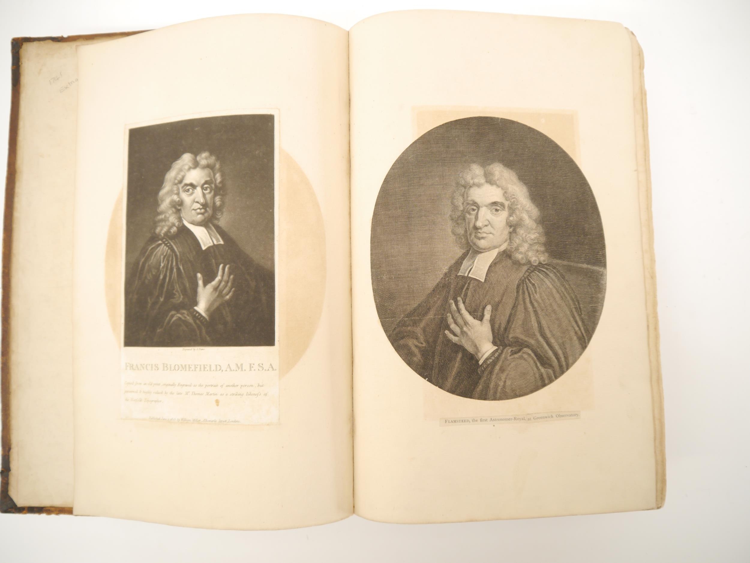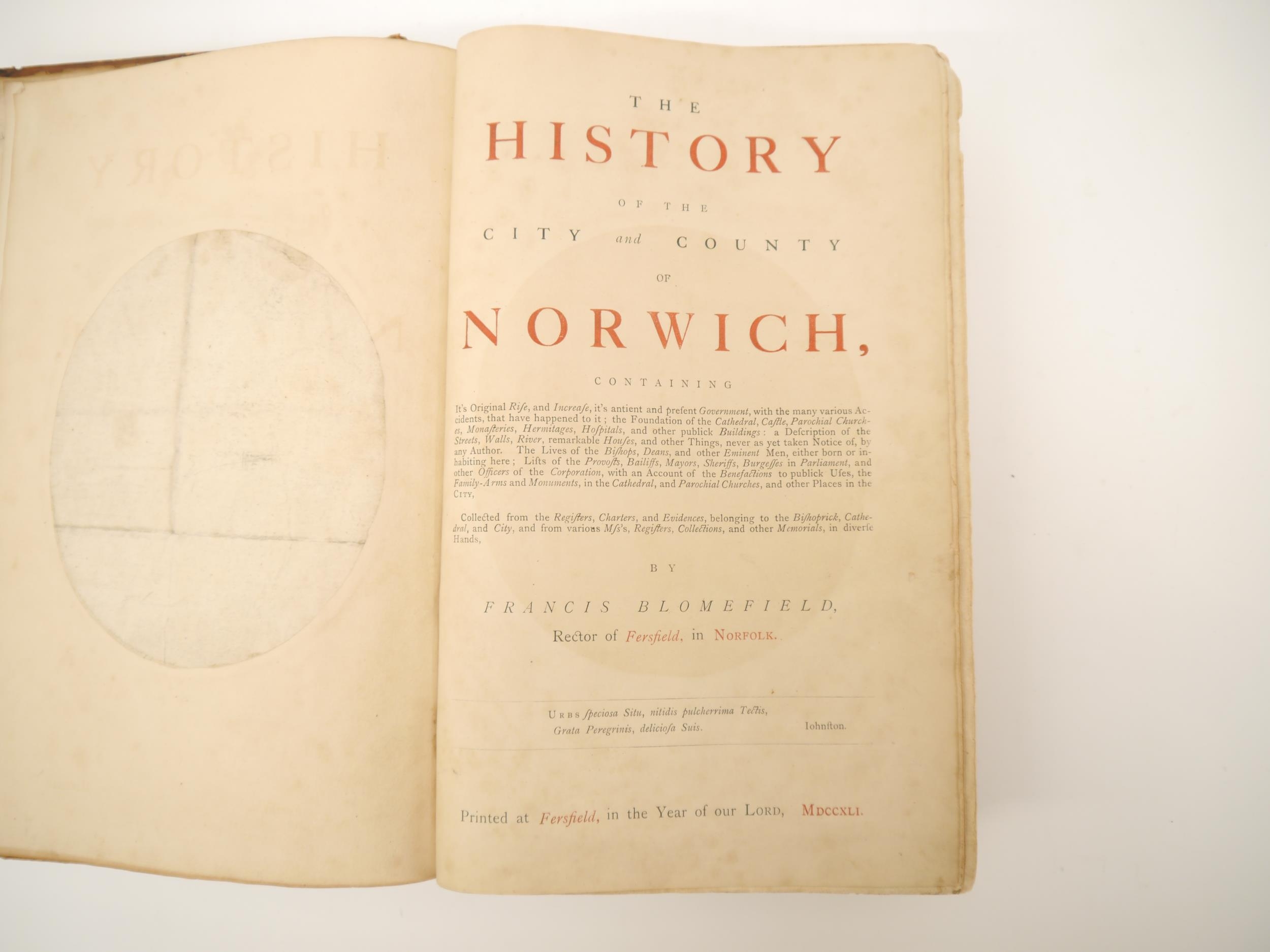 (Extra illustrated), Francis Blomefield: 'The History of the City and County of Norwich', Fersfield, 1741, engraved folding plan of Norwich + engraved plates as issued in the original work plus extra illustrated with numerous additional engraved portrait plates etc, 913pp, title page in red & black, folio, contemporary calf gilt, issued separately, but ordinarily forming volume 2 of Blomefield's 'An essay towards a topographical history of the county of Norfolk', 1739-75