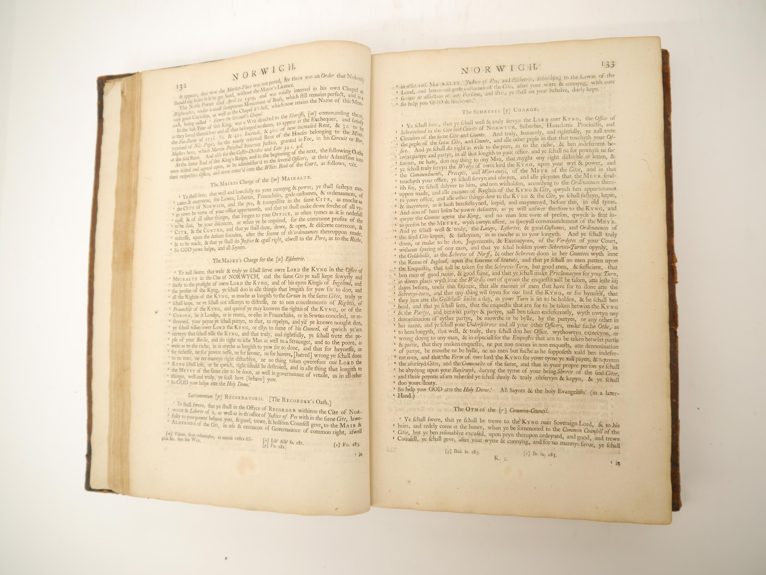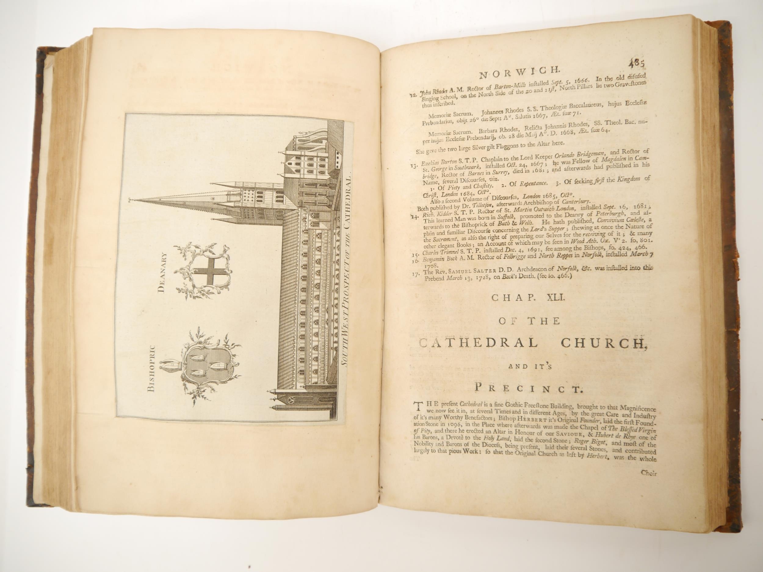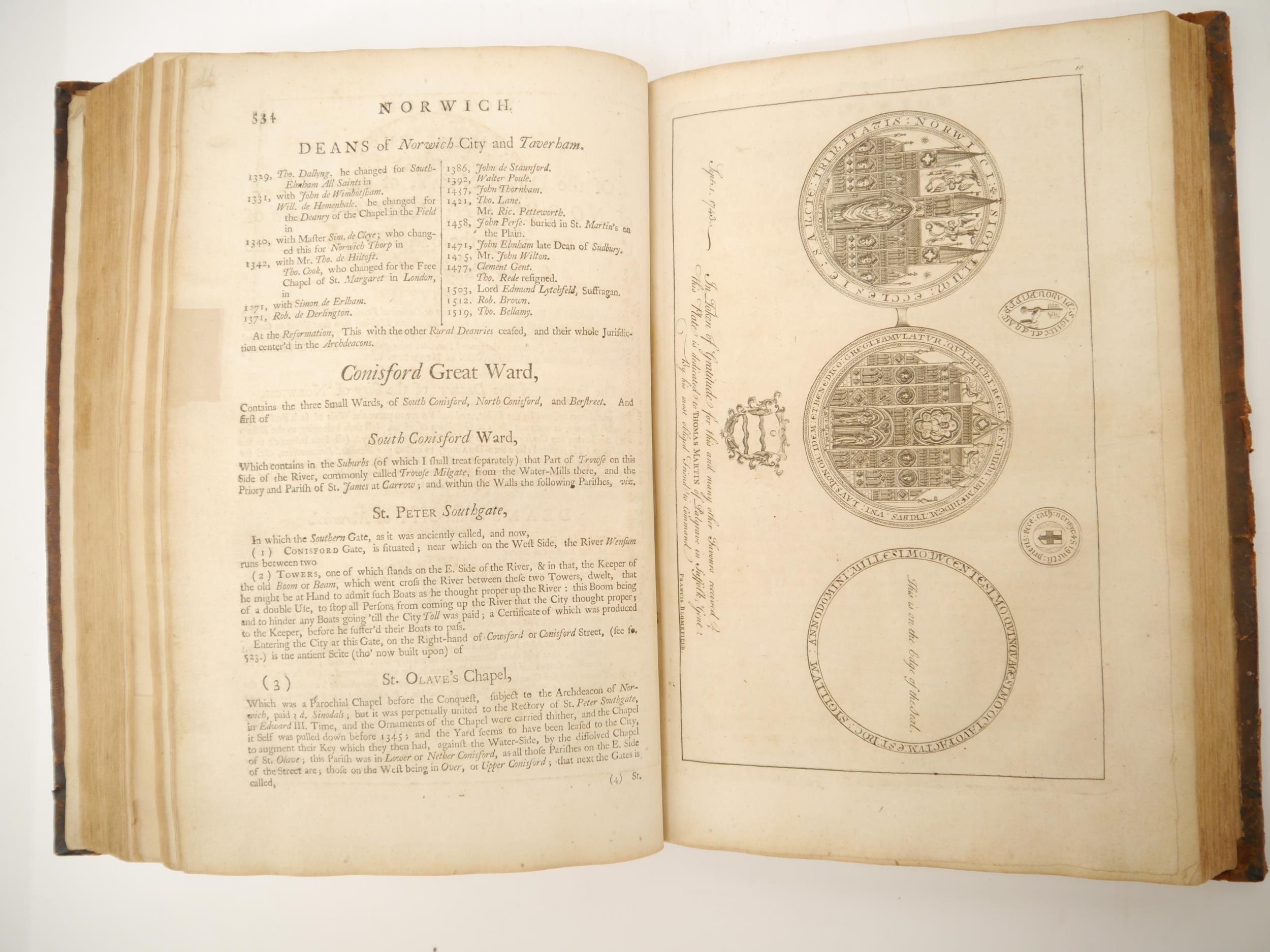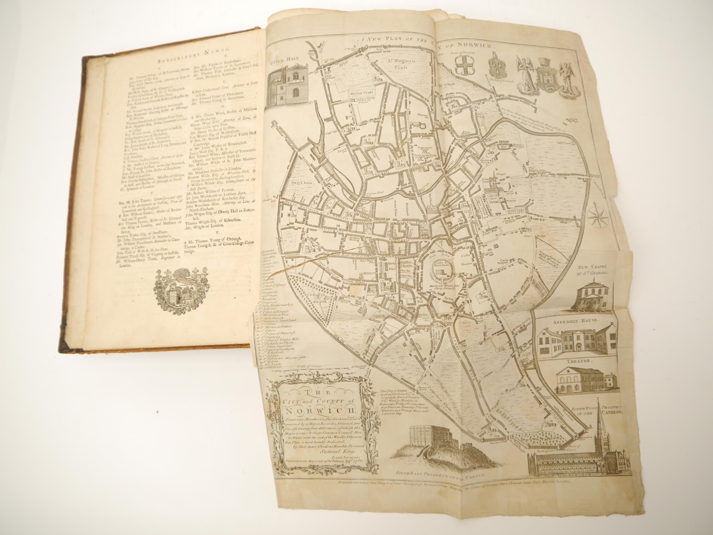 (Extra illustrated), Francis Blomefield: 'The History of the City and County of Norwich', Fersfield, 1741, engraved folding plan of Norwich + engraved plates as issued in the original work plus extra illustrated with numerous additional engraved portrait plates etc, 913pp, title page in red & black, folio, contemporary calf gilt, issued separately, but ordinarily forming volume 2 of Blomefield's 'An essay towards a topographical history of the county of Norfolk', 1739-75