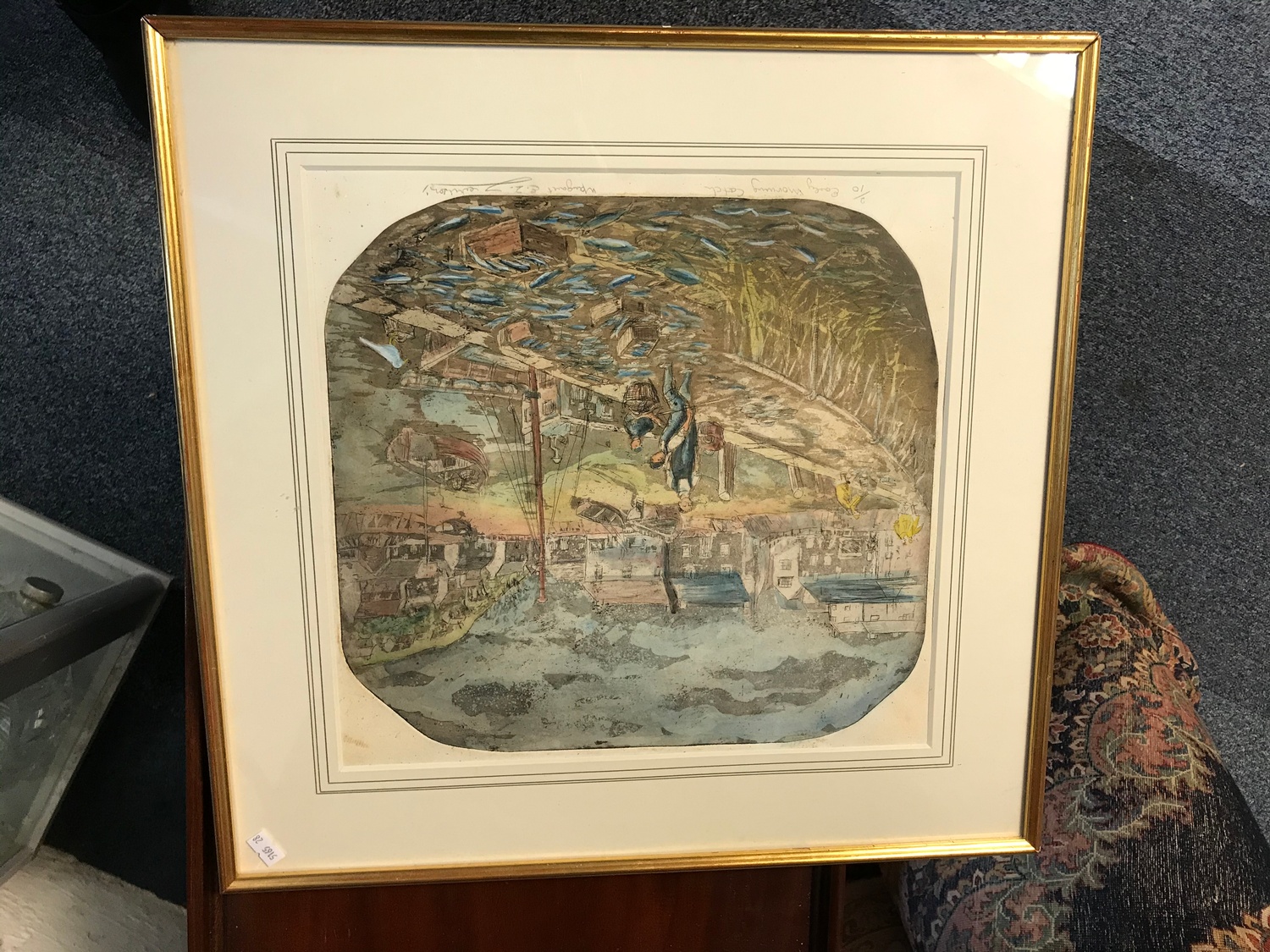 Assorted framed works, to include study of Stonehenge and print of fishermen -