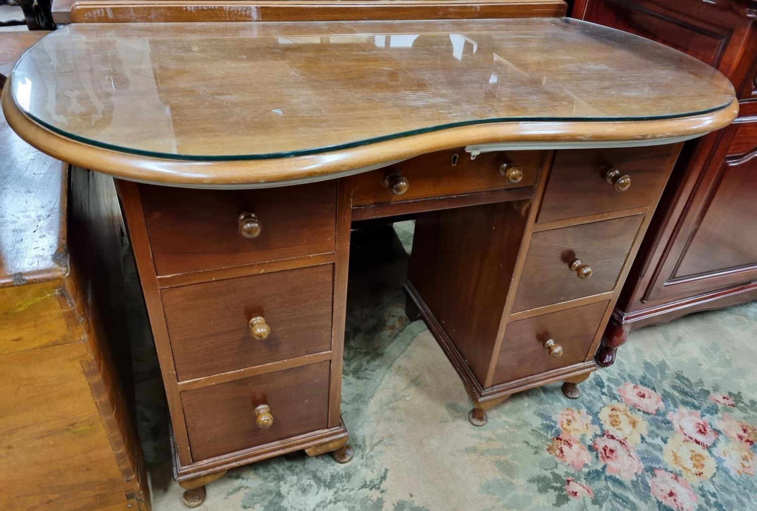 A Mahogany Desk with kidney shaped top over an arrangement of seven frieze drawers raised on squat cabriole feet. 112 x 52 x H 75 cm approx.