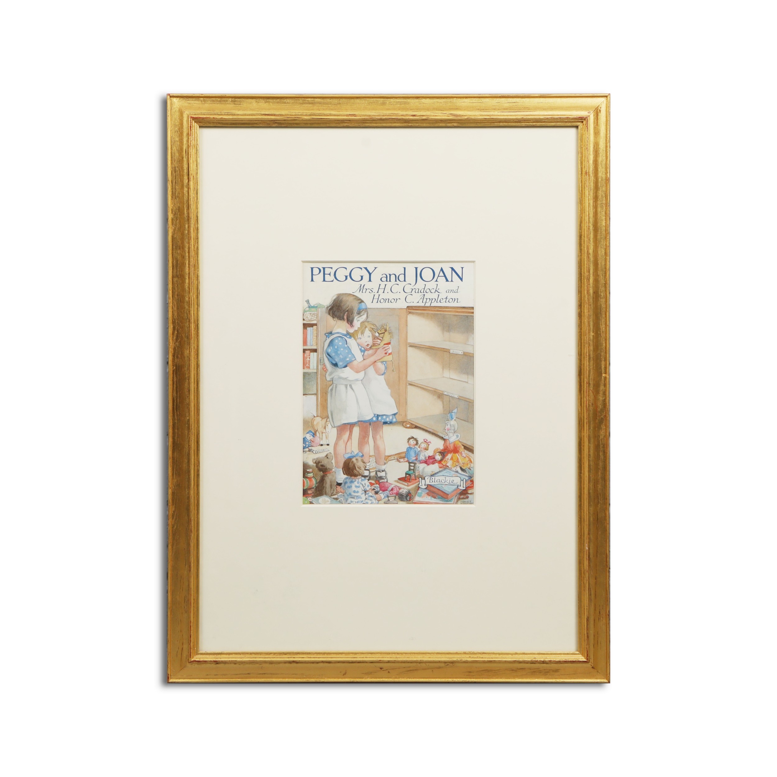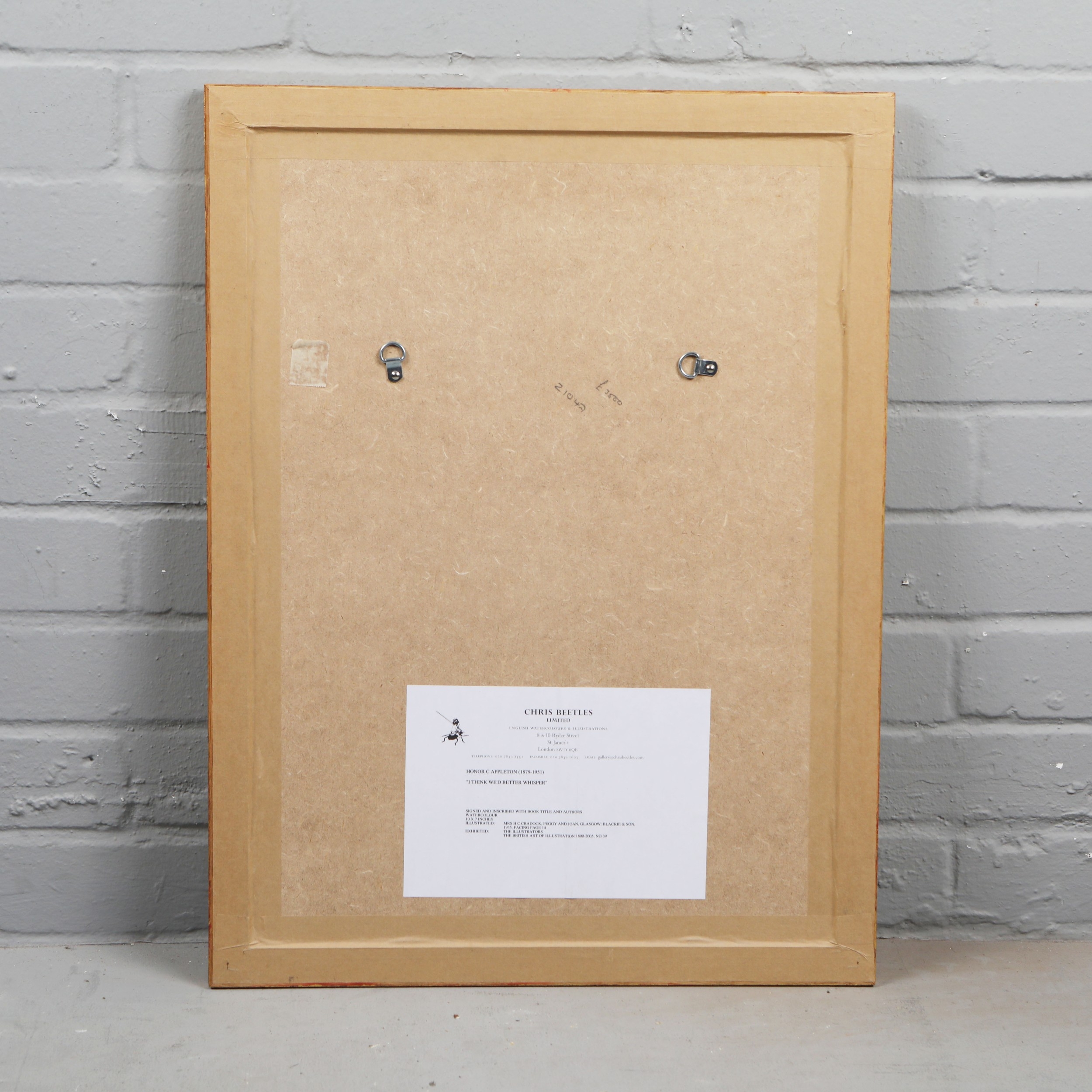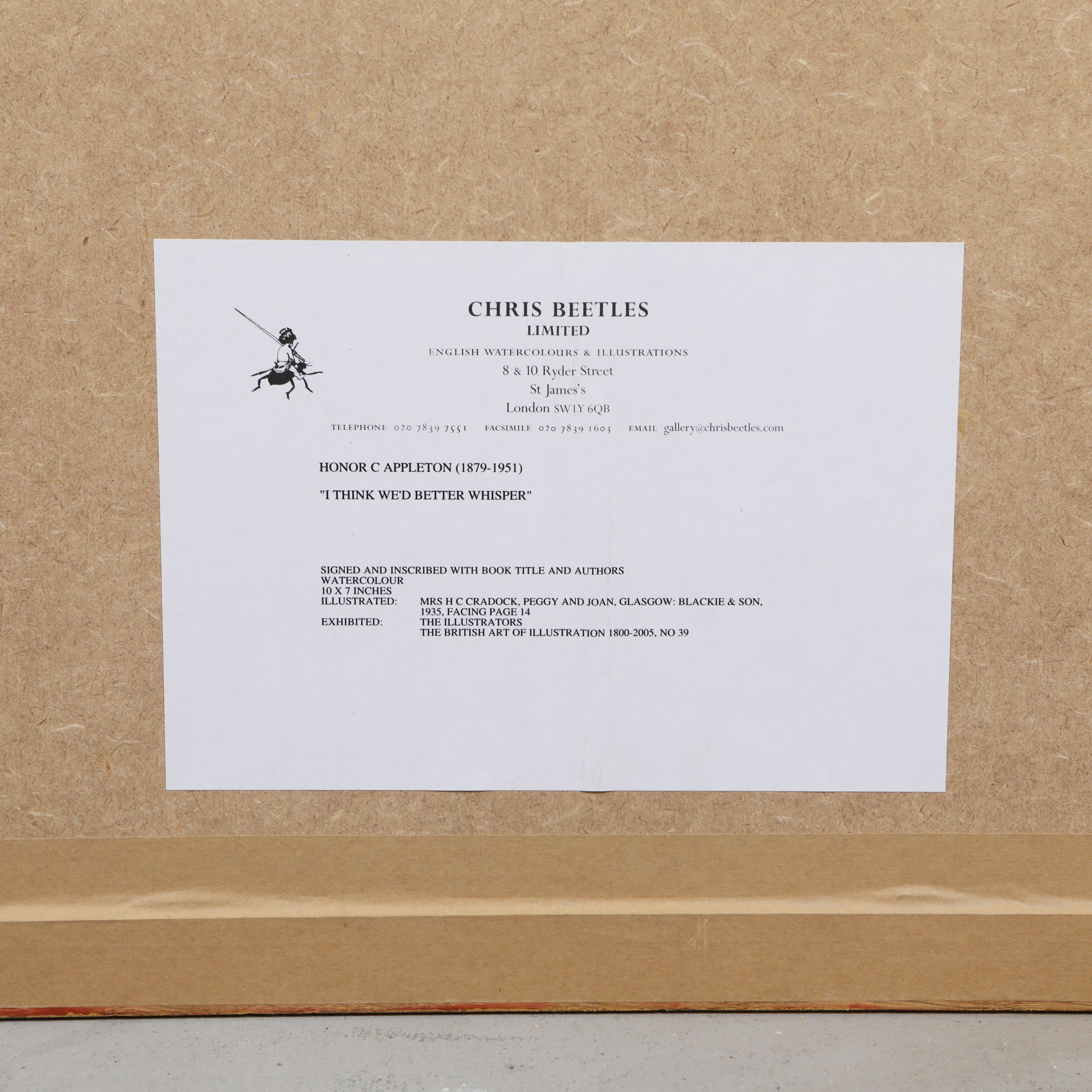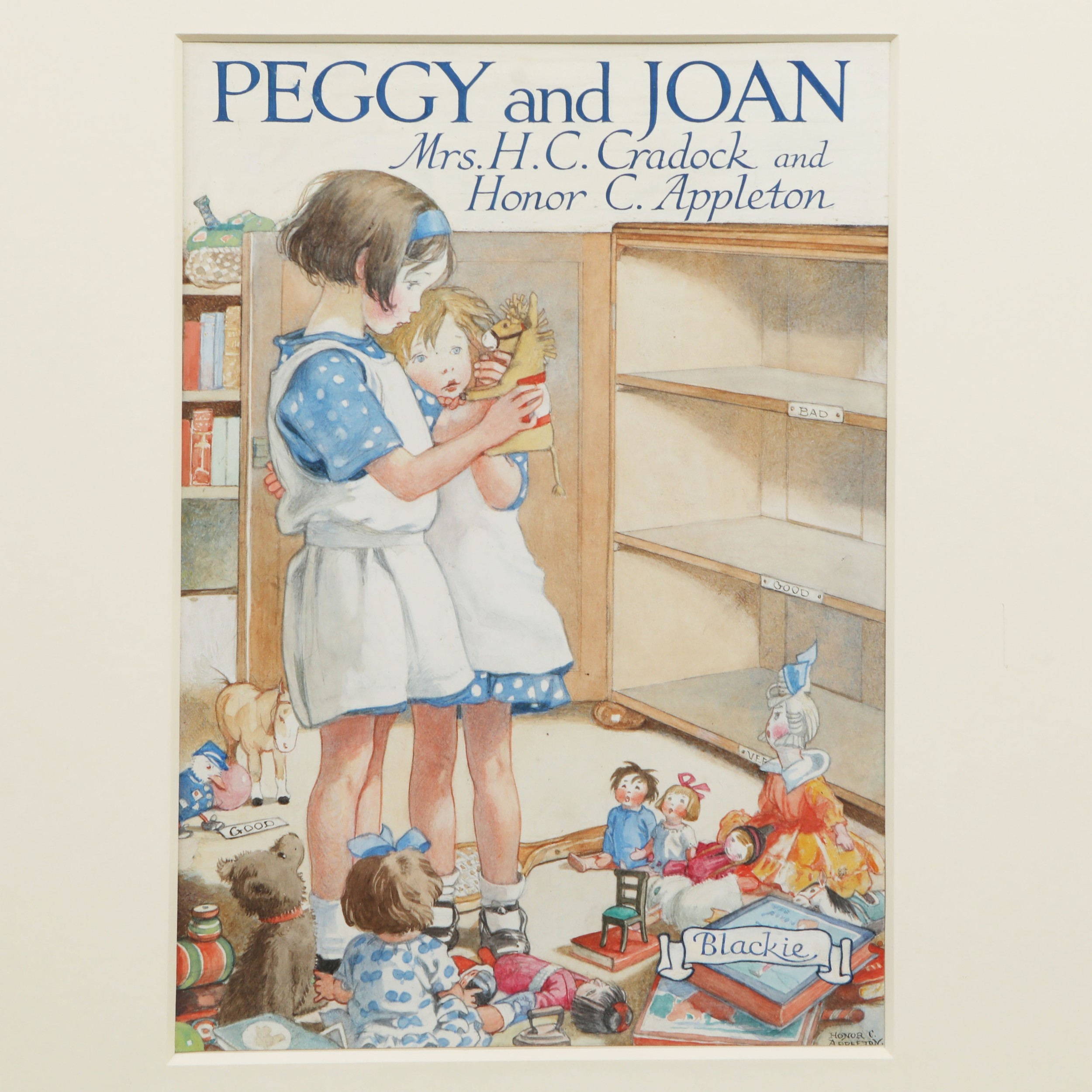 HONOR C APPLETON (1879-1951). 'I THINK WE'D BETTER WHISPER'. ink and watercolour drawing, 1935, signed lower right 'HONOR C. APPLETON', mounted, framed and glazed, 25.5 CM H x 18 cm W (61.5 cm H x 46 cm W, framed) Gallery sticker on verso Provenance: Chris Beetles Limited, The British Art of Illustration 1800-2005, number 39 Purchased by the present owner in 2005 from Chris Beetles Gallery Illustrated: Mrs H C Cradock, Peggy and Joan, Glasgow: Blackie & Son, 1935, Facing Page 14 Exhibited: The Illustrators, The British Art of Illustration 1800-2005, No 39.