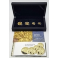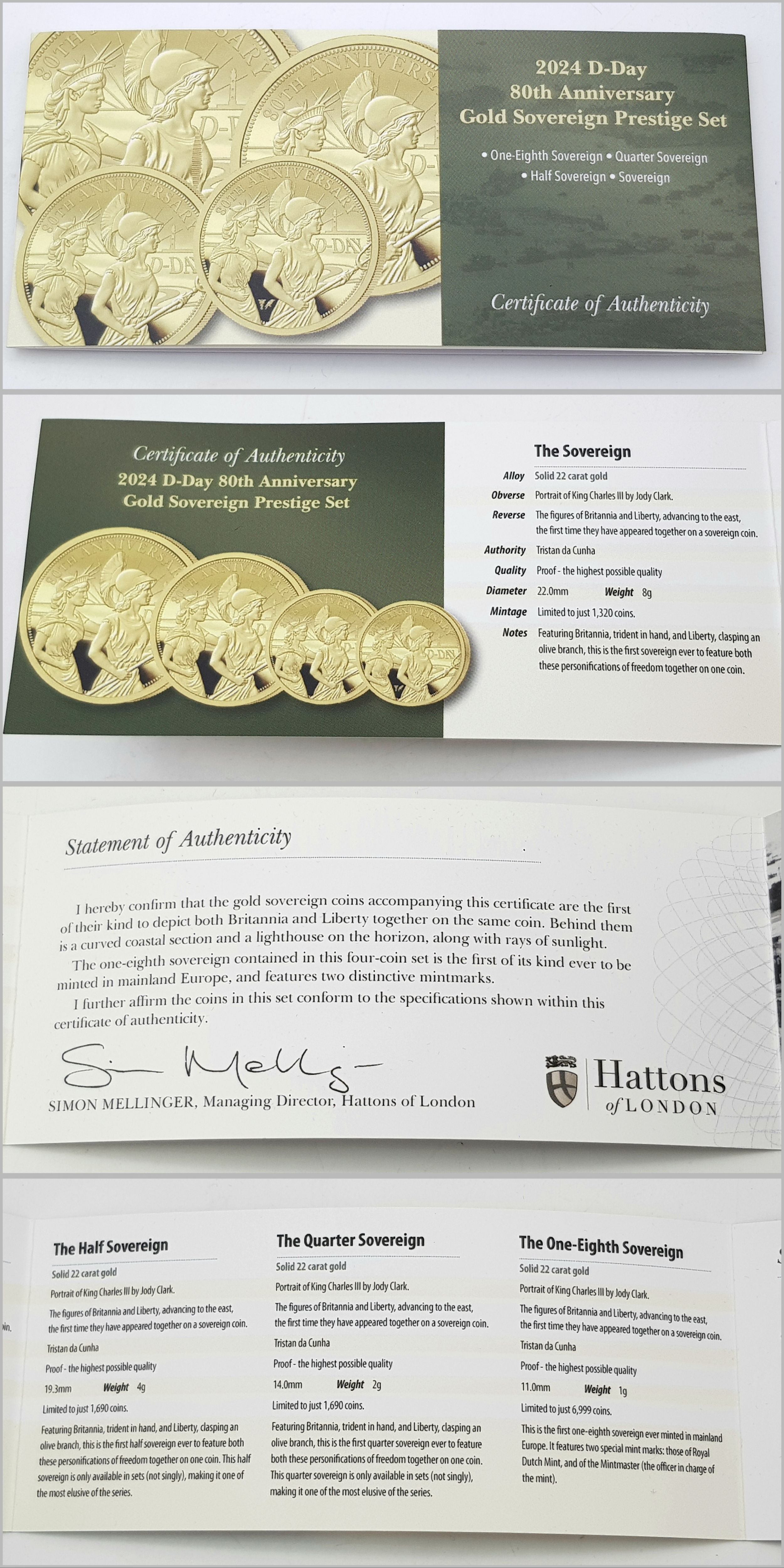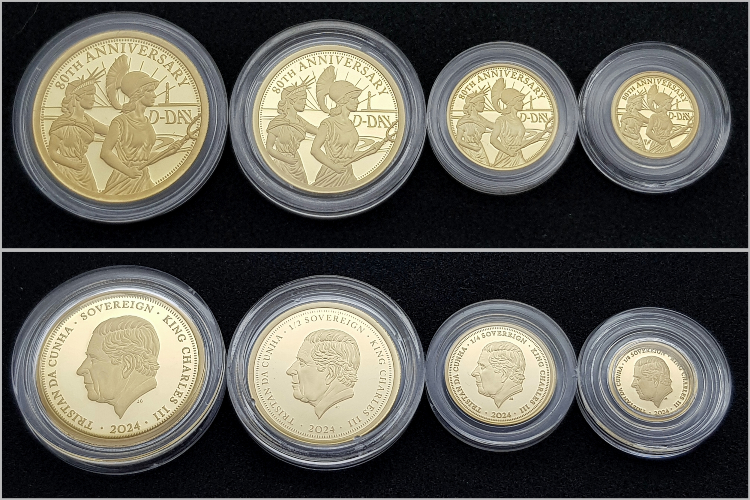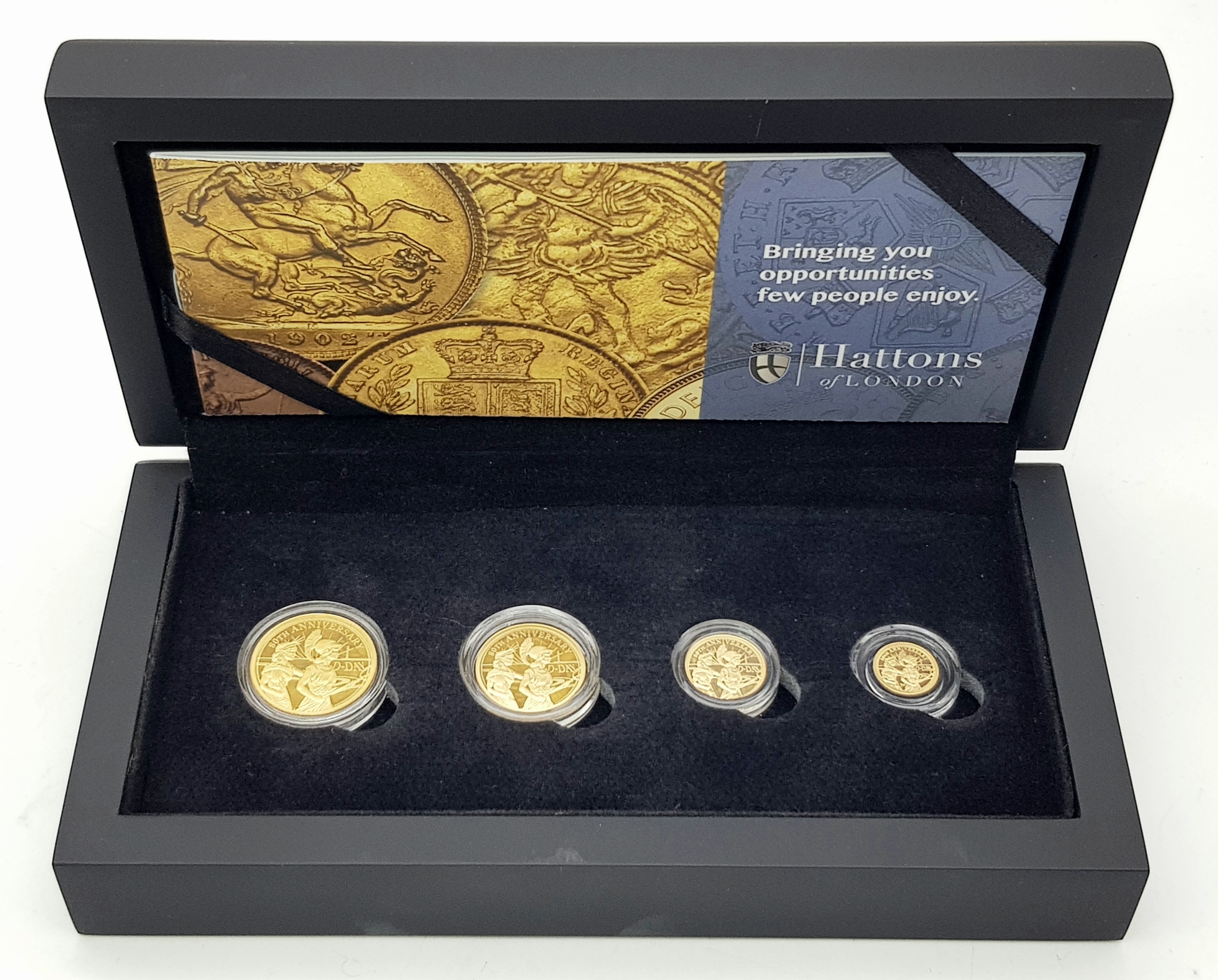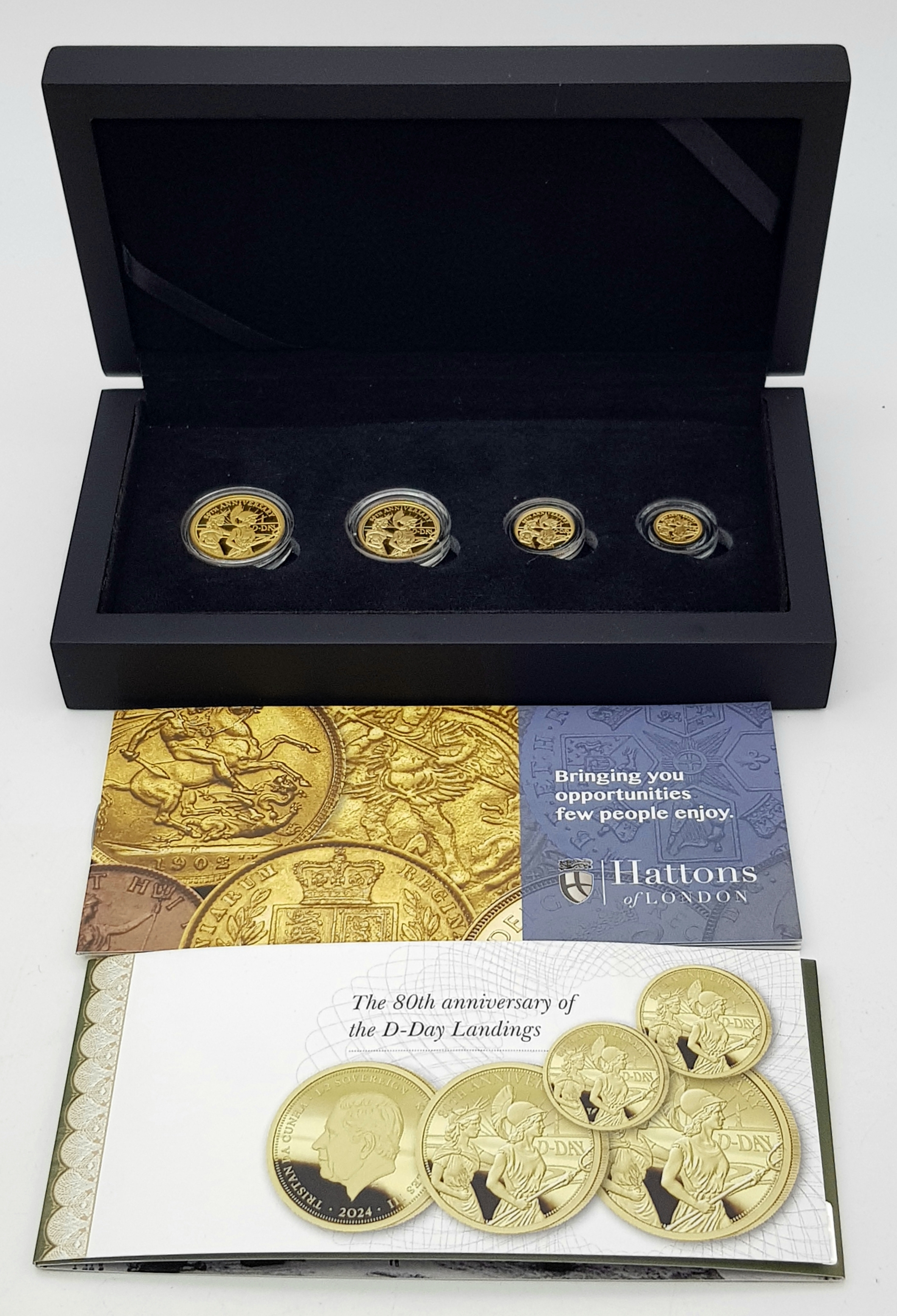 A Hattons of London Commemorative 22k Gold Proof Sovereign Set - 80th Anniversary of D-Day. Full, half, quarter and one eighth sovereign coins. Limited editions. 15g total weight. Comes with a certificate of authenticity and presentation case.
