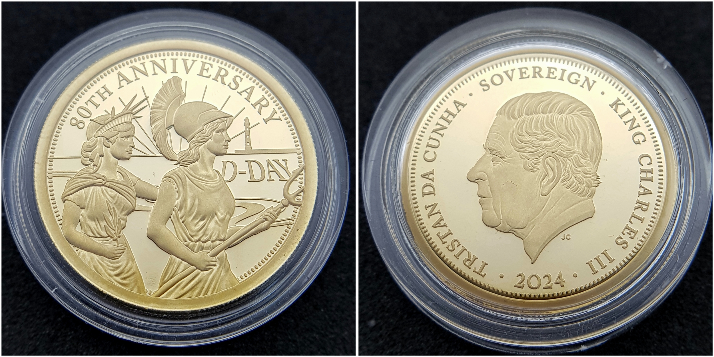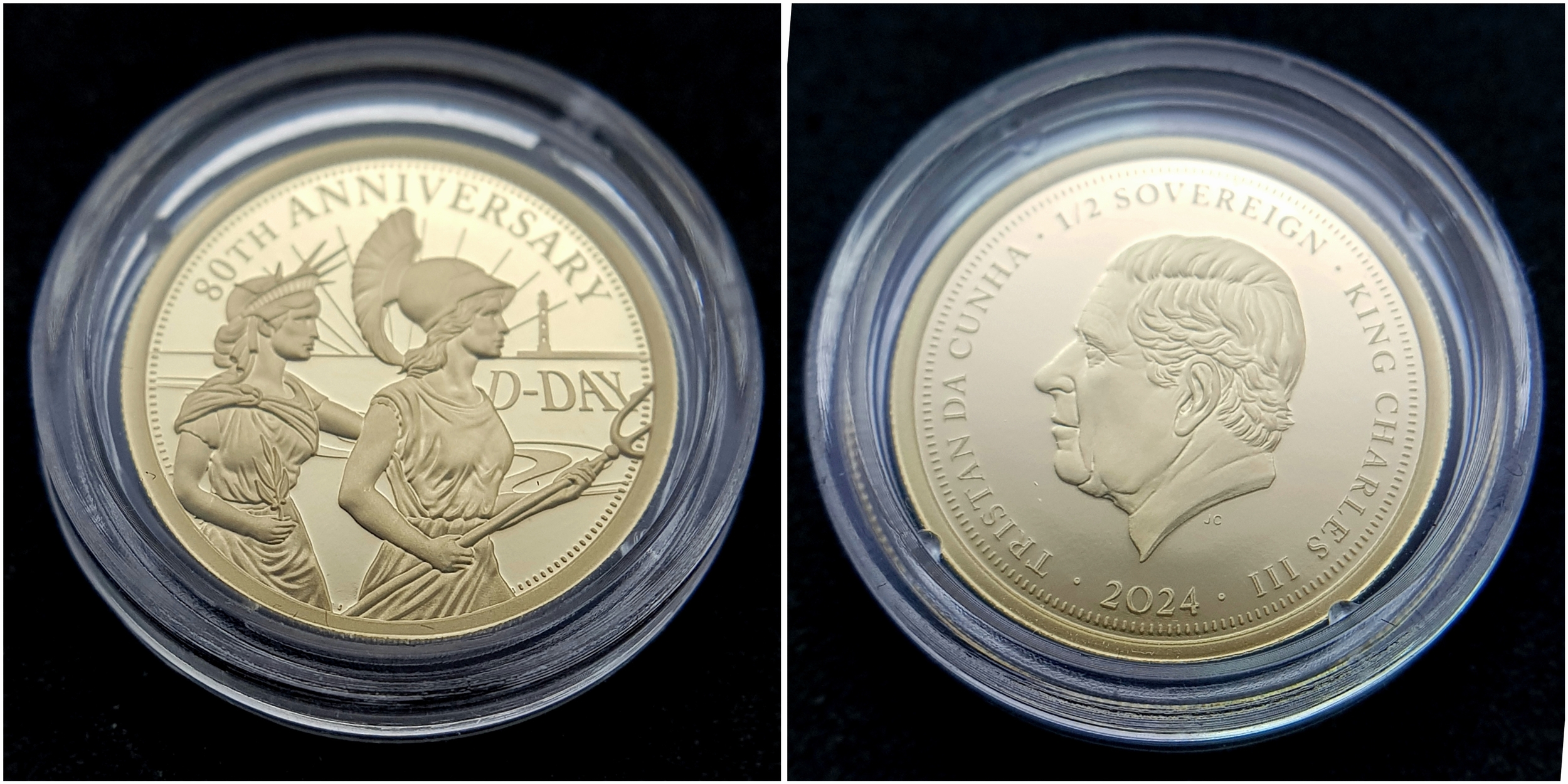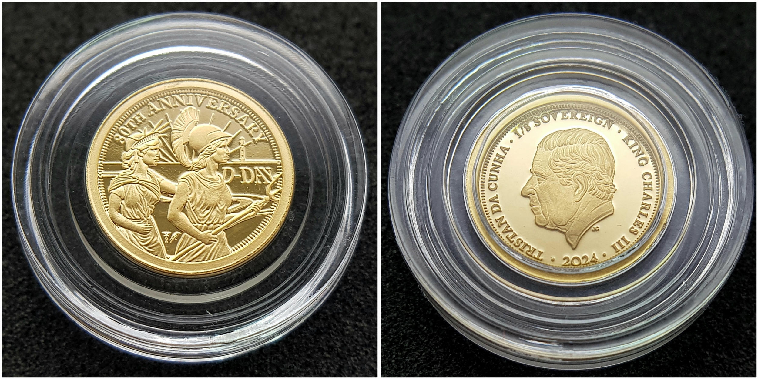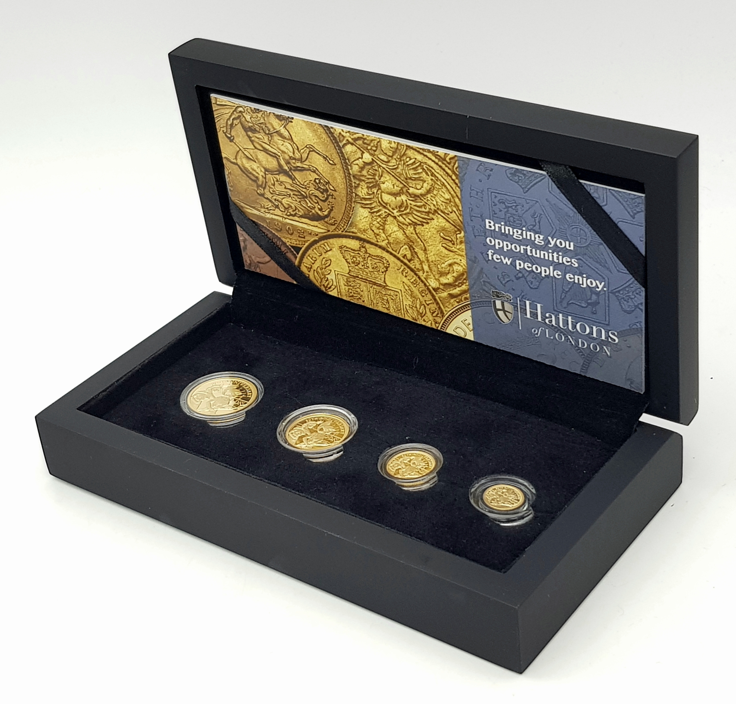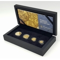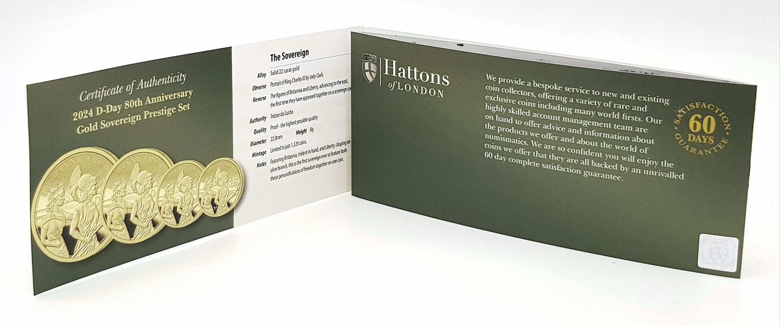 A Hattons of London Commemorative 22k Gold Proof Sovereign Set - 80th Anniversary of D-Day. Full, half, quarter and one eighth sovereign coins. Limited editions. 15g total weight. Comes with a certificate of authenticity and presentation case.