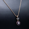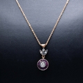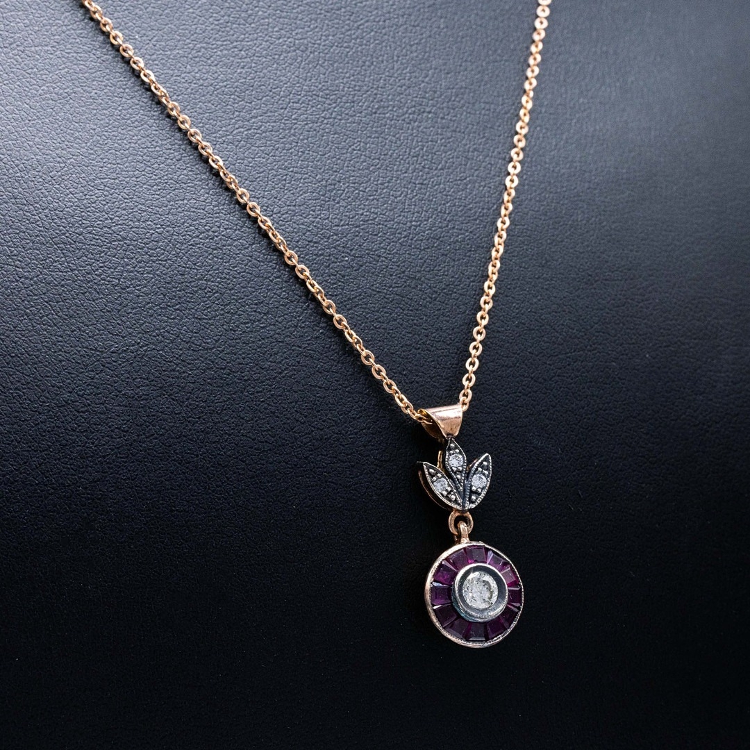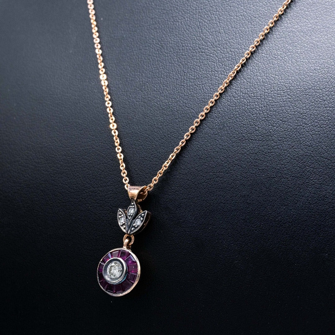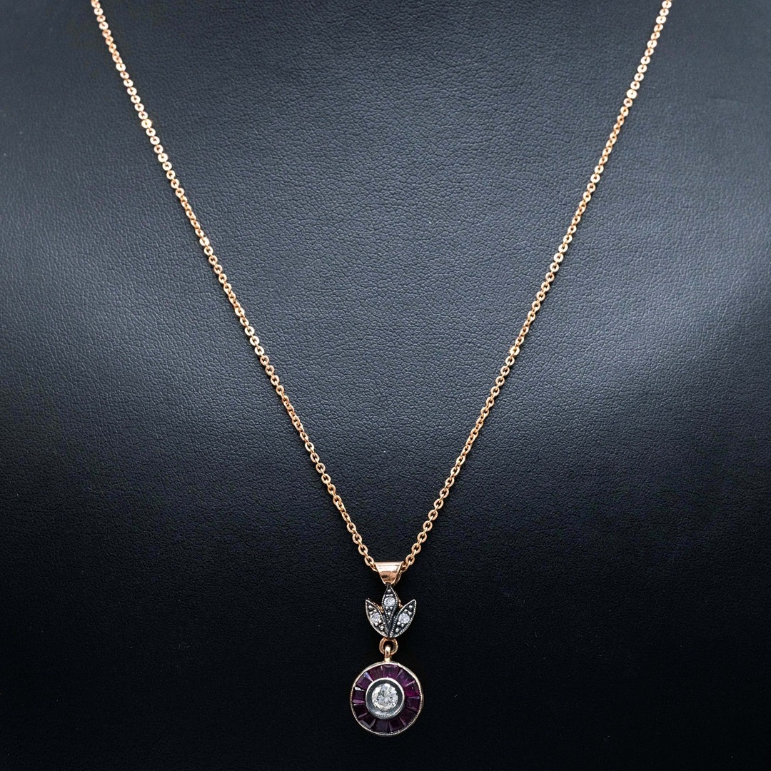 AN 8CT RUBY AND DIAMOND PENDANT NECKLACE. the target style pendant with floral bale, set with round brilliant cut diamonds and calibre-cut rubies on rose gold-plated silver chain, Diamonds 0.30ct approx. Rubies 0.28ct approx, complete with box.