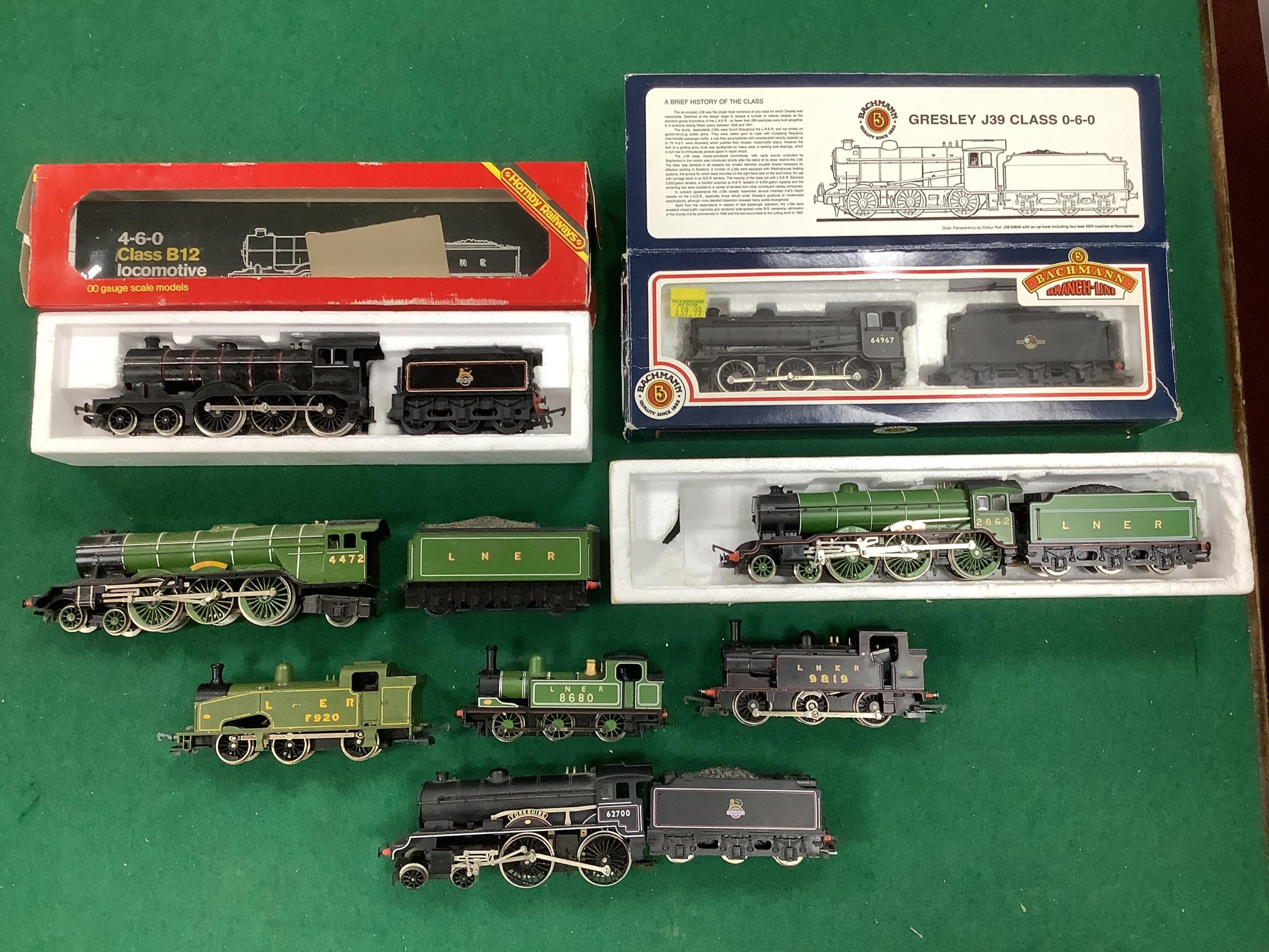 Eight 00 gauge LNER locomotives including a boxed Bachmann J39 in BR black; a boxed Hornby B12 (appears repainted); a Hornby Hunt Class 4-4-0 in BR black, a Hornby B17 "Manchester United" in LNER Green, a Hornby Flying Scotsman in LNER Green and three 0-6-0 tank engines, all locomotives playworn and untested.