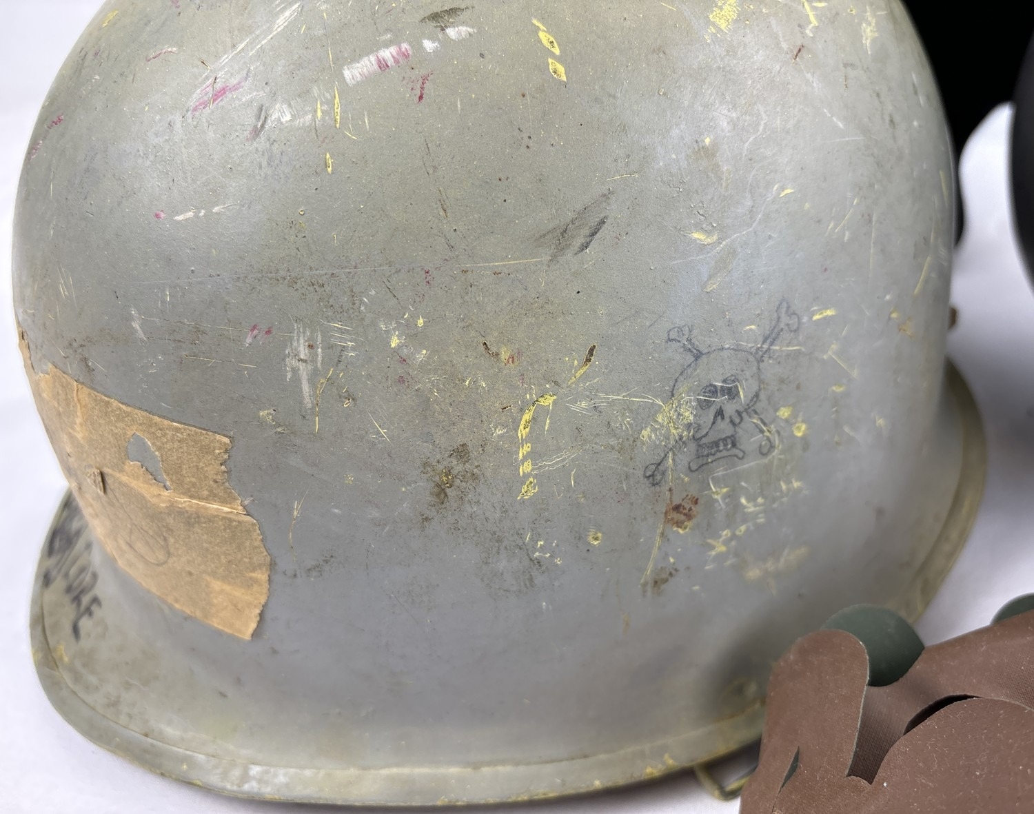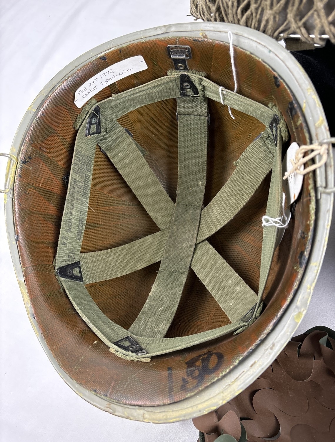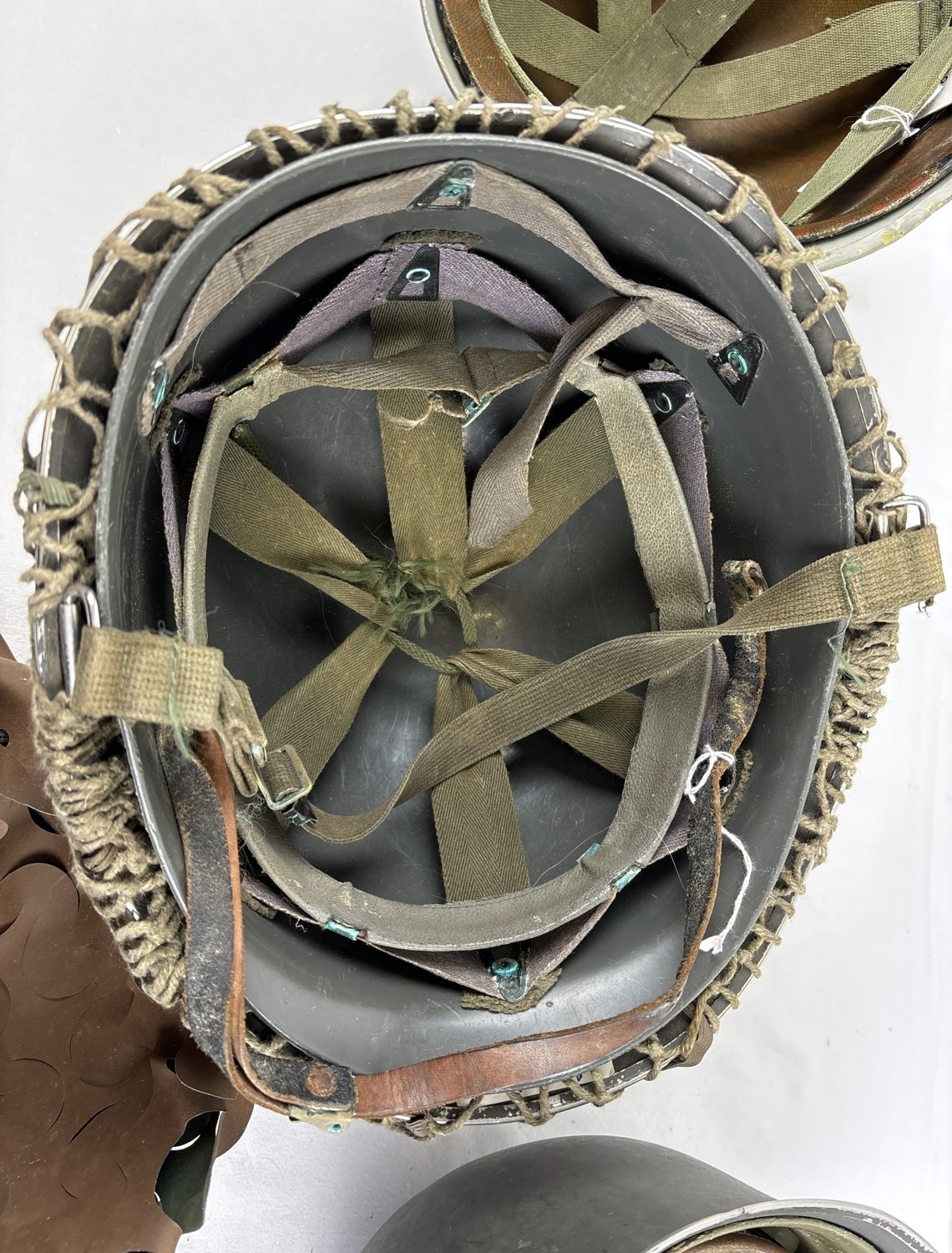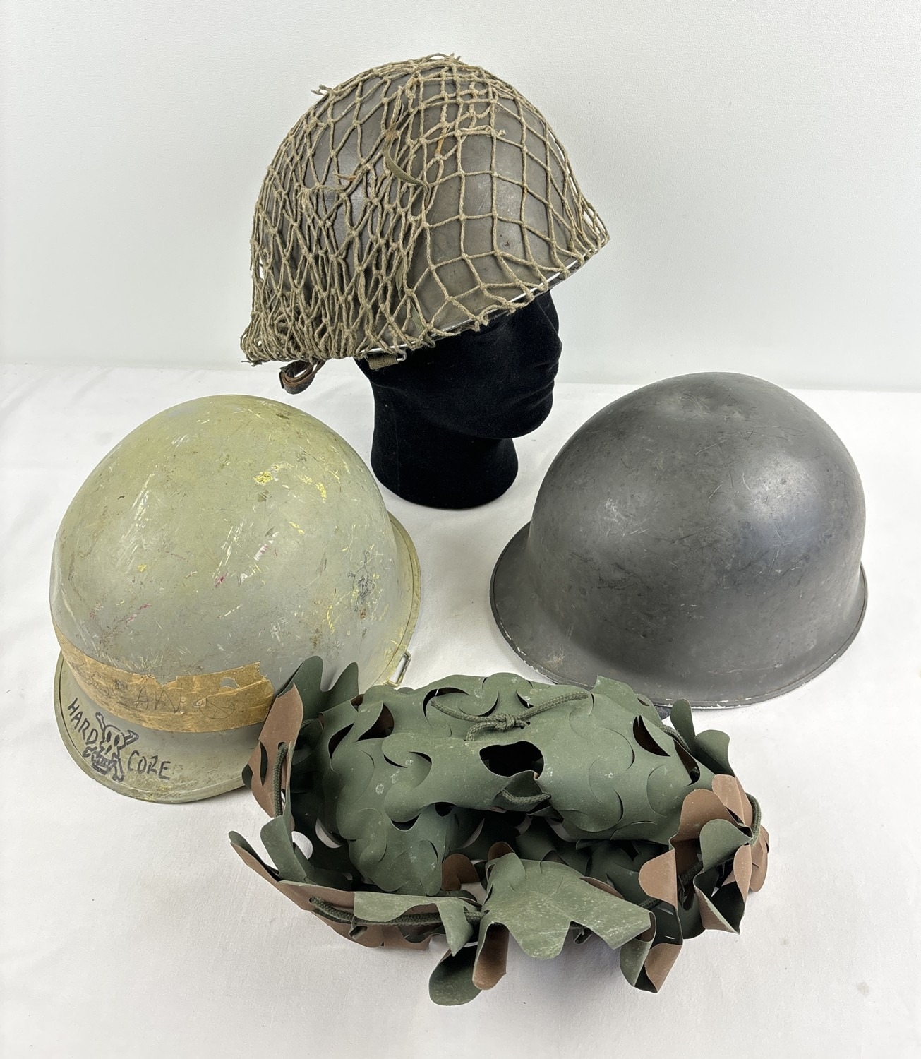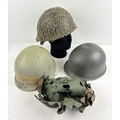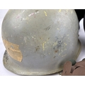 3 post WWII helmets. A US Navy M1 steel helmet complete with plastic liner dated 1972. The helmet body is WW2 front seam c.1943-44 and painted blue/grey with rank marking for Fire Controlman Petty Officer 3rd Class. Wearer’s name Bogan. NB various Vietnam War graffiti including skull and crossbones. Excellent condition; with US M1 clone Austrian M58 Type 2 steel helmet, US style, with US style plastic liner but with leather inner cradle. Painted field grey. With original scrim camouflage cover; and US M1 clone Austrian NATO Cold War era M1 style helmet pattern M58, complete with liner dated 1971, helmet chinstrap, liner chinstrap and correct original net. Excellent paint finish.