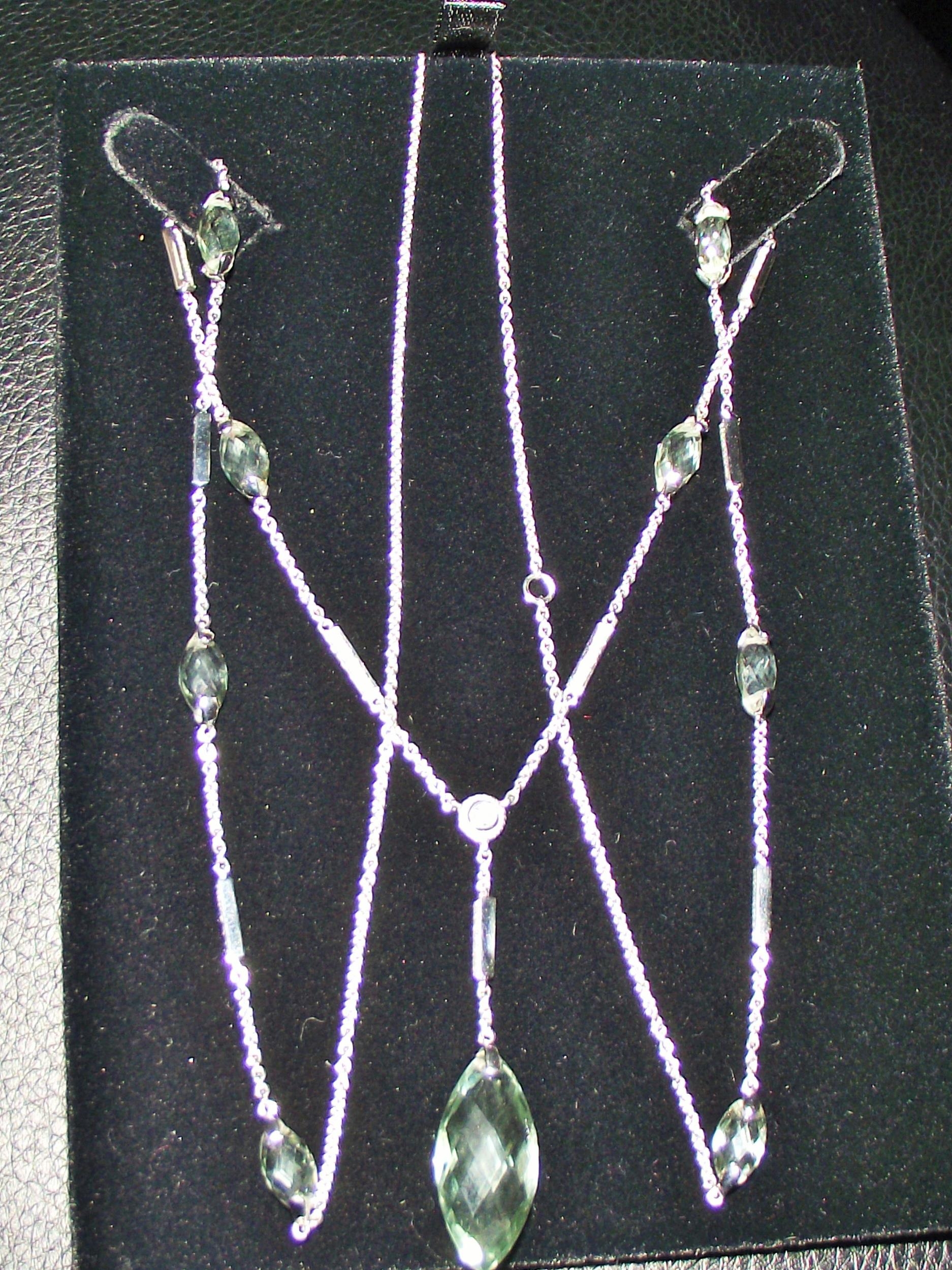 Unusual Quality 18ct white Gold diamond neck chain 16" approx set with faceted green amathyst style stone seperated with diamond set bars with a central round diamond above a larger green faceted amathyst style drop fully marked Birmingham 2011 12.7g approx