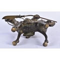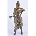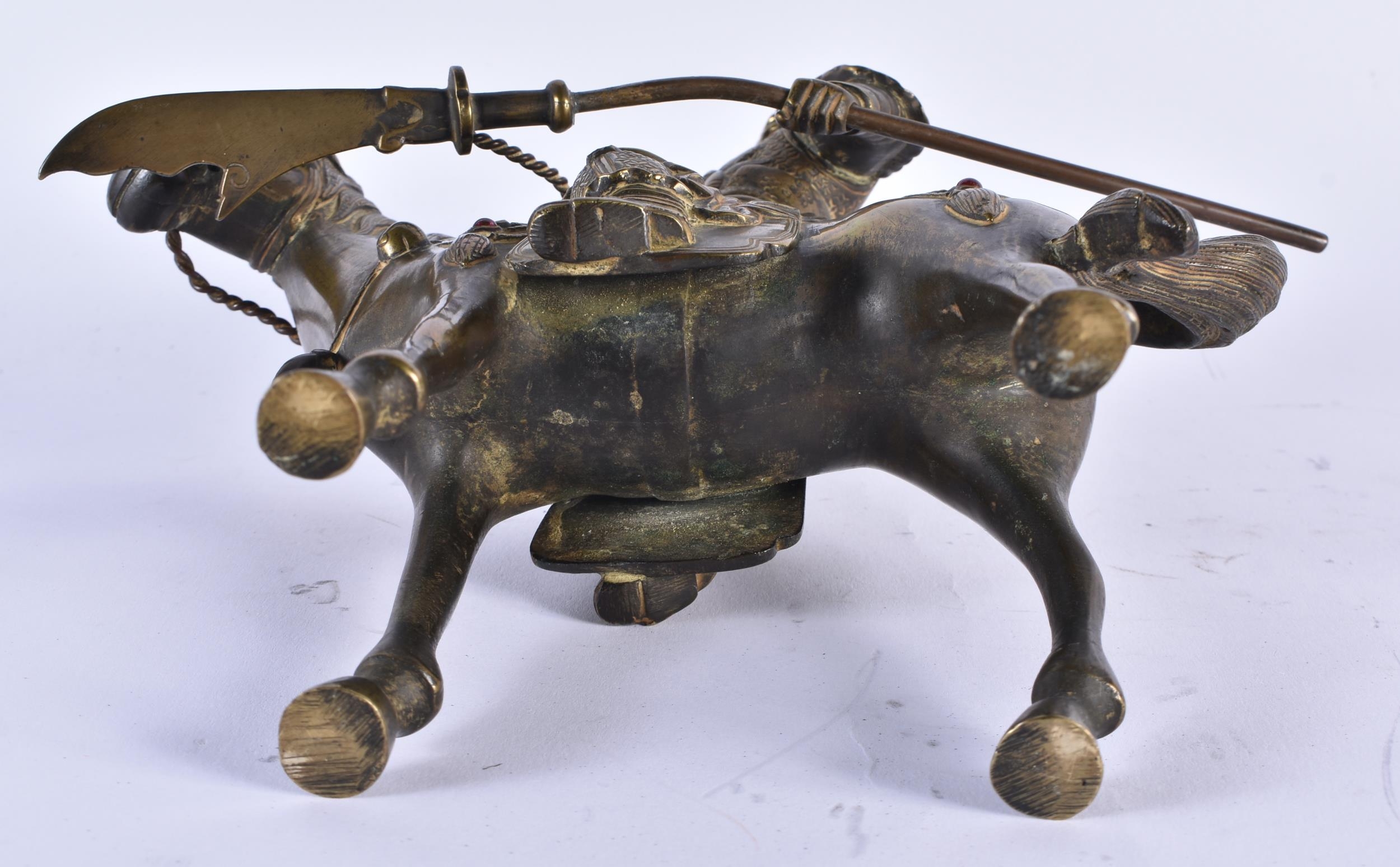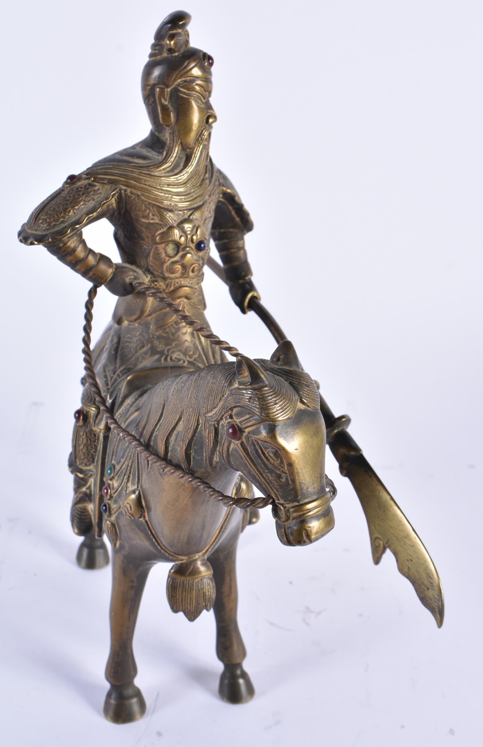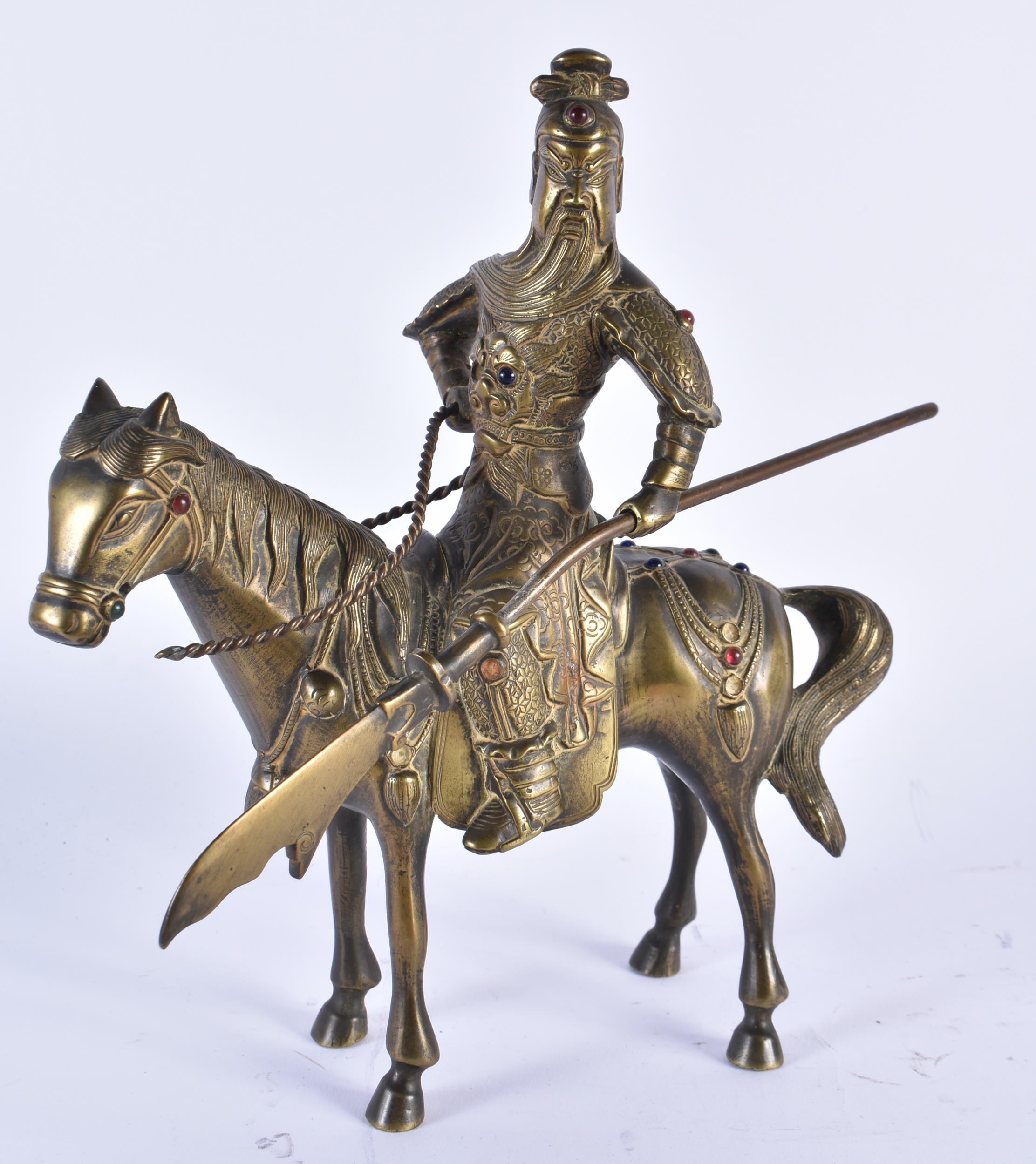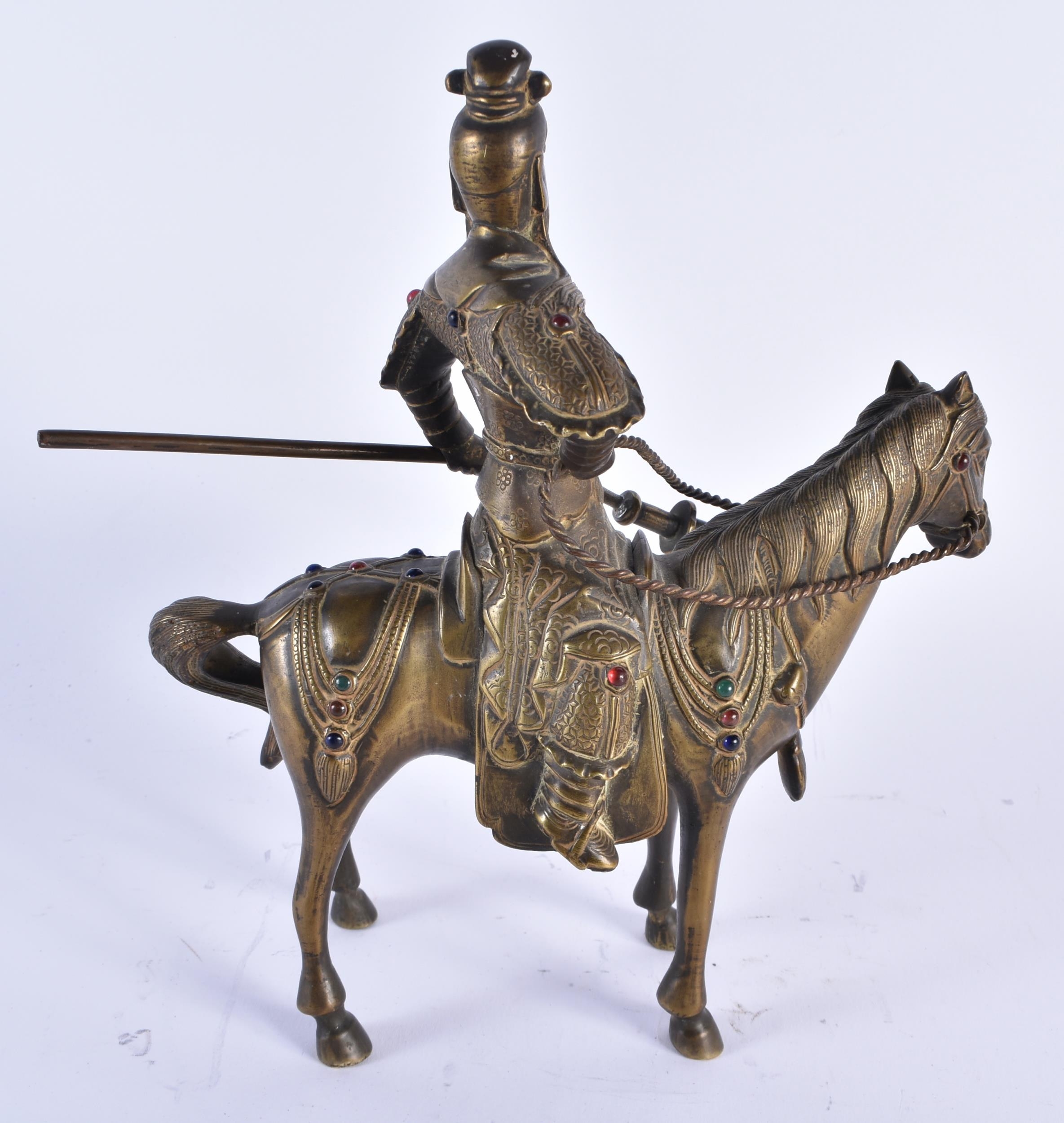 A CHINESE QING DYNASTY BRONZE FIGURE OF A WARRIOR ON HORSEBACK inset with gems, embellished in motifs. 24 cm x 20 cm.