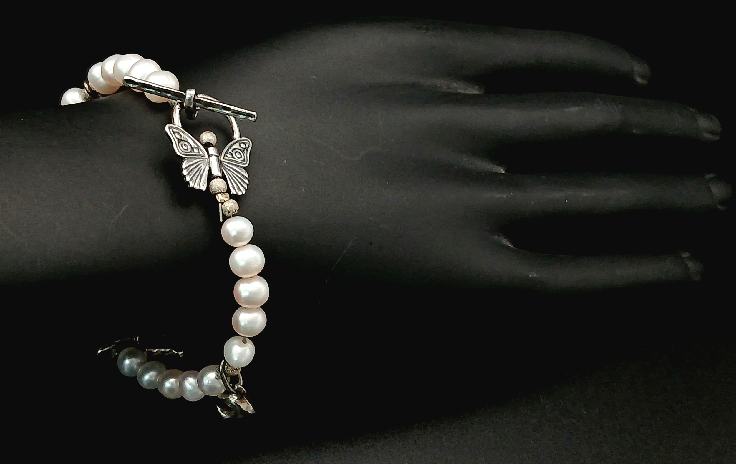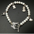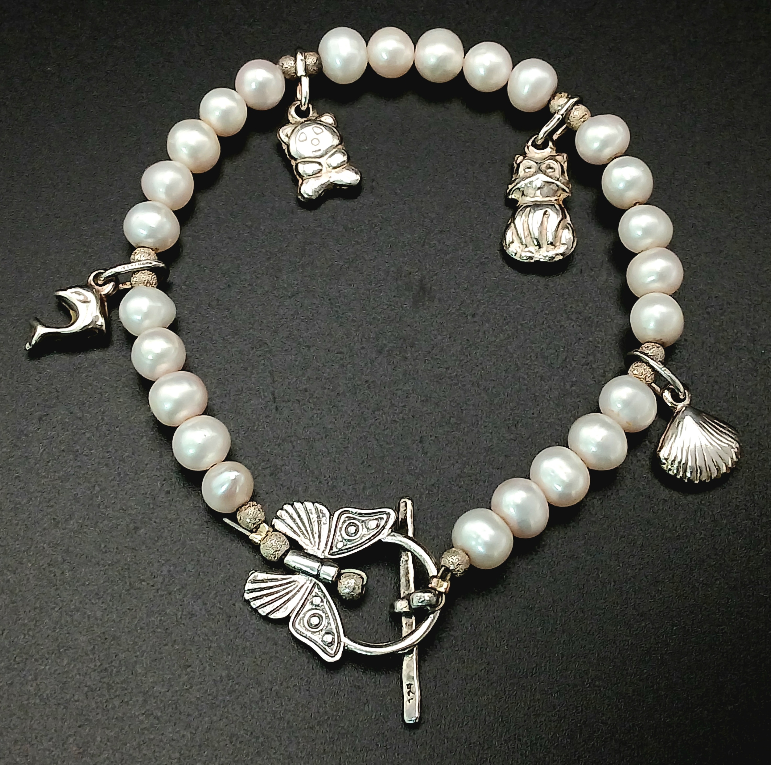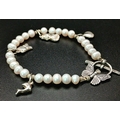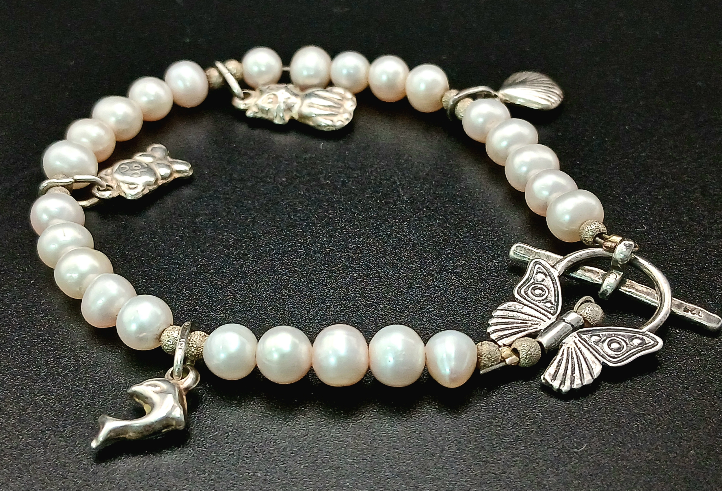 A pretty 925 silver charm and freshwater pearl bracelet. Approx 17cm length. Please see photos for details.