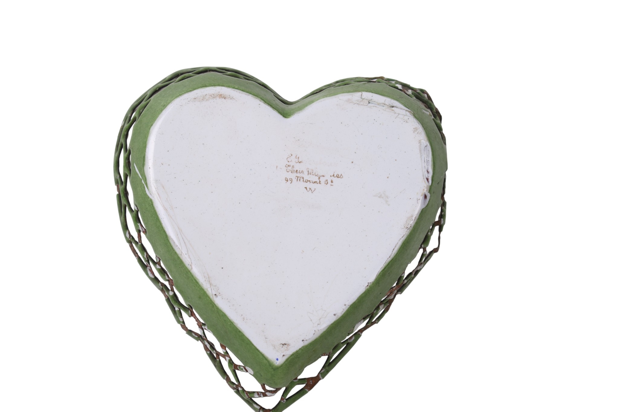 An enamel Edward VII and Alexandra 1902 coronation souvenir dish. By Edouard Henry Dreyfous, of heart form, decorated to the well with the royal cyphers and laurel boughs, rubbed gilt inscription to the base reading 'E. Henry Dreyfous, Their Majesties, 99 Mount St, W.', H3cm x circa 9.5cm x 9cm.
