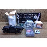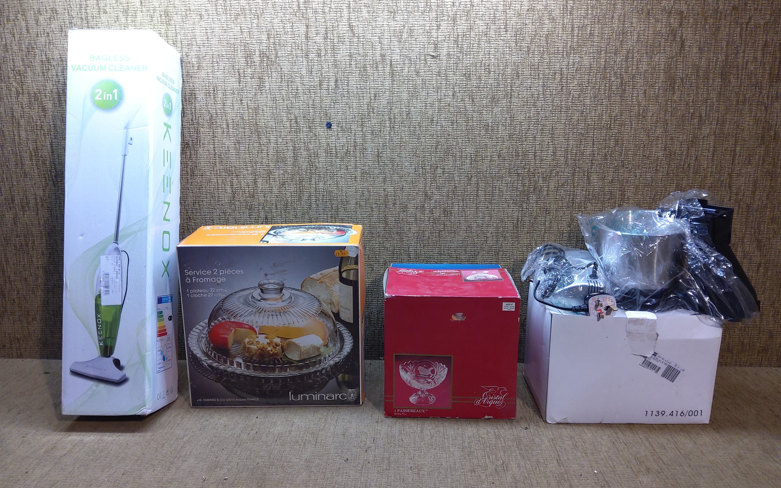 Mixed boxed items including a Keenox bagless vacuum cleaner and a cheese serving glass dome.