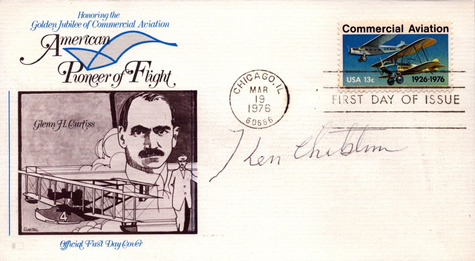 Kenneth Chilstrom signed American Pioneer of Flight FDC PM Chicago .IL Mar 1976.