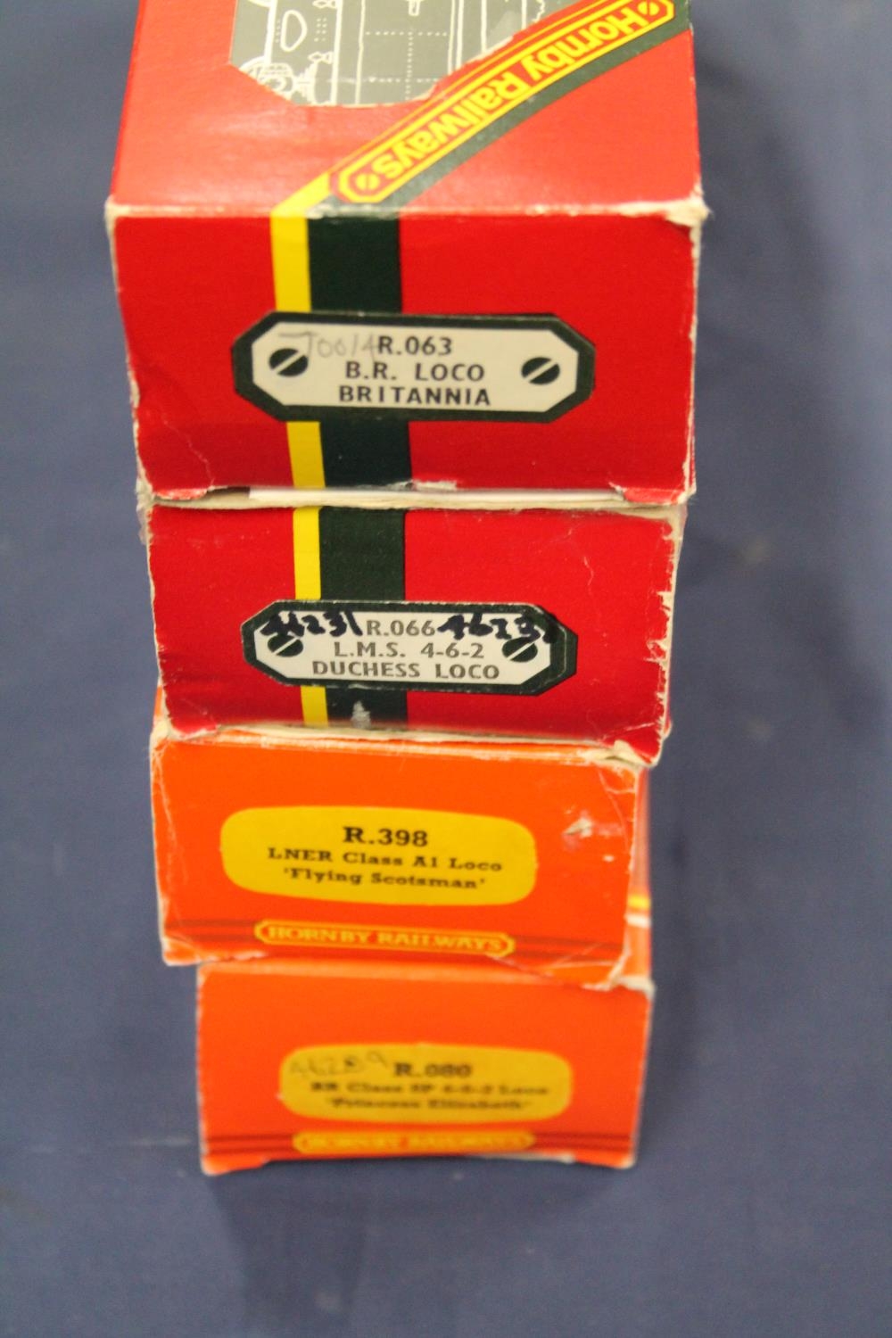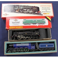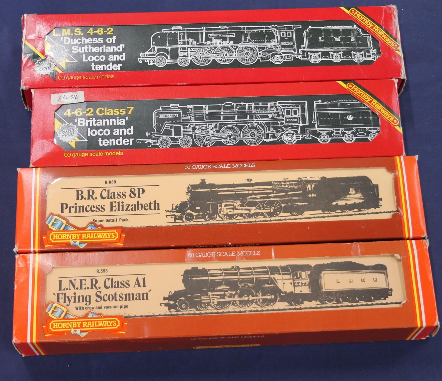 Hornby Railways OO gauge model railway locomotives to include 4-6-2 Duchess of Buccleuch tender locomotive 462320 BR dark blue, 4-6-2 Flying Scotsman 4472 LNER green, 4-6-2 Princess Beatrice 46209 BR green, and 4-6-2 Iron Duke tender locomotive 70014 BR green, each in Hornby box. (4)