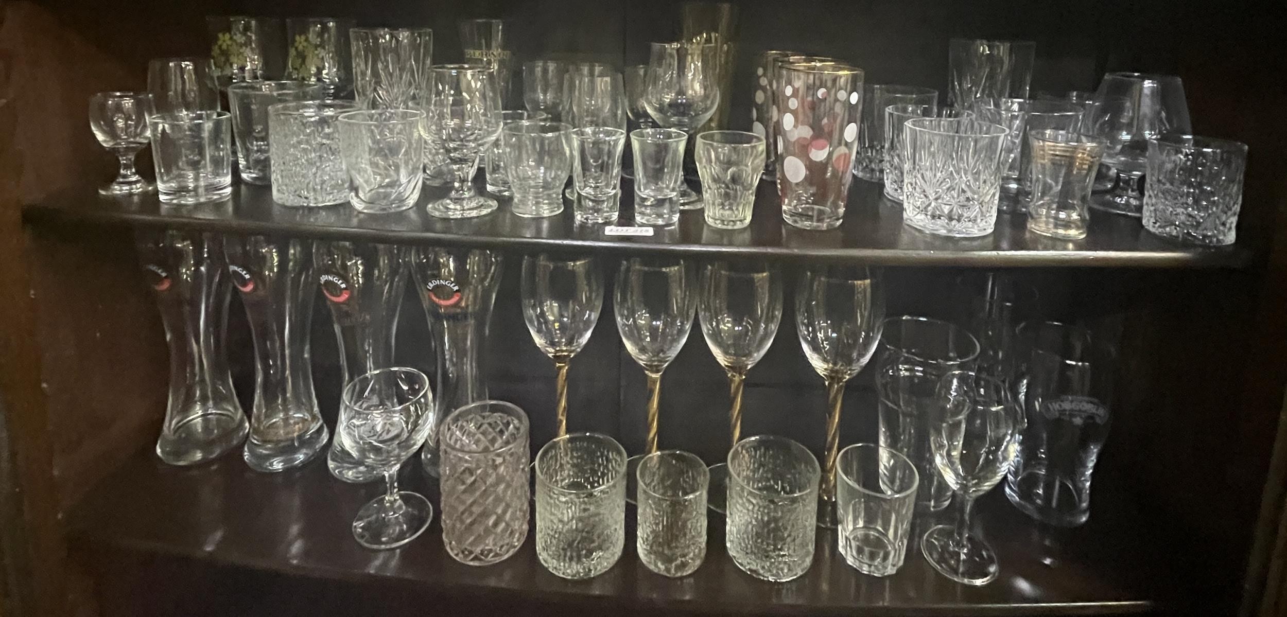 VARIOUS ITEMS OF GLASSWARE - DRINKING GLASSES, DECORATIVE VASES ETC.