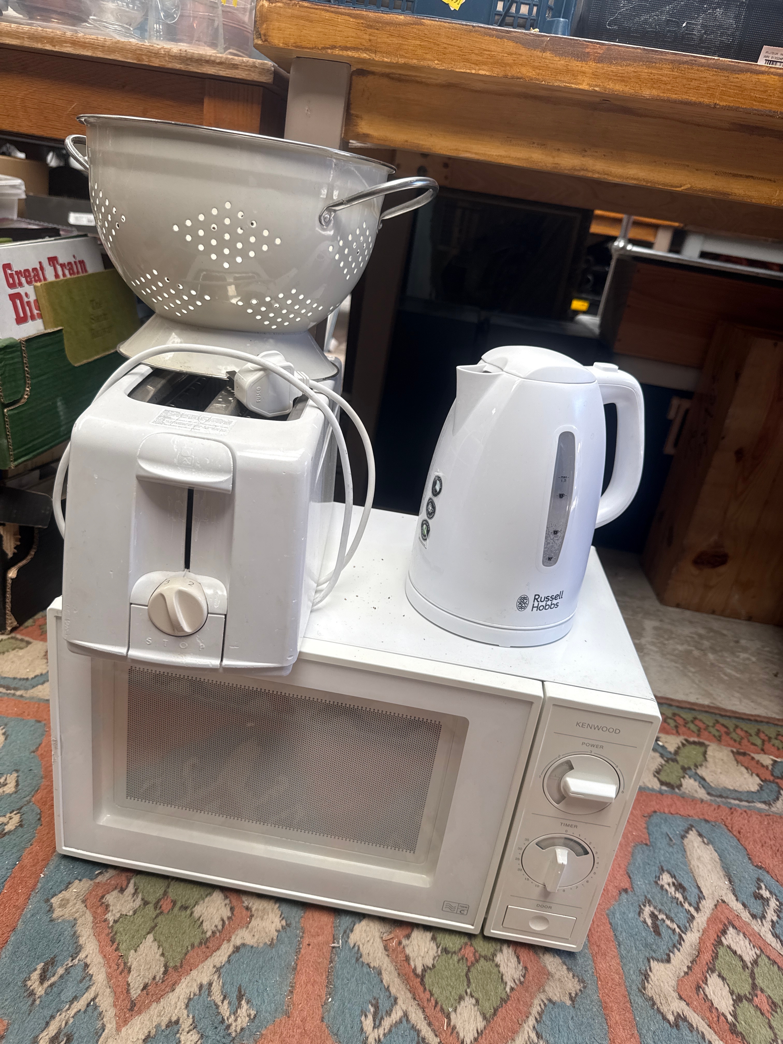 Kenwood Microwave, Russell Hobbs Kettle, Swan 4 Toaster, Sieve
