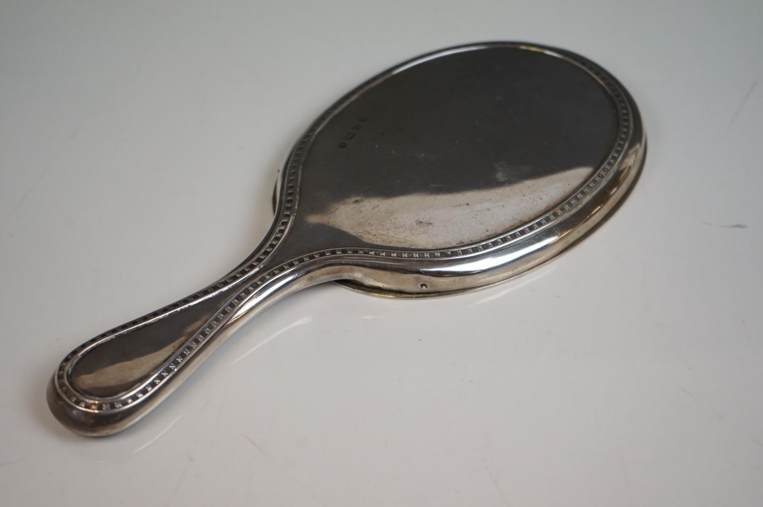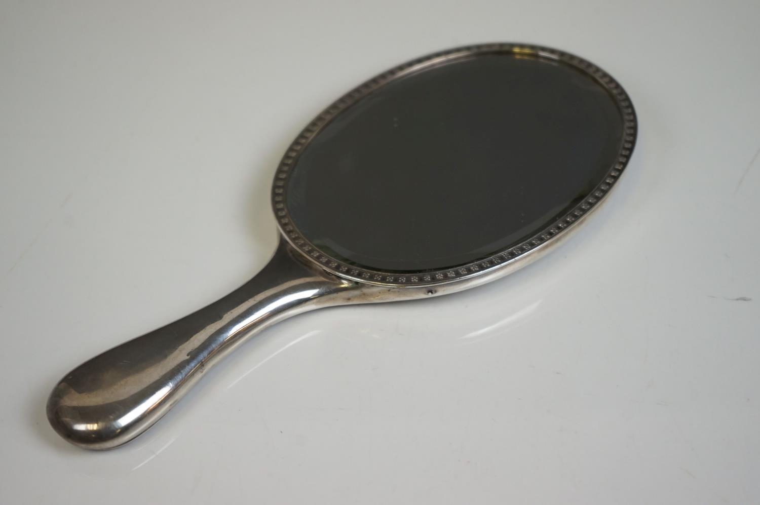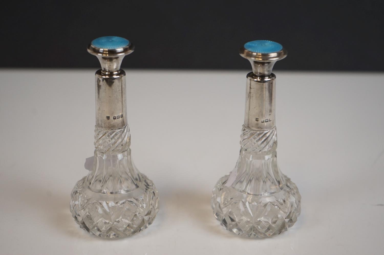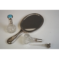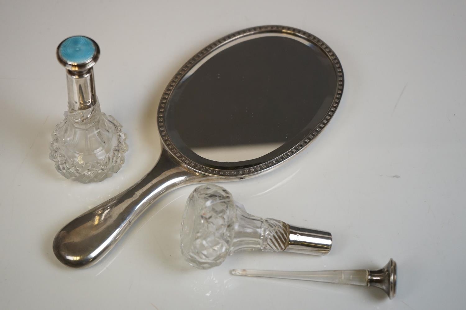 A fully hallmarked sterling silver hand mirror together with two hallmarked silver topped scent bottles with guilloche decoration.