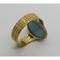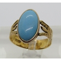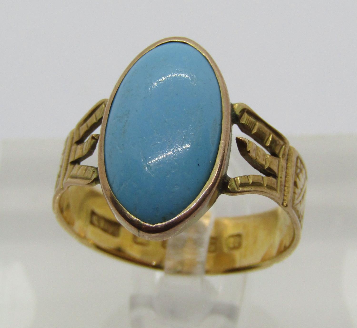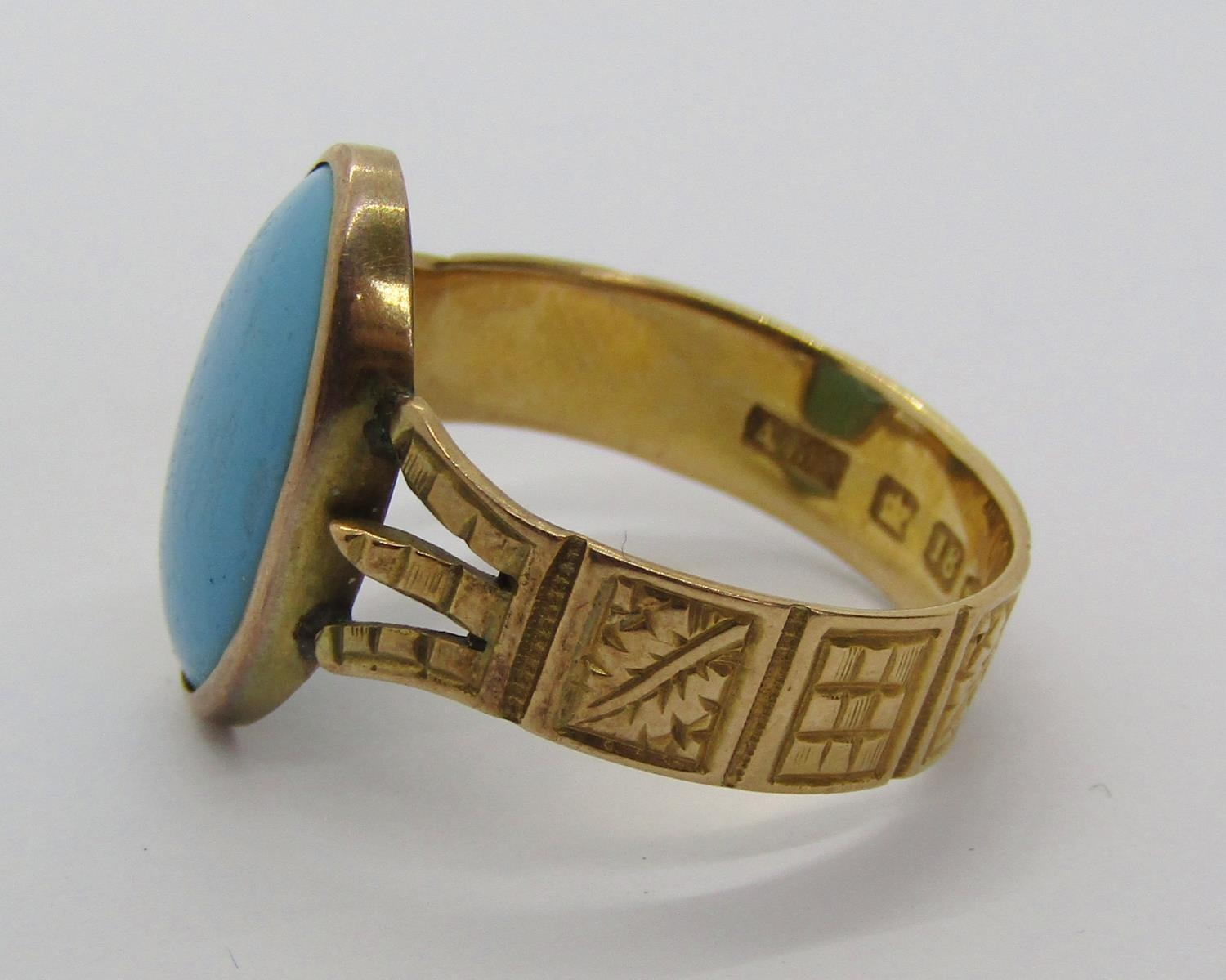 Victorian 18ct turquoise ring with decorative shank, maker Abraham Meyer Blanckensee, Chester 1883, size P/Q, 3.6g