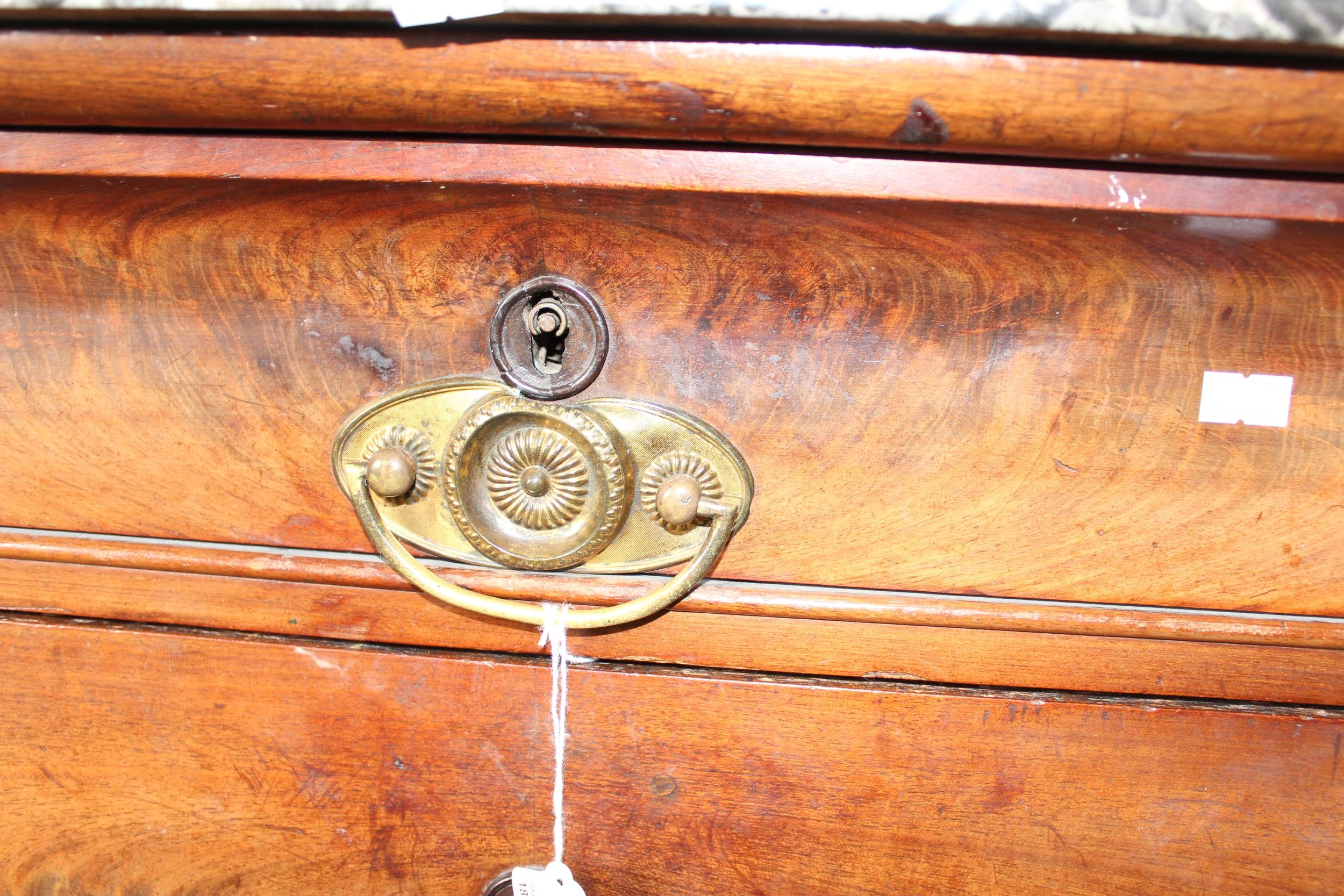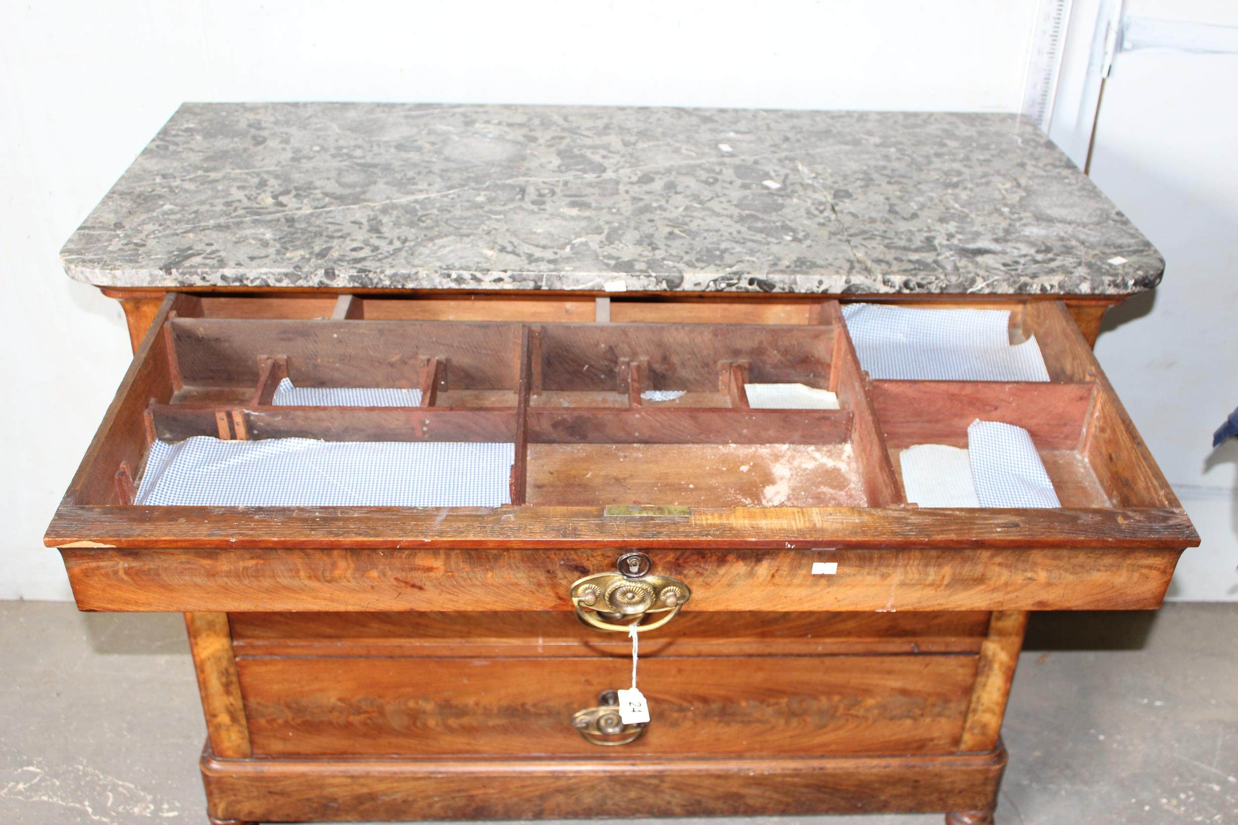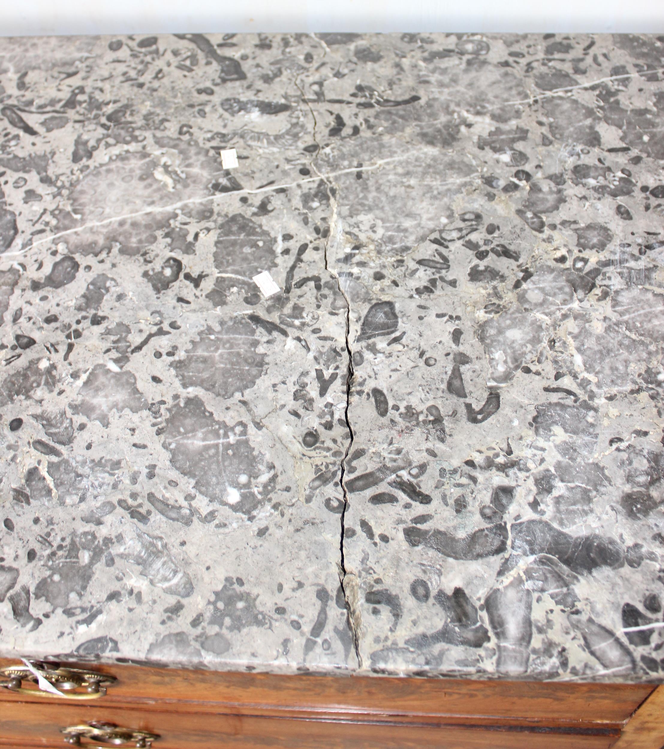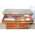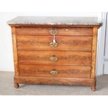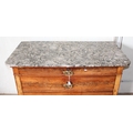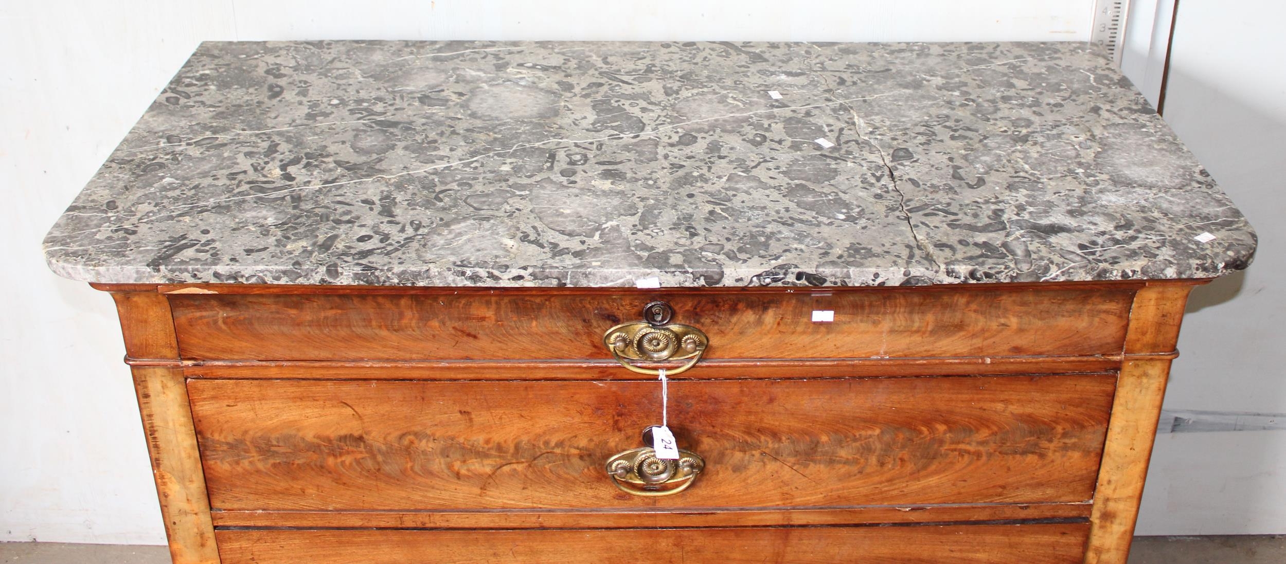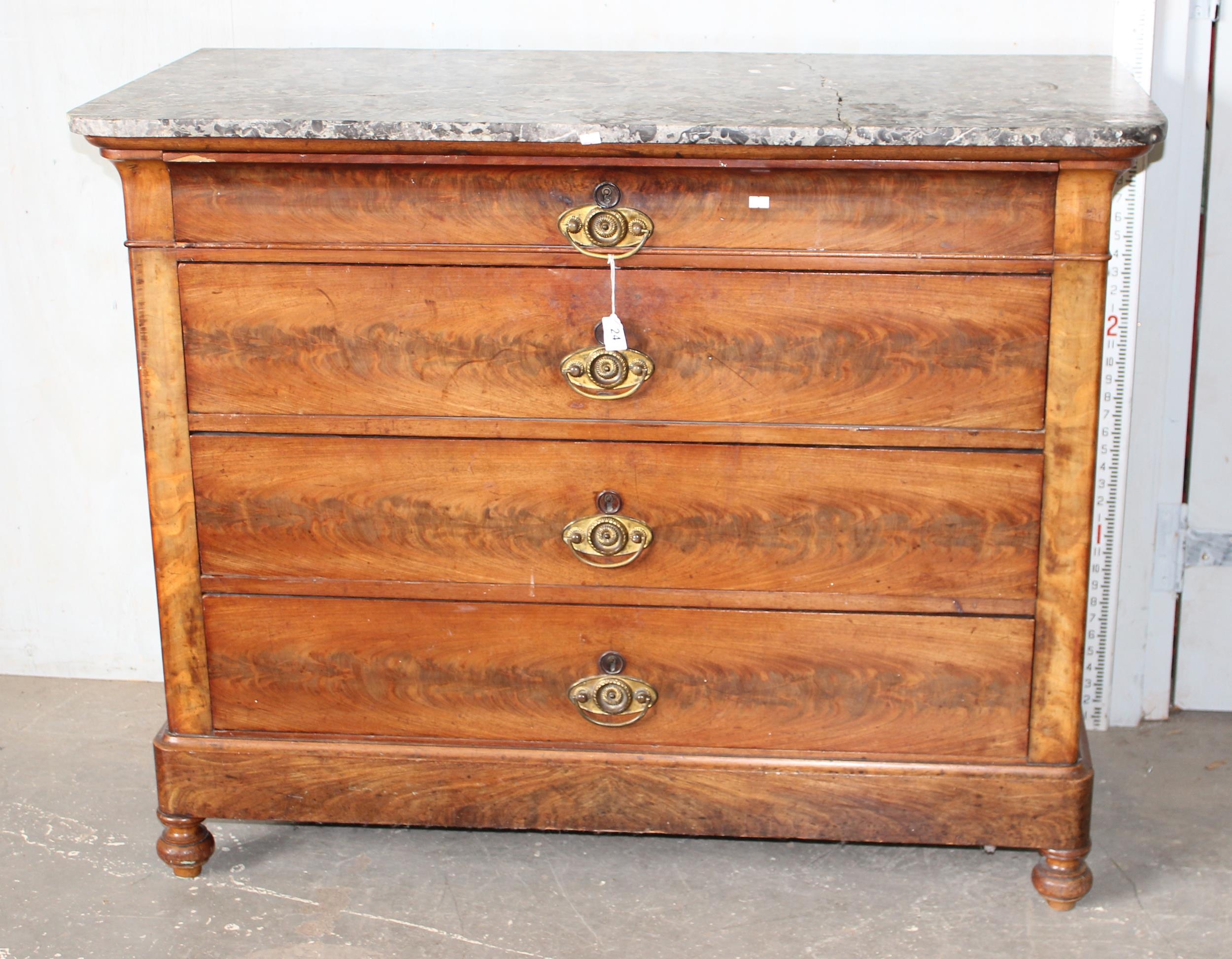An antique 4 drawer mahogany chest of drawers with grey marble top. likely French
