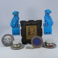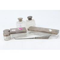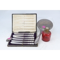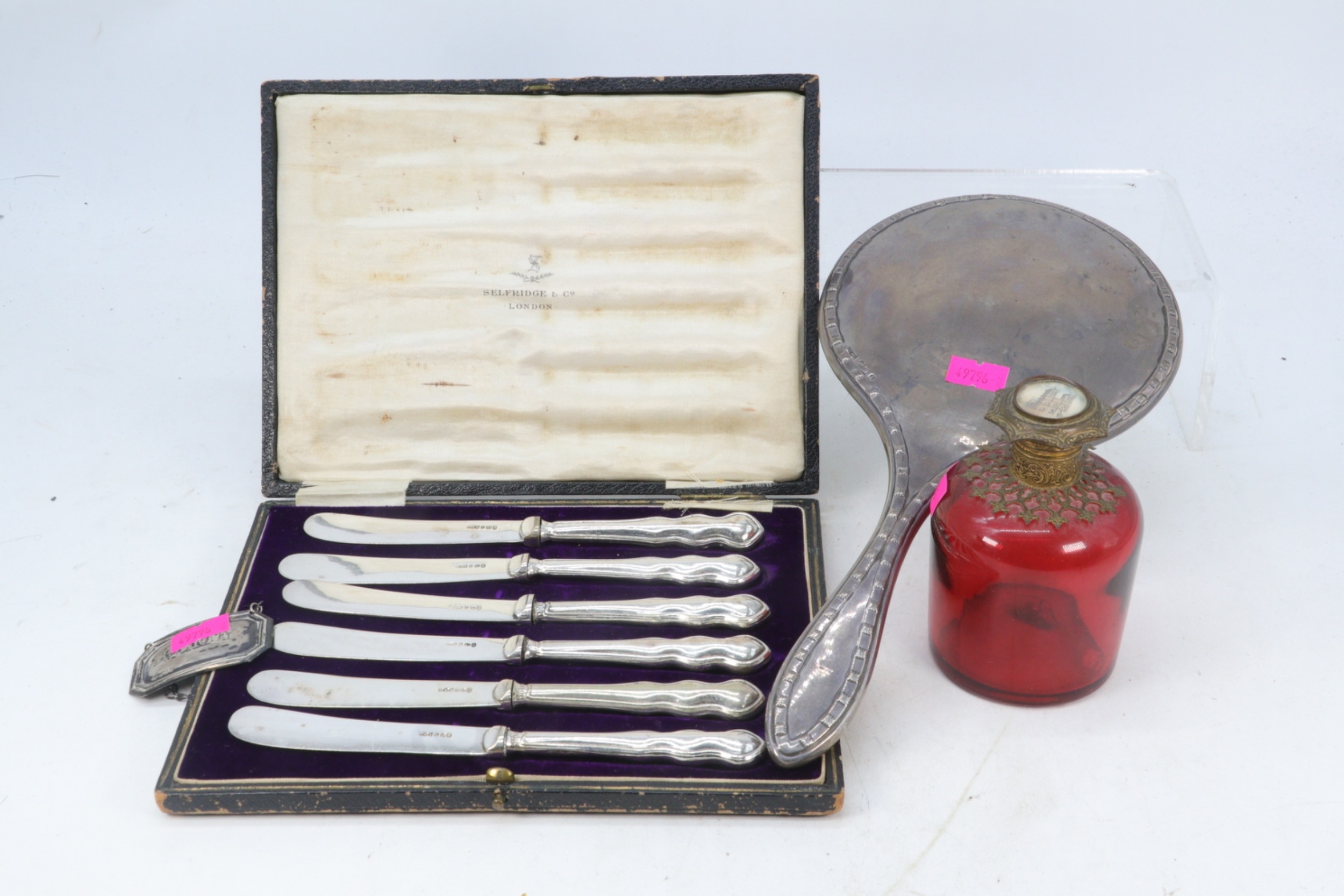 Silver backed hand mirror, grand tour ruby glass scent bottle with gilt top, silver Sherry label, cased set of silver handled knives