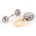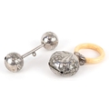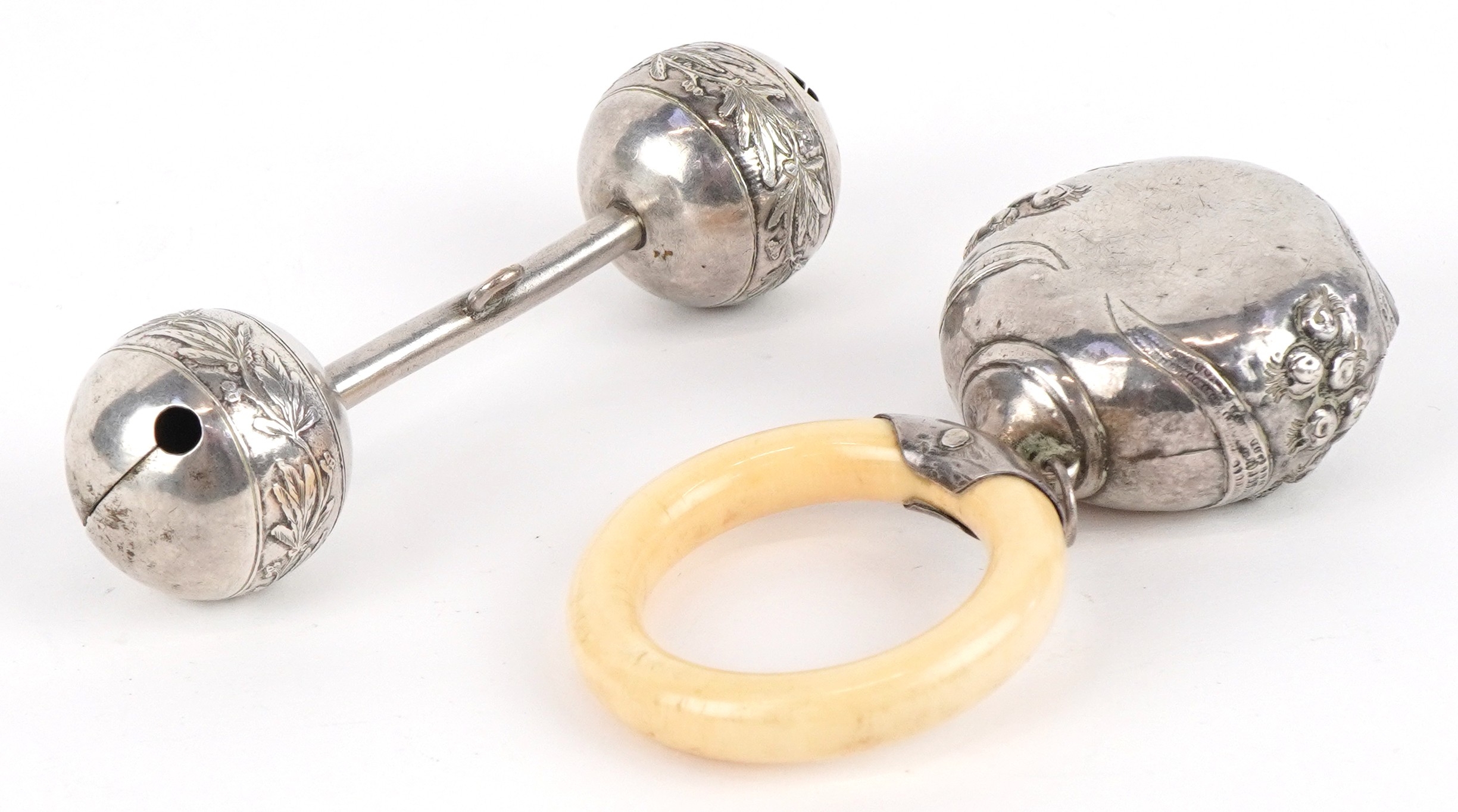 Two early 20th century unmarked silver babies rattles, each ...