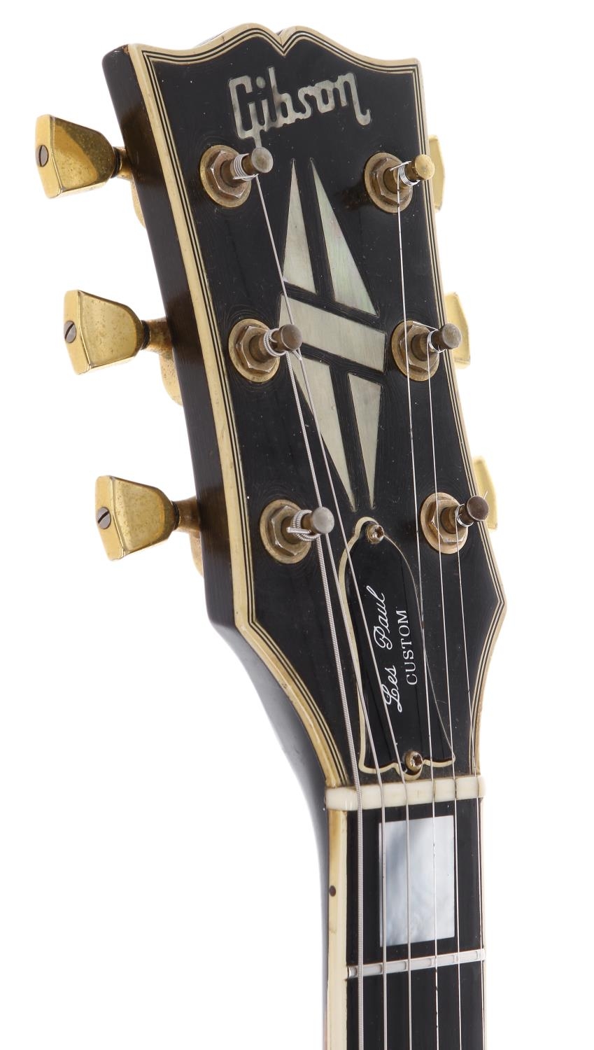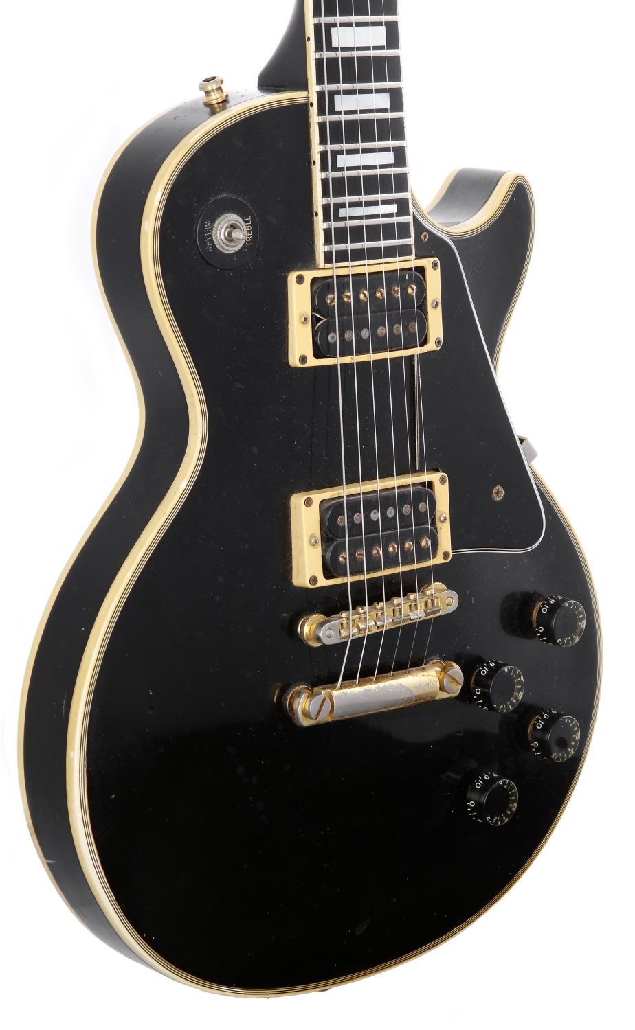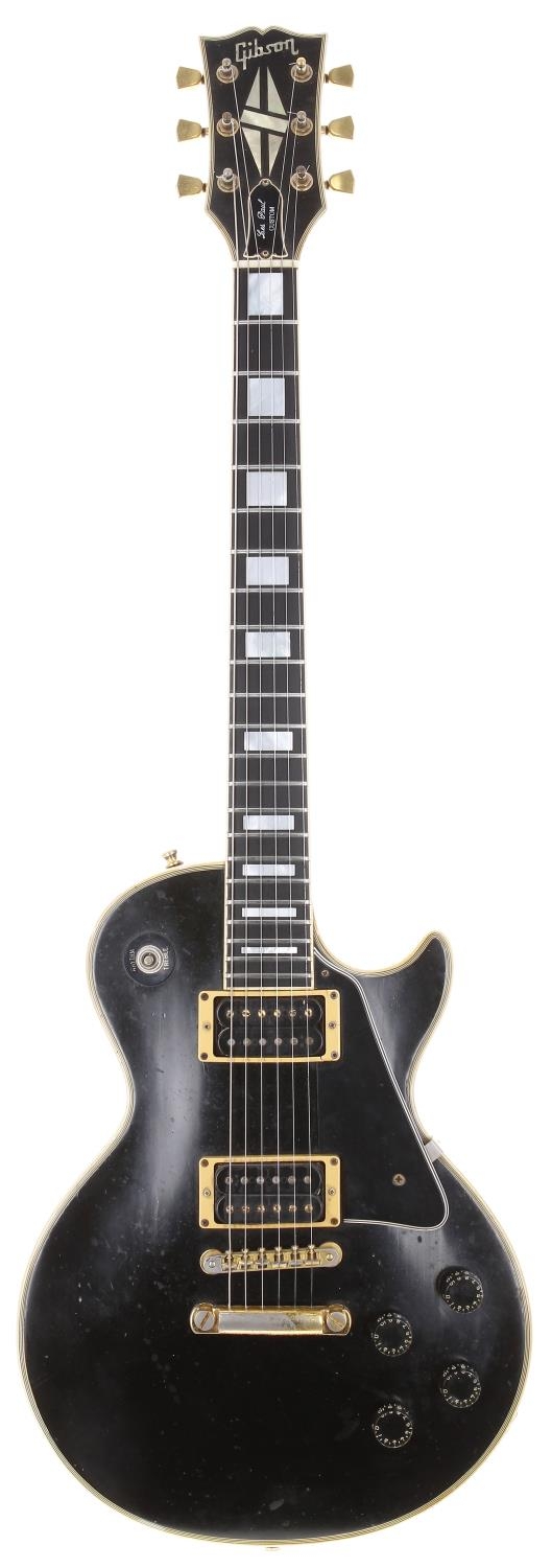 1979 Gibson Les Paul Custom electric guitar, made in USA; Body: black finish, buckle rash to back including large central blemish and scratching, various further dings and marks; Neck: generally good, finish loss to either side of neck, various minor dings; Fretboard: ebony; Frets: minor indent wear; Electrics: working, original T Top humbucker pickups (covers removed) and original 1978 potentiometers, replacement switch (original retained); Hardware: replacement pickup surrounds, missing switch tip, replacement strap buttons, replacement bridge, loss to gold plating on stop bar and bridge; Case: original hard case; Weight: 4.80kg; Overall condition: good for age