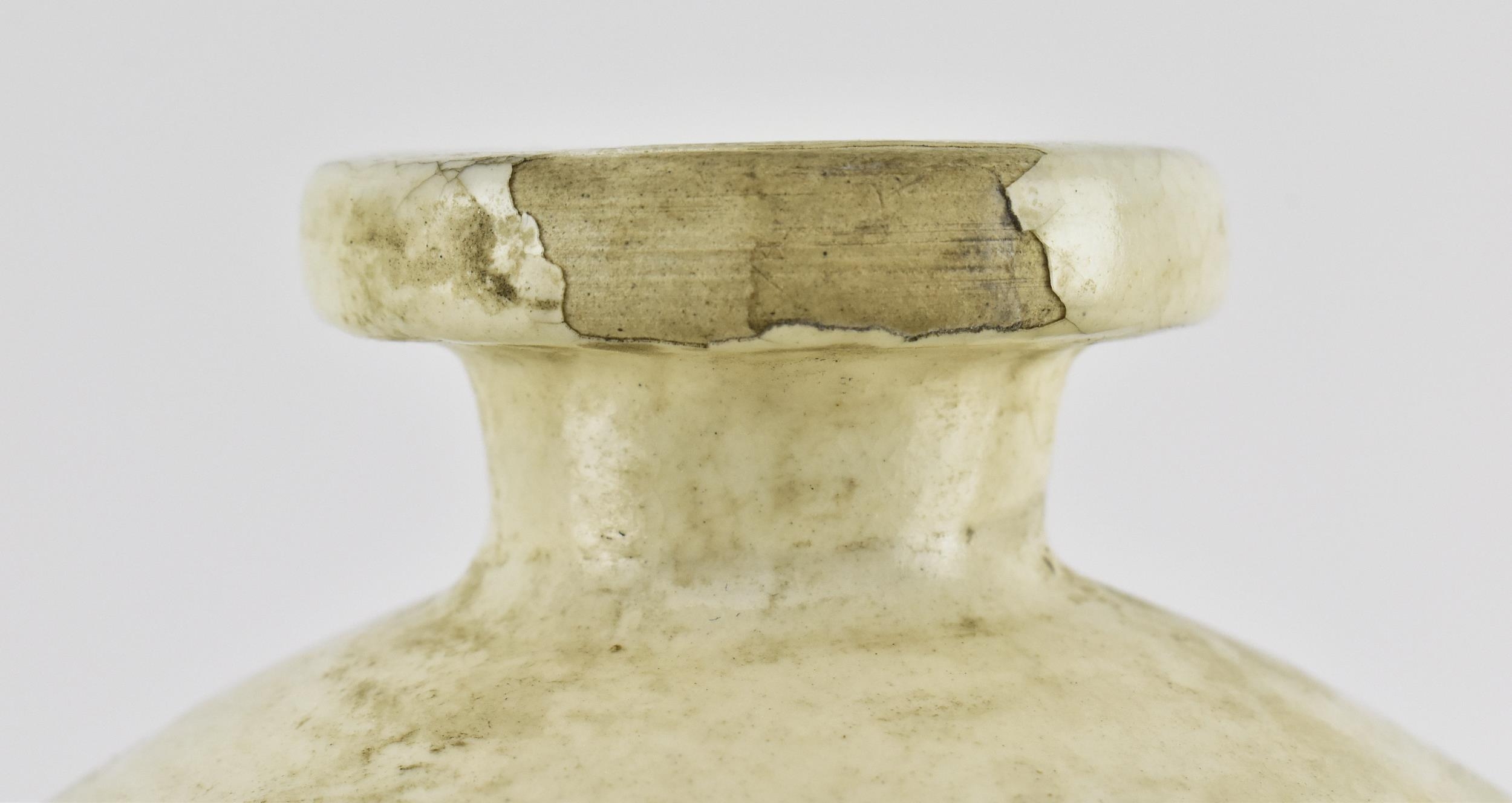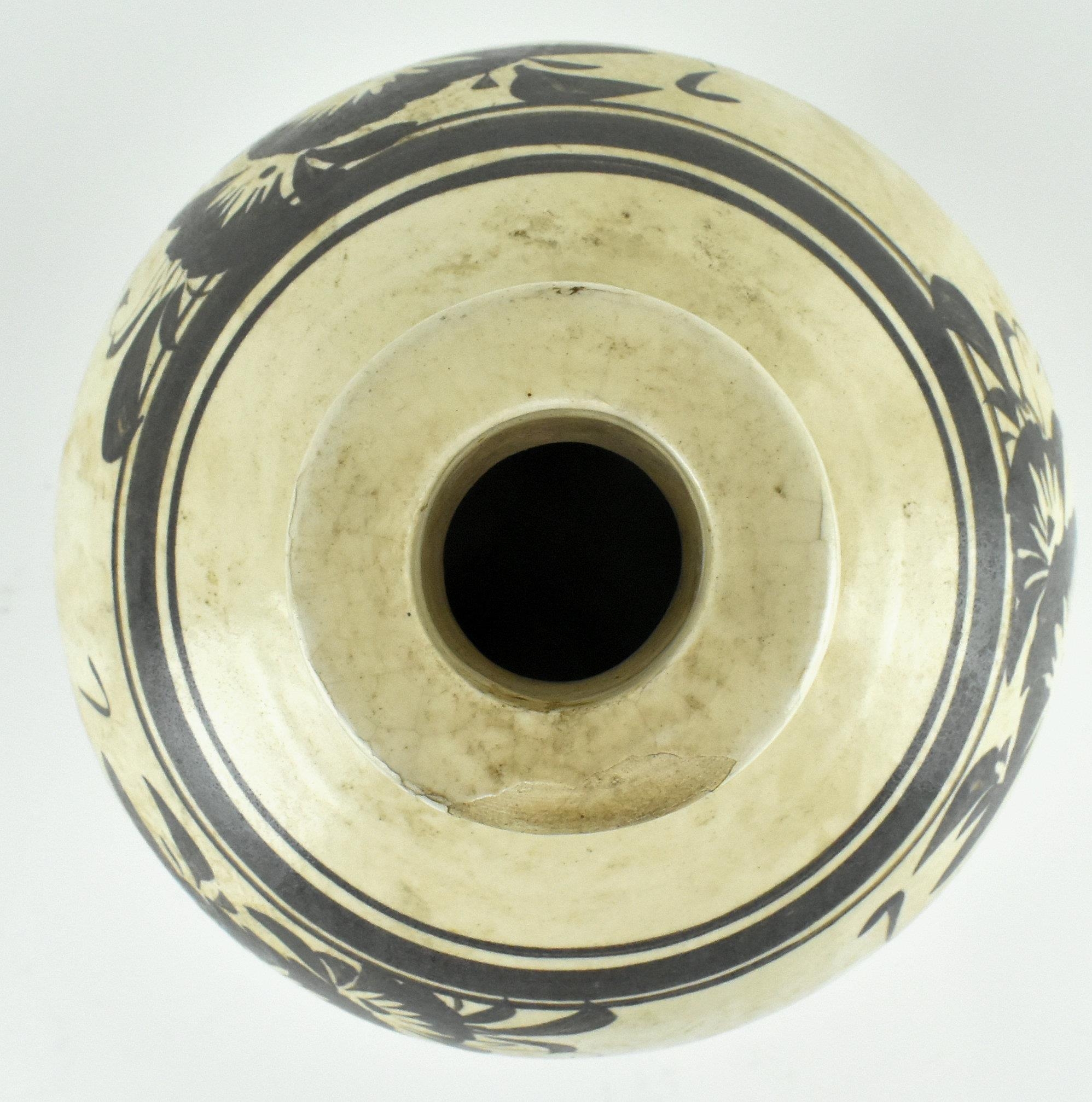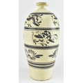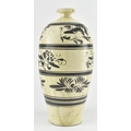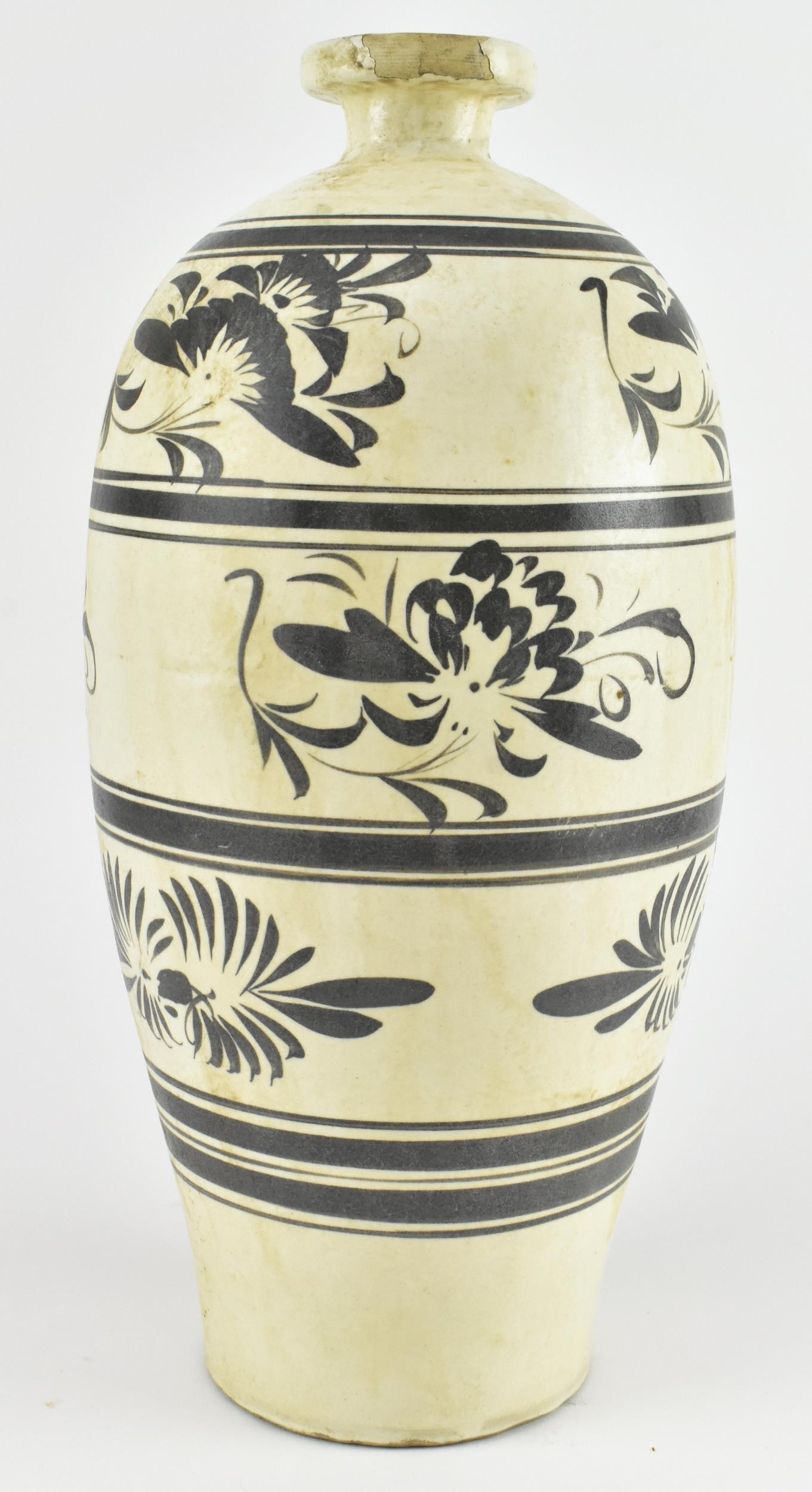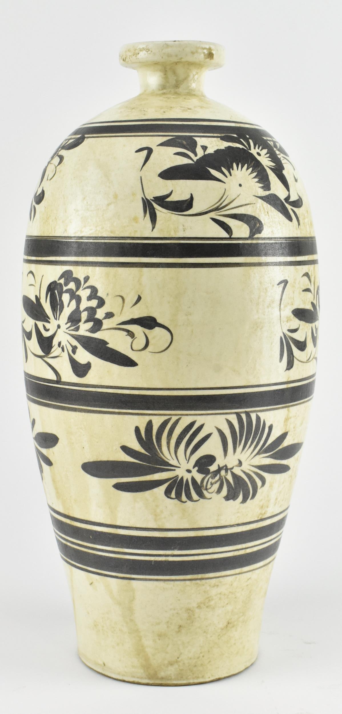 A Chinese Cizhou meiping vase. The meiping vase modelled a short neck with everted rim, the body covered in cream glaze and dark brown paint with overlap floral motifs. Measures approx. 34cm tall.