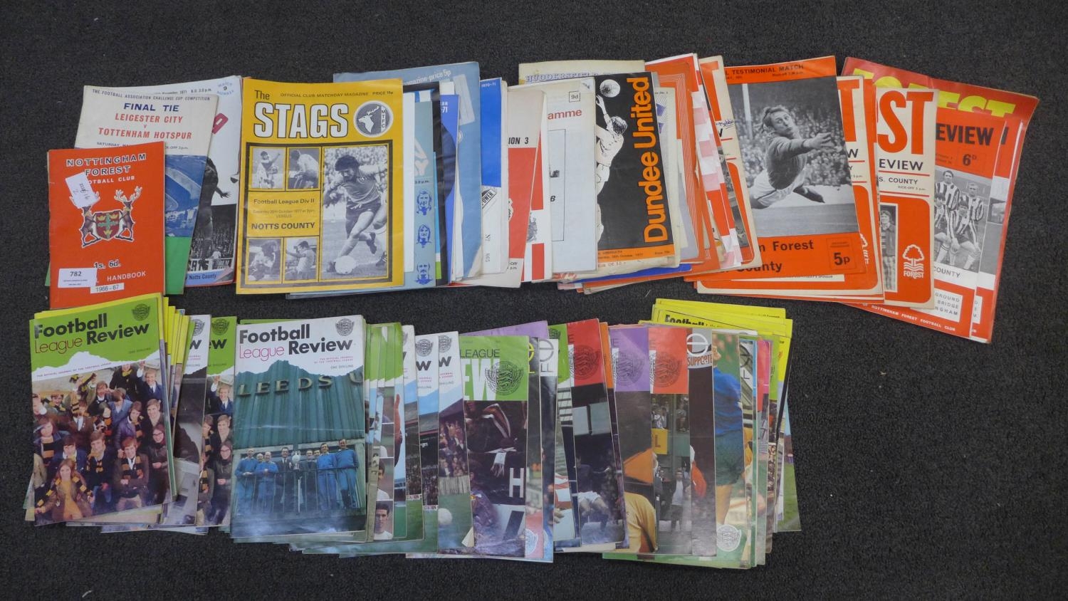A collection of Nottingham Forest FC football programmes, a FA Cup Final programme, Leicester v Tottenham 1961 and a collection of Football Review programmes