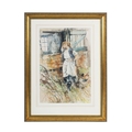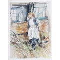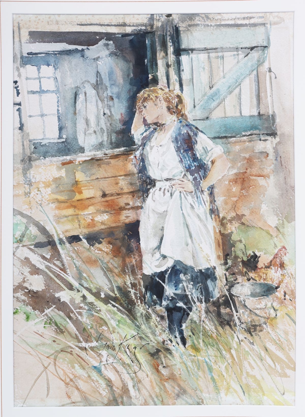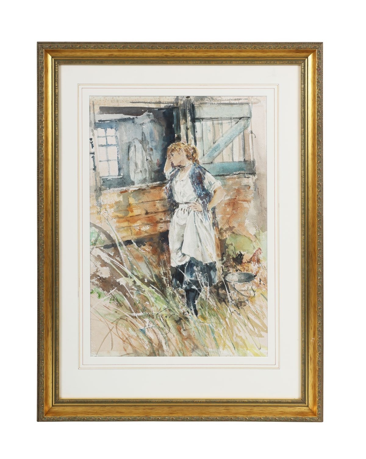 Watercolour depicting a young woman in rustic attire standing by a stable door, rendered in King’s fluid, expressive style with fine tonal control. Signed lower centre and framed. Image: 52 x 36 cm. Framed: 75 x 57 cm. PICTURES AND PRINTS Thursday 11th December 2025 18:48:32