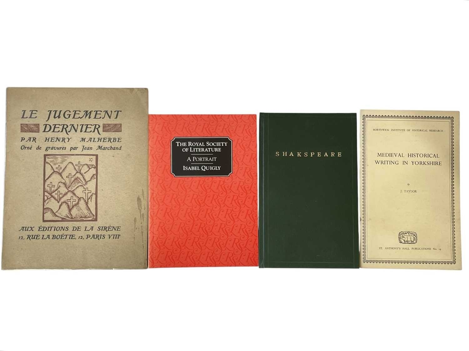 (Book history) Eighteen works Includes Henry Malherbe, 'Le Jugement Dernier', La Sirène, Paris, French, dj in glassine wrap, with staining to verso and recto of cover; Derek Baker, 'The Bibliography of the Reform', Basil Blackwell, Oxford 1975, good and bright unclipped dj; Benson Bobrick, 'The Making of the English Bible', Weidenfeld & Nicolson, 2001; Greg Walker, 'Writing under Tyranny', Oxford University Press, 2005; together with other works on medieval writing, the Grand Tour and verse and prose, all vg/near fine, with minor sun-toning to djs. (18)