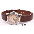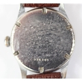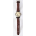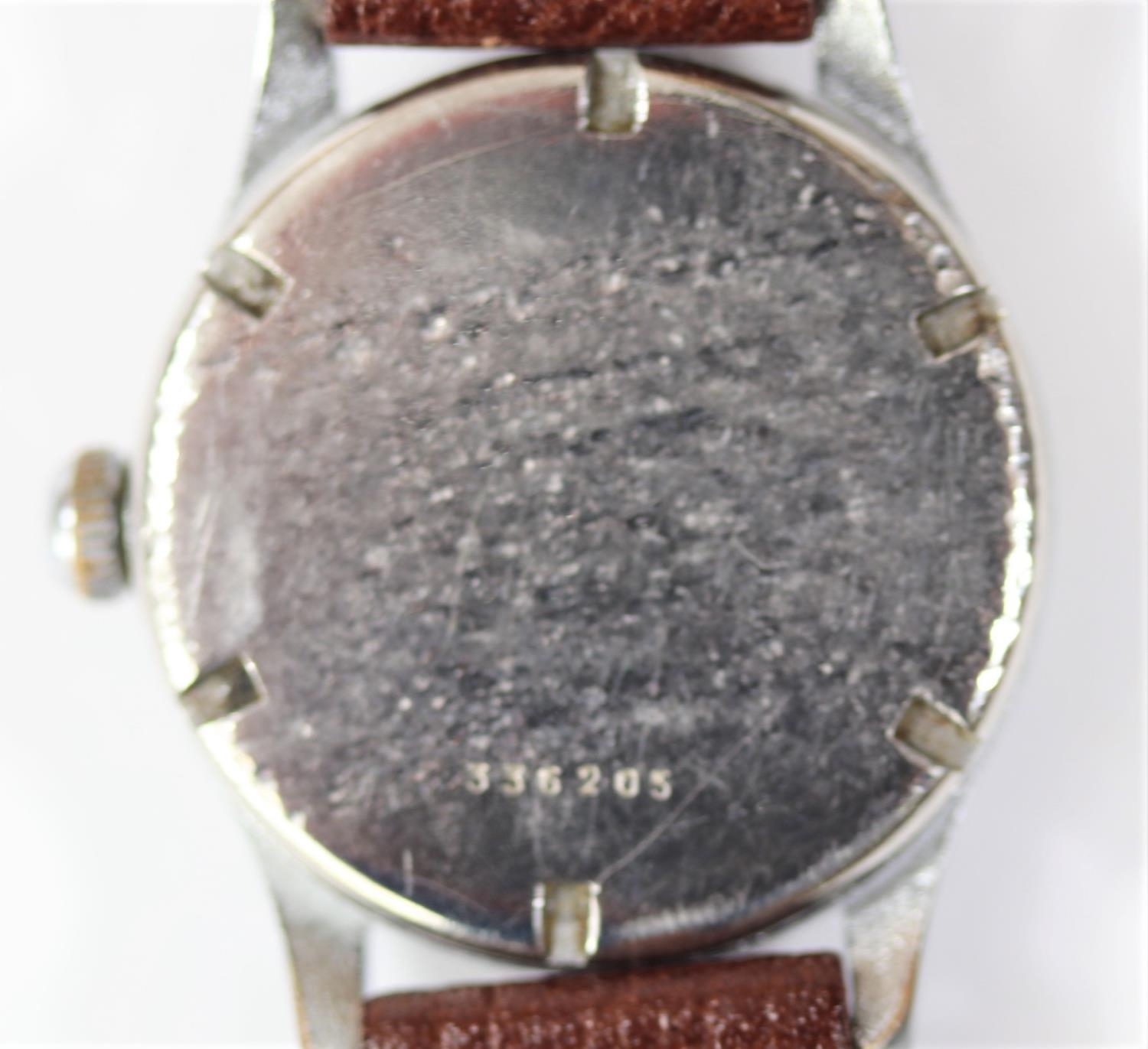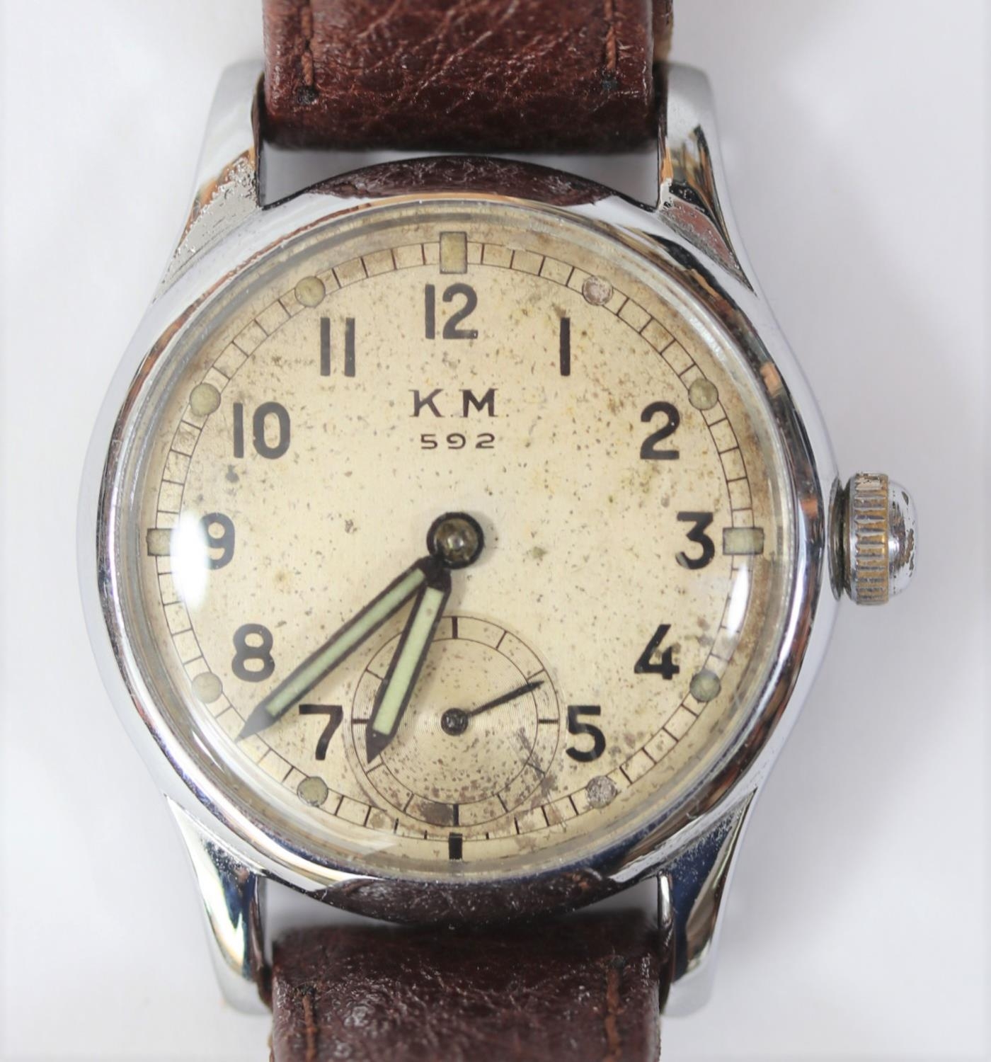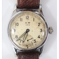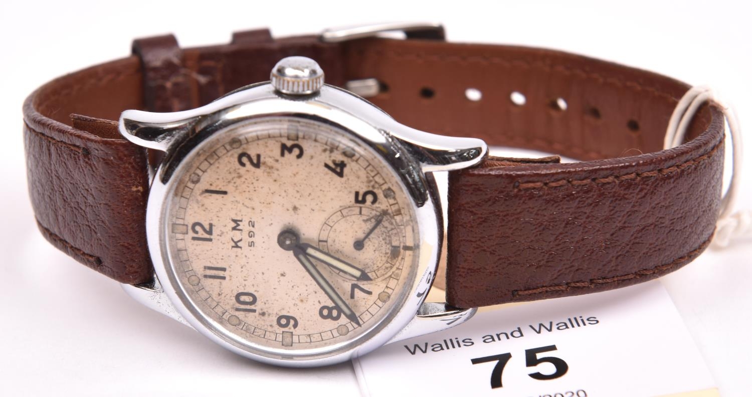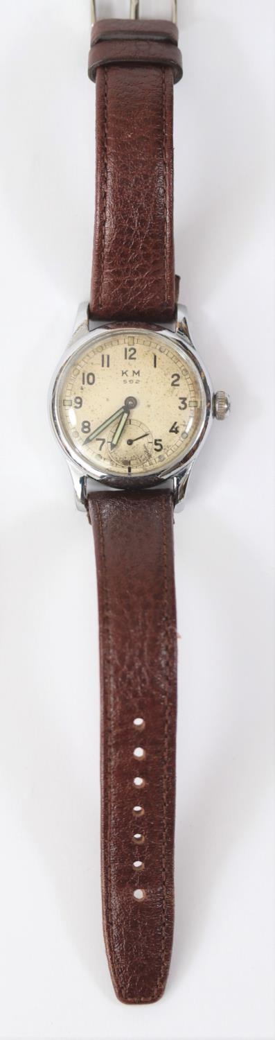 KM marked Alpina wristwatch. Serial 336205. Plated case, refinished bright chrome, 31mm without crown. Fixed bars. Screw back, blank except serial externally, signed Alpina, edelstahl boden on inside. Some pitting on the outside. Silvered dial with significant spotting, luminous material on dial markers appears original, hands have been refinished. Marked KM, 592. Alpina 592 movement, with shock protected balance, serial 3565, generally clean, running condition. Movement retaining ring present. GC