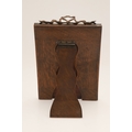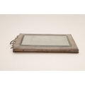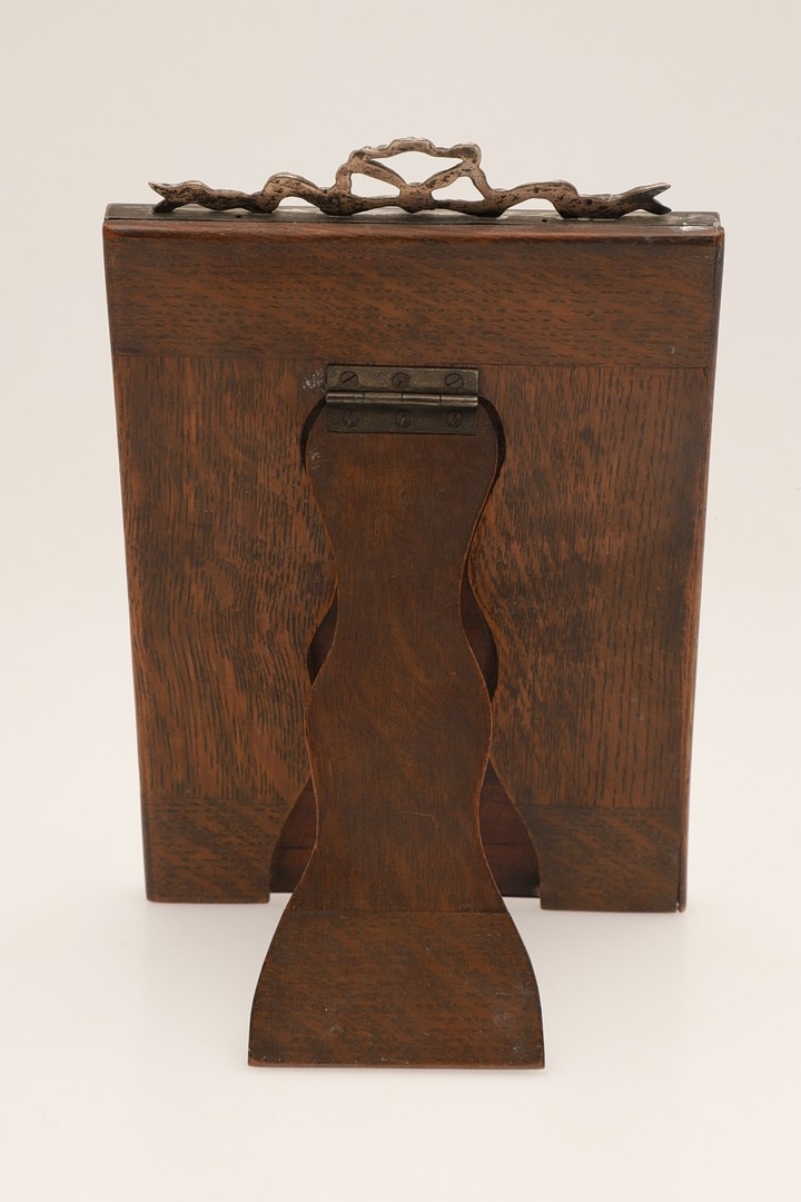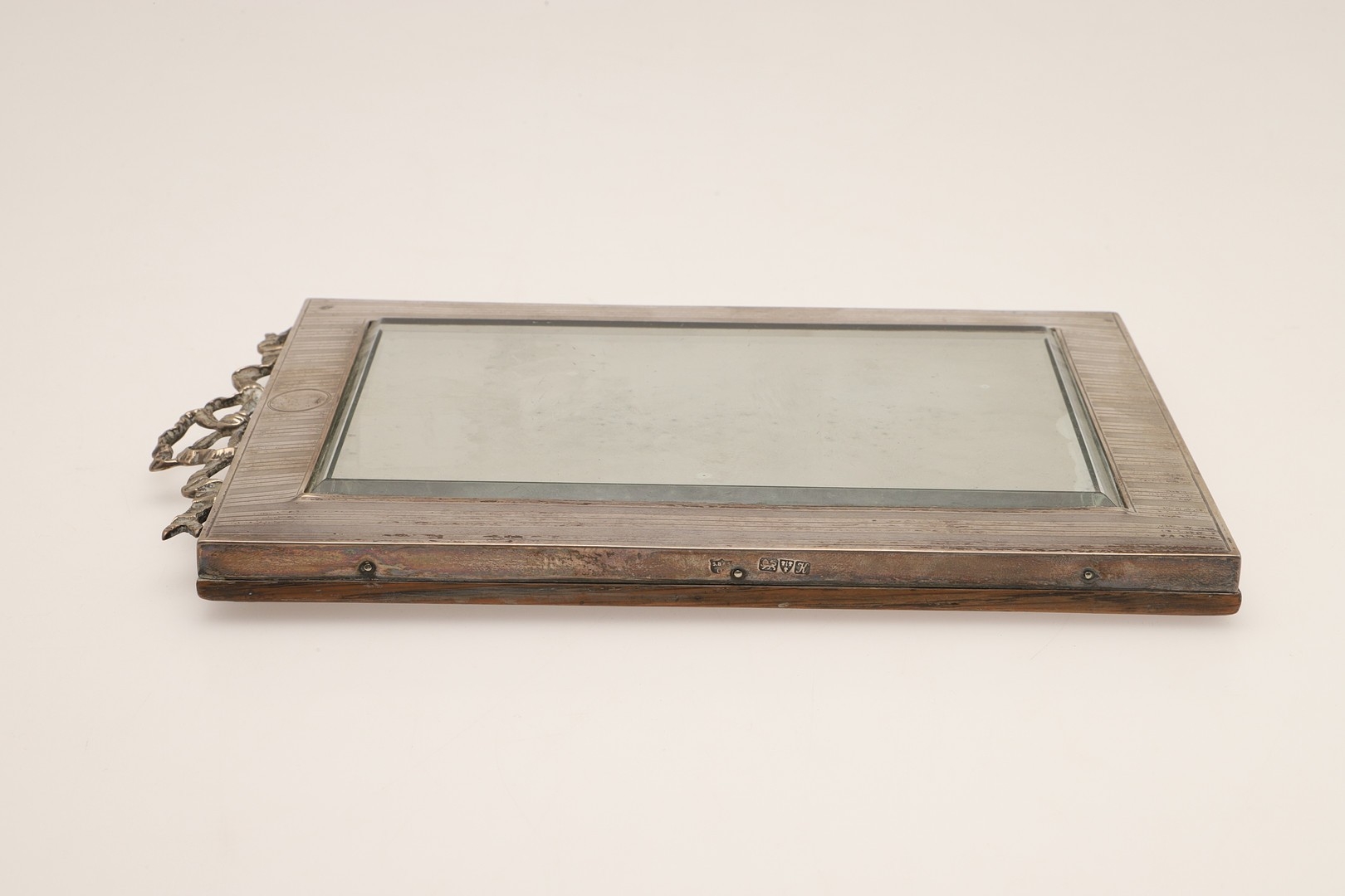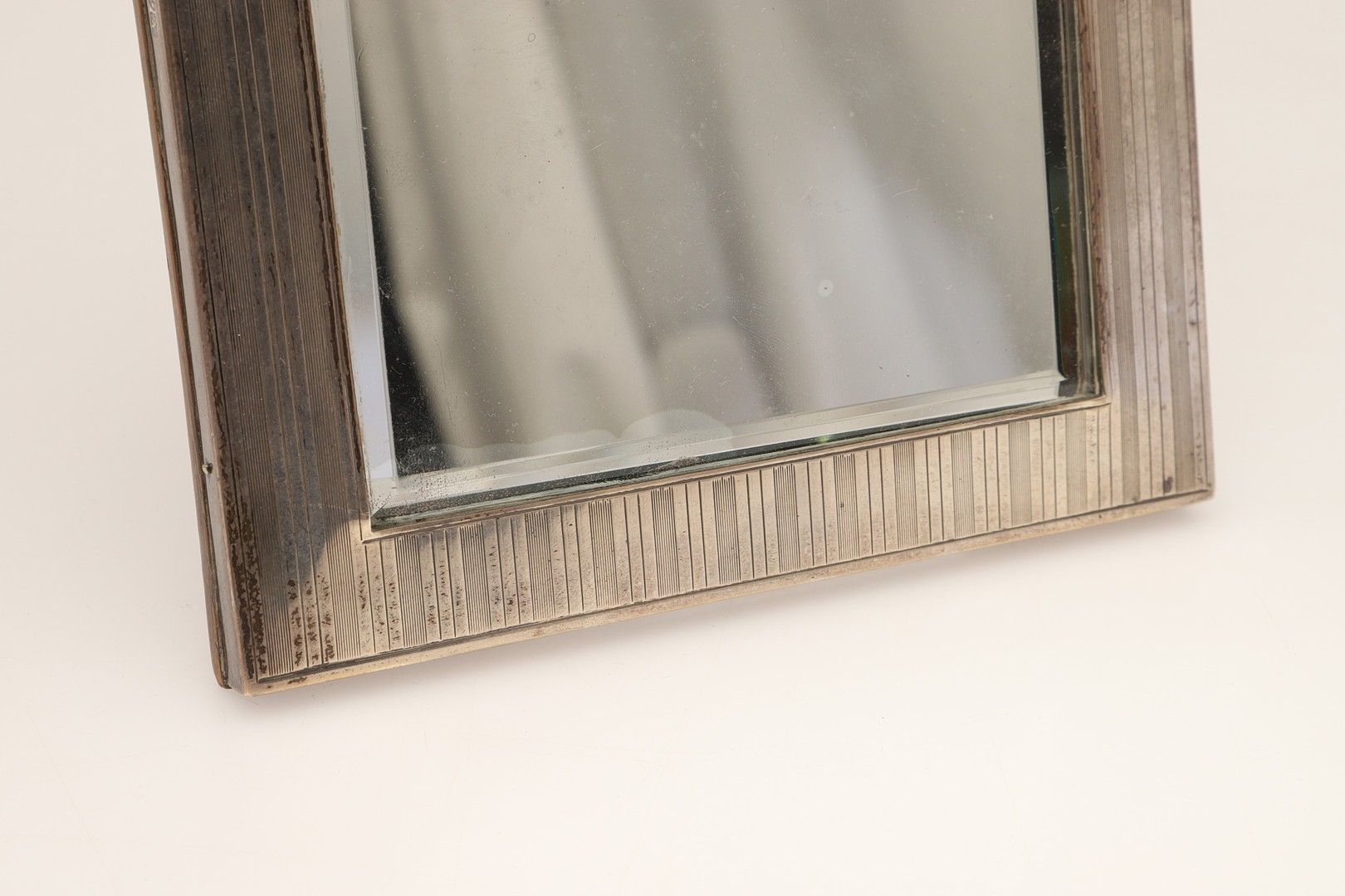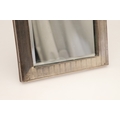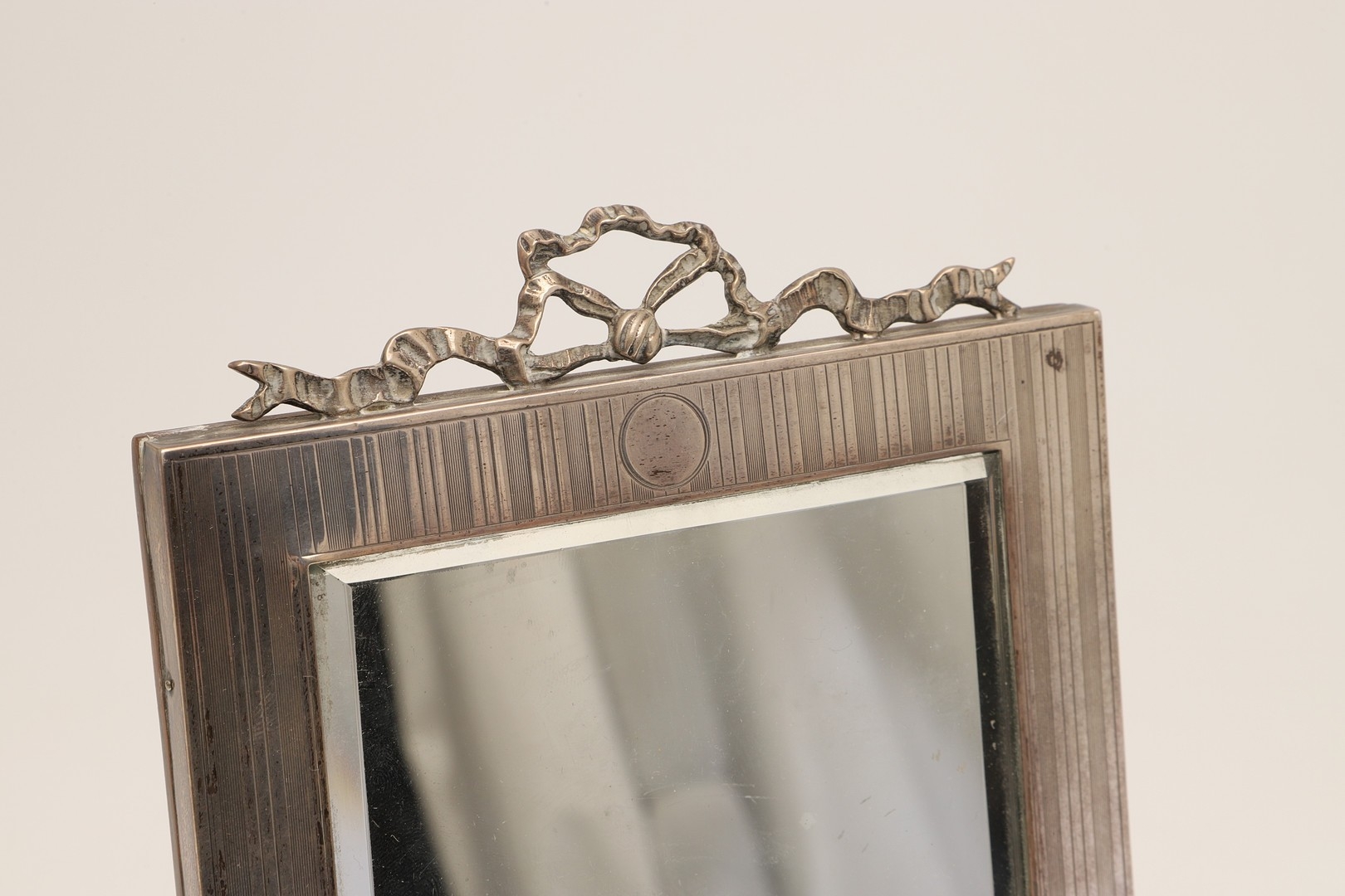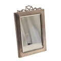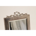A LATE EDWARDIAN SILVER EASEL DESK MIRROR. The engine turned rectangular frame with inset bevelled edge mirror, topped with ribbon and bow decoration. Wooden back. Hallmarked S Blanckensee & Son Ltd, Chester, 1910. Height 24cm x Width 15.5cm.