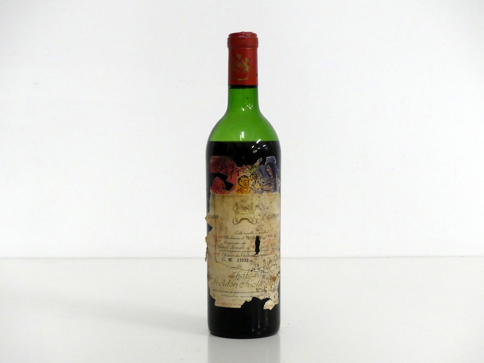 1 bt Ch. Mouton Rothschild 1970 Pauillac 1er Grand Cru Classé Marc Chagall Label, ls, sl stl, torn label, vsl crusted foil