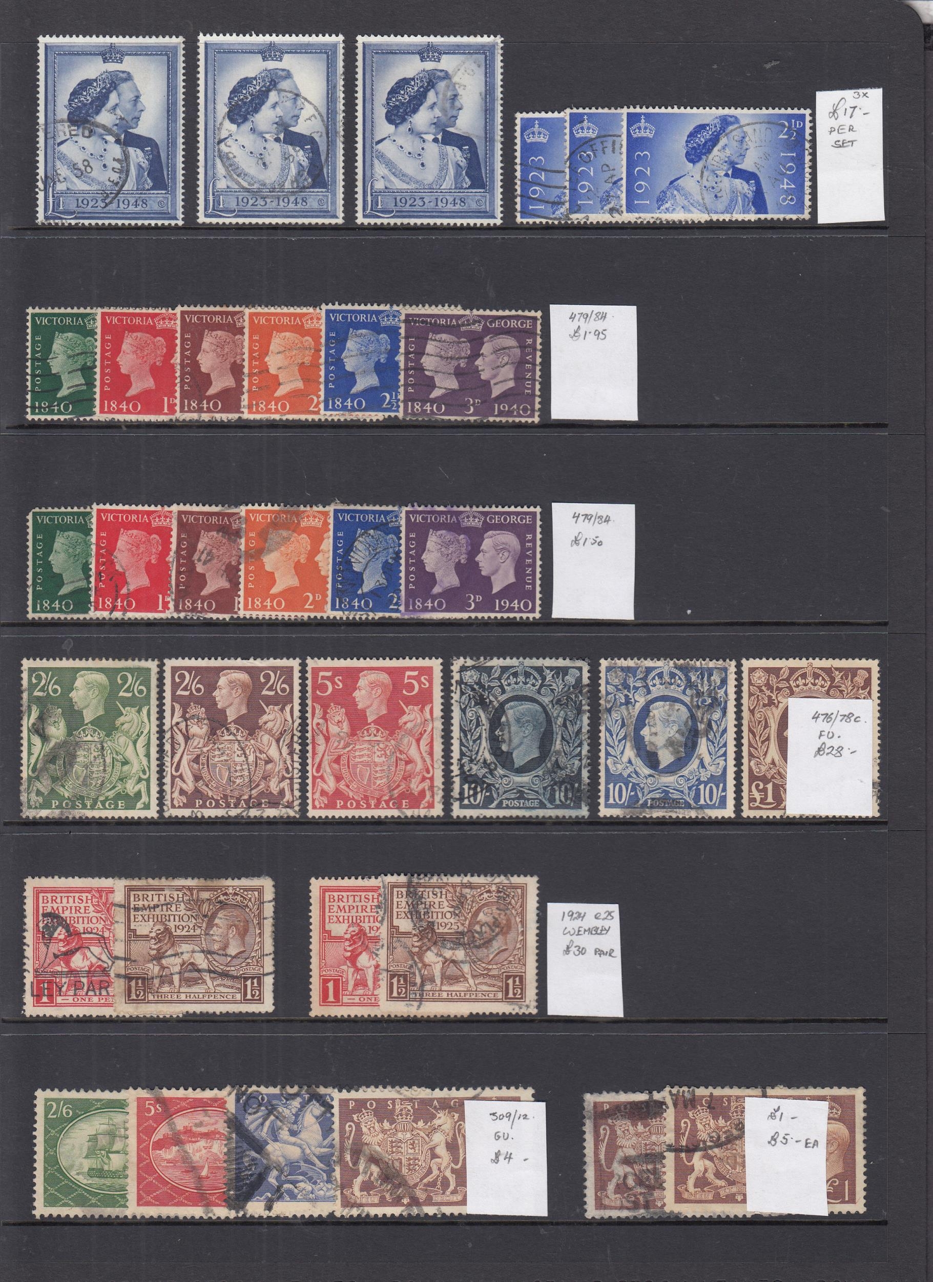 A GB collection containing 2 stock books, album pages, stock cards, loose stamps sorted into packets, early QEII FDC and pre decimal Presentation Packs, mostly KGV to QEII, includes 1924 & 25 Wembley’s, 1939 high values to £1, 1948 Silver Wedding (3) and 1951Festival high values to £1 used