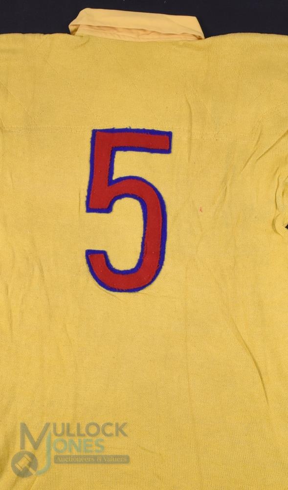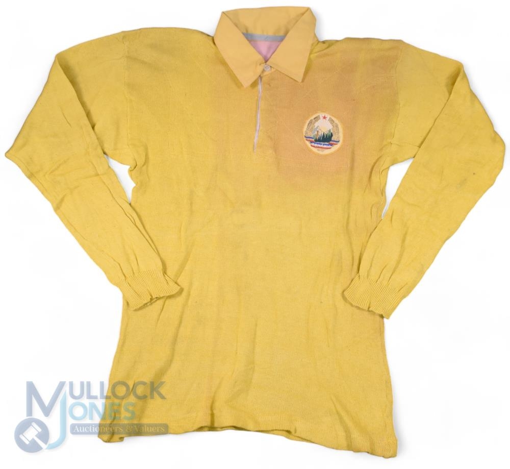 1950s(?) Romania Rugby Jersey: Really rarely seen, in old-fashioned materials and style, yellow with same coloured large collar, no maker's label, old-style Romania Socialist Republic Soviet-era badge, red and blue no.5 to rear. Best estimate is probably the 1950s, possibly brought back from the international tourney at the Moscow Youth Games attended by Carwyn James and Llanelli in 1957 or exchanged by the Romanians who toured to S Wales clubs in the 50s. VG, different!