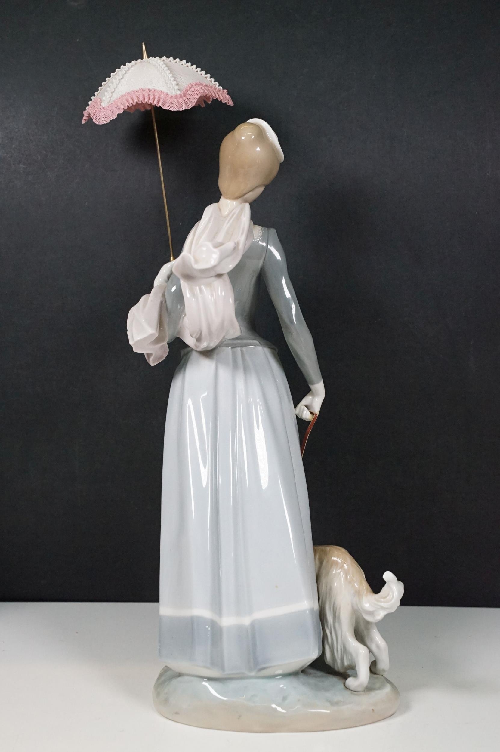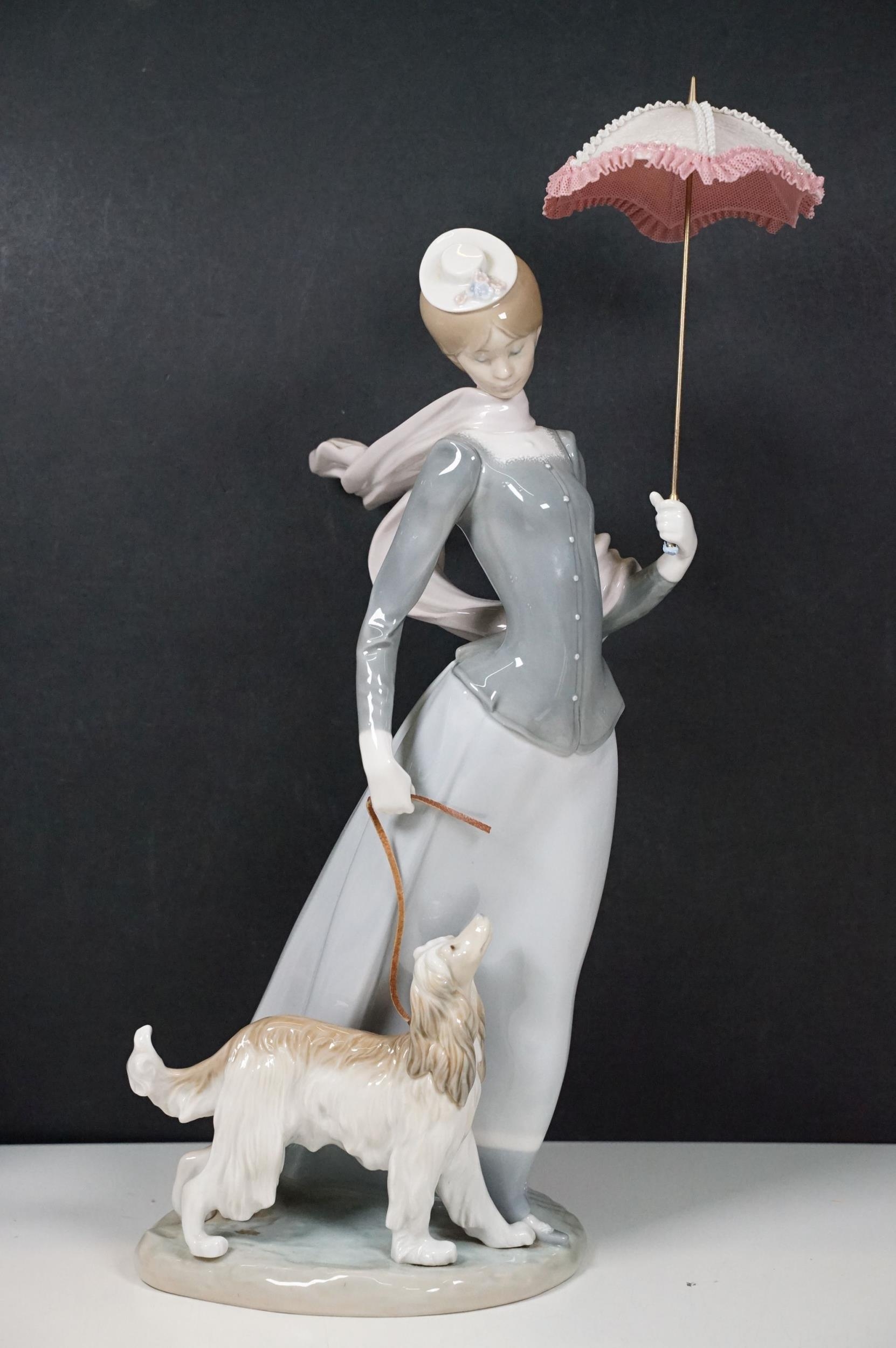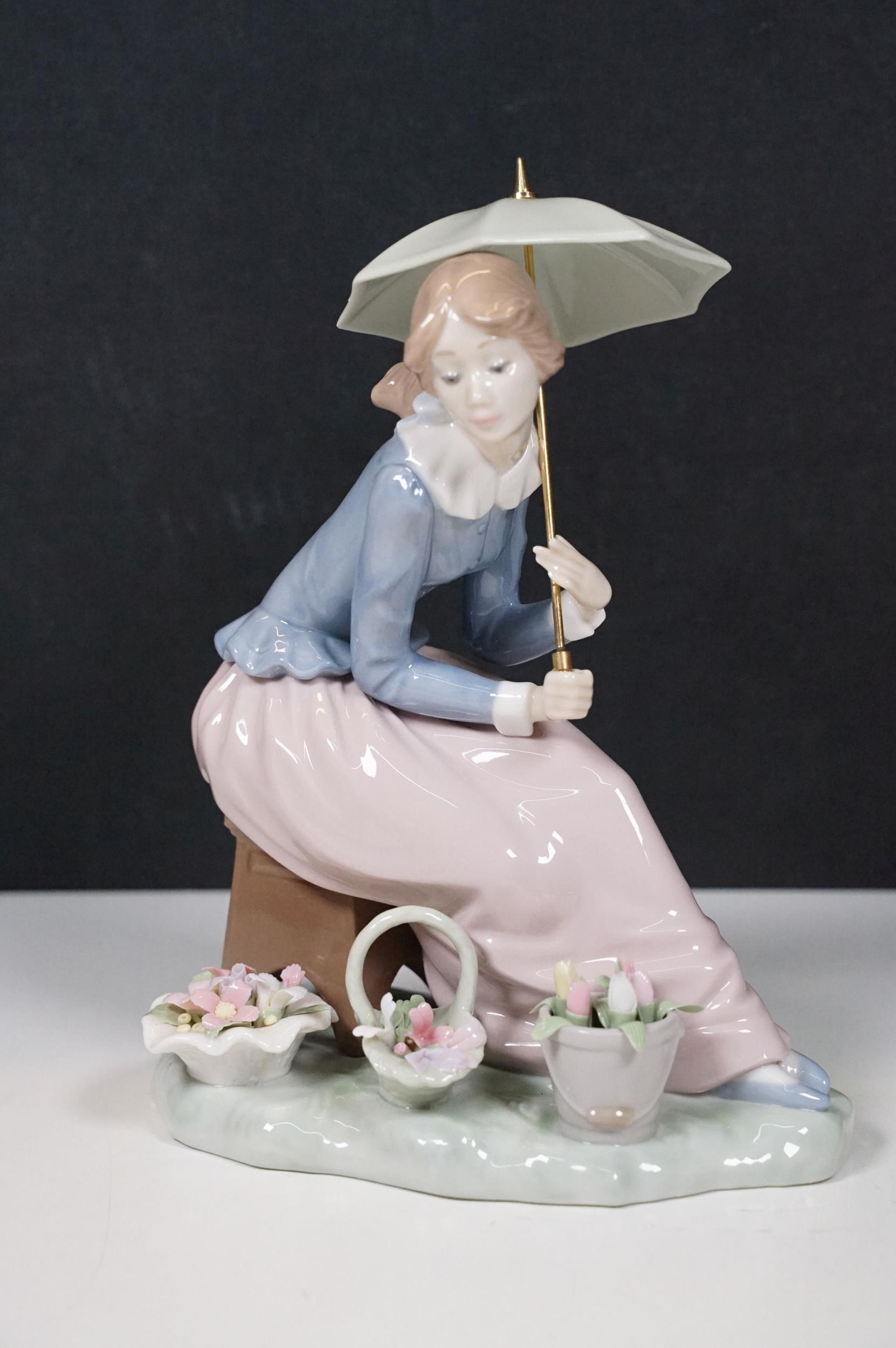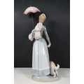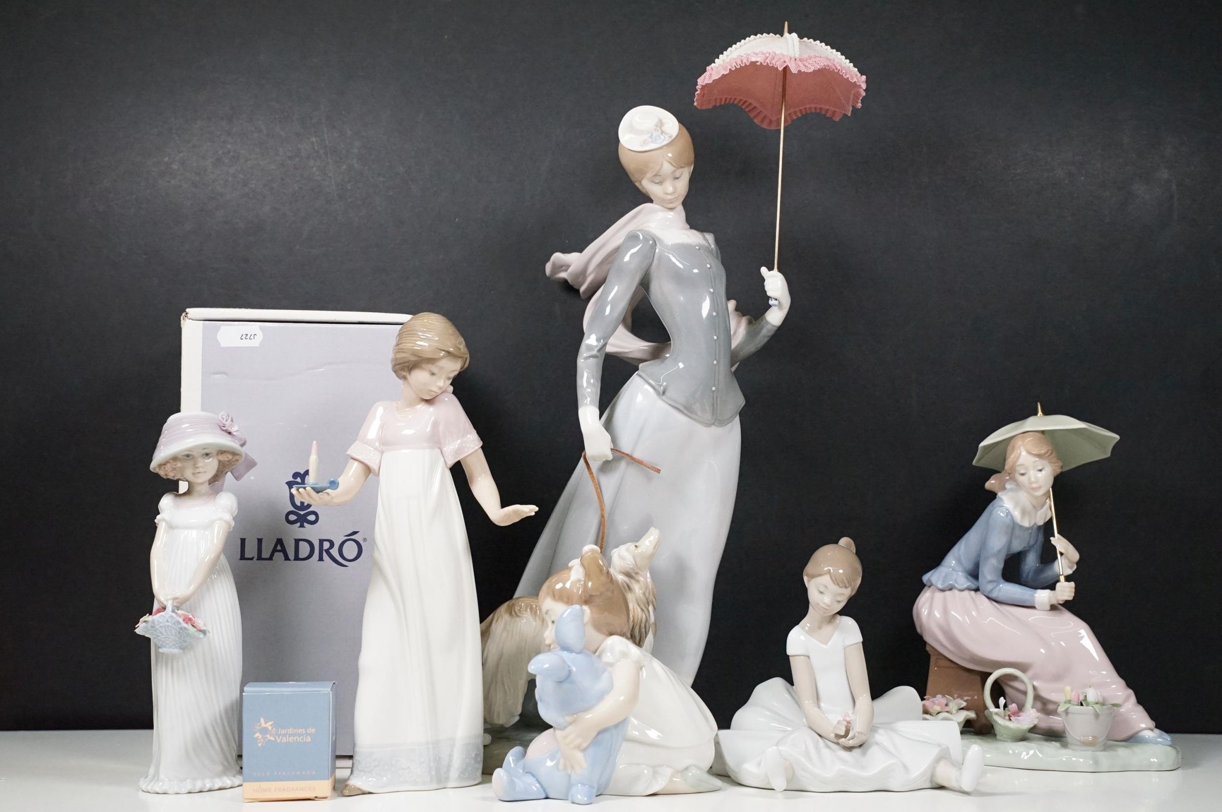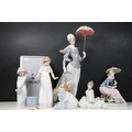 Group of Lladro and Nao figurines to include 'Little Lady', 'Seated lady with umbrella', 'Girl with toy rabbit', 'Seated ballerina' 1456, 'Girl with candle' 1155 and large example of 'Girl with dog and umbrella', H 39cm