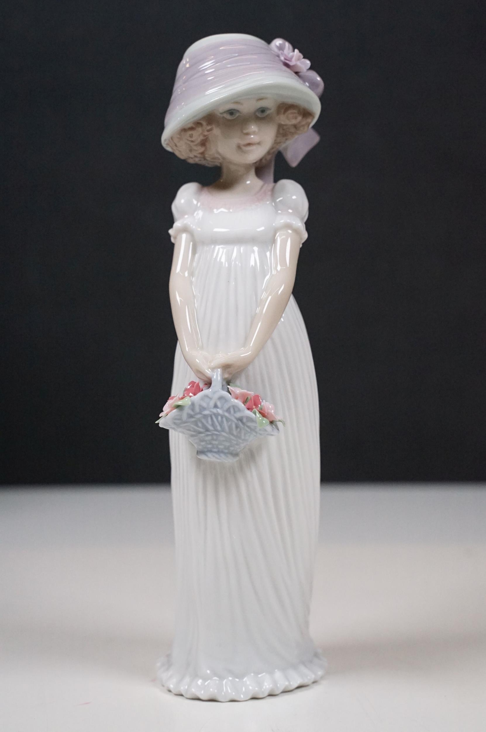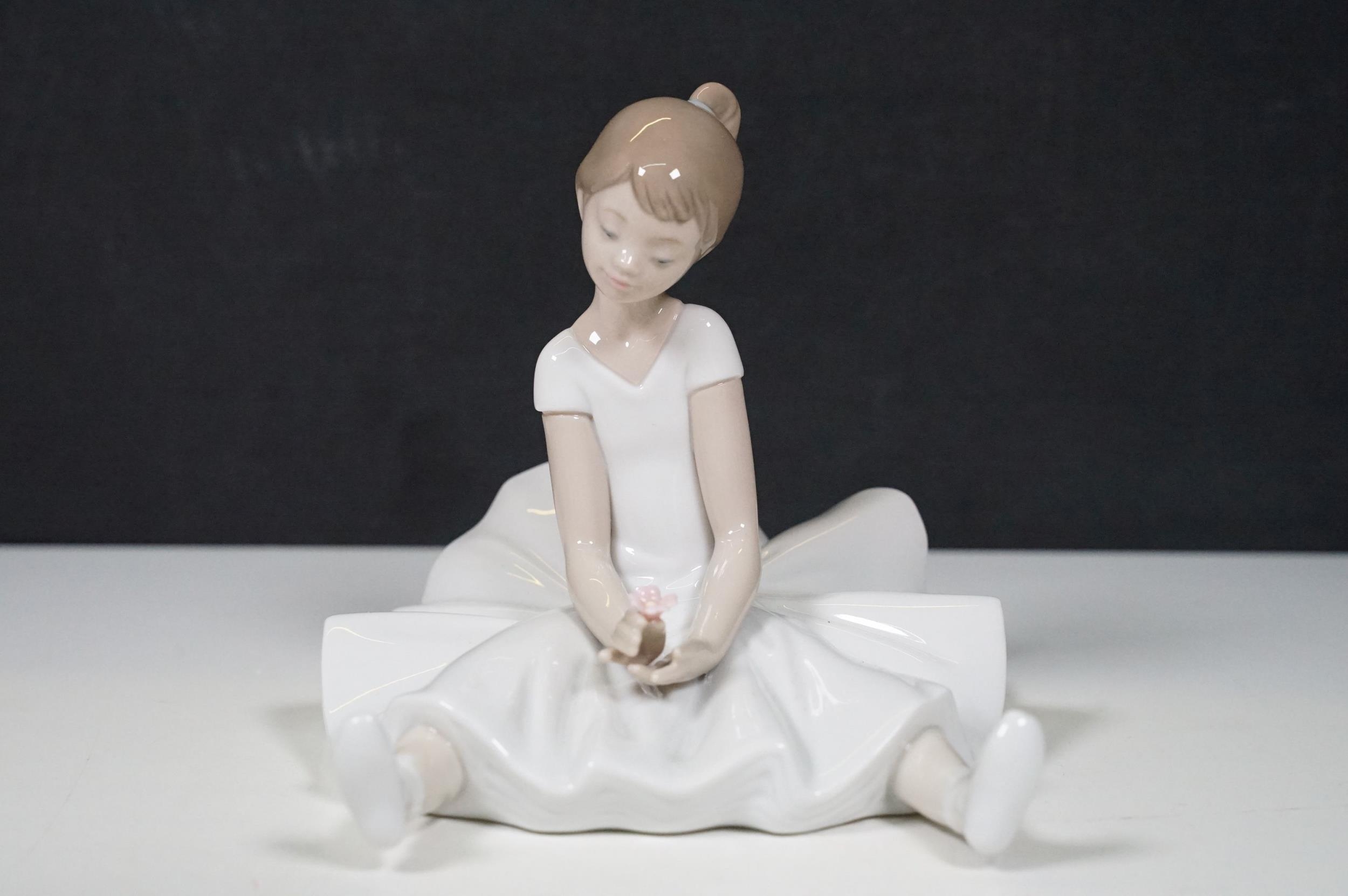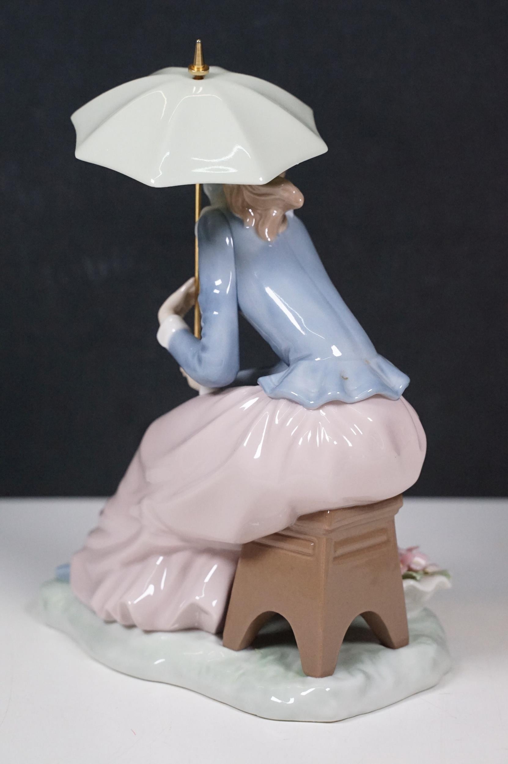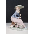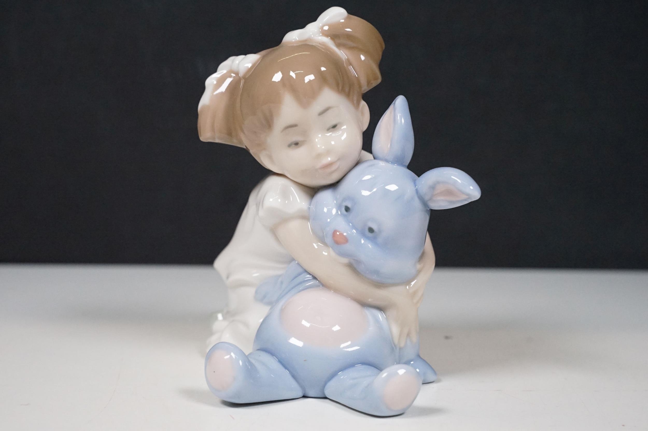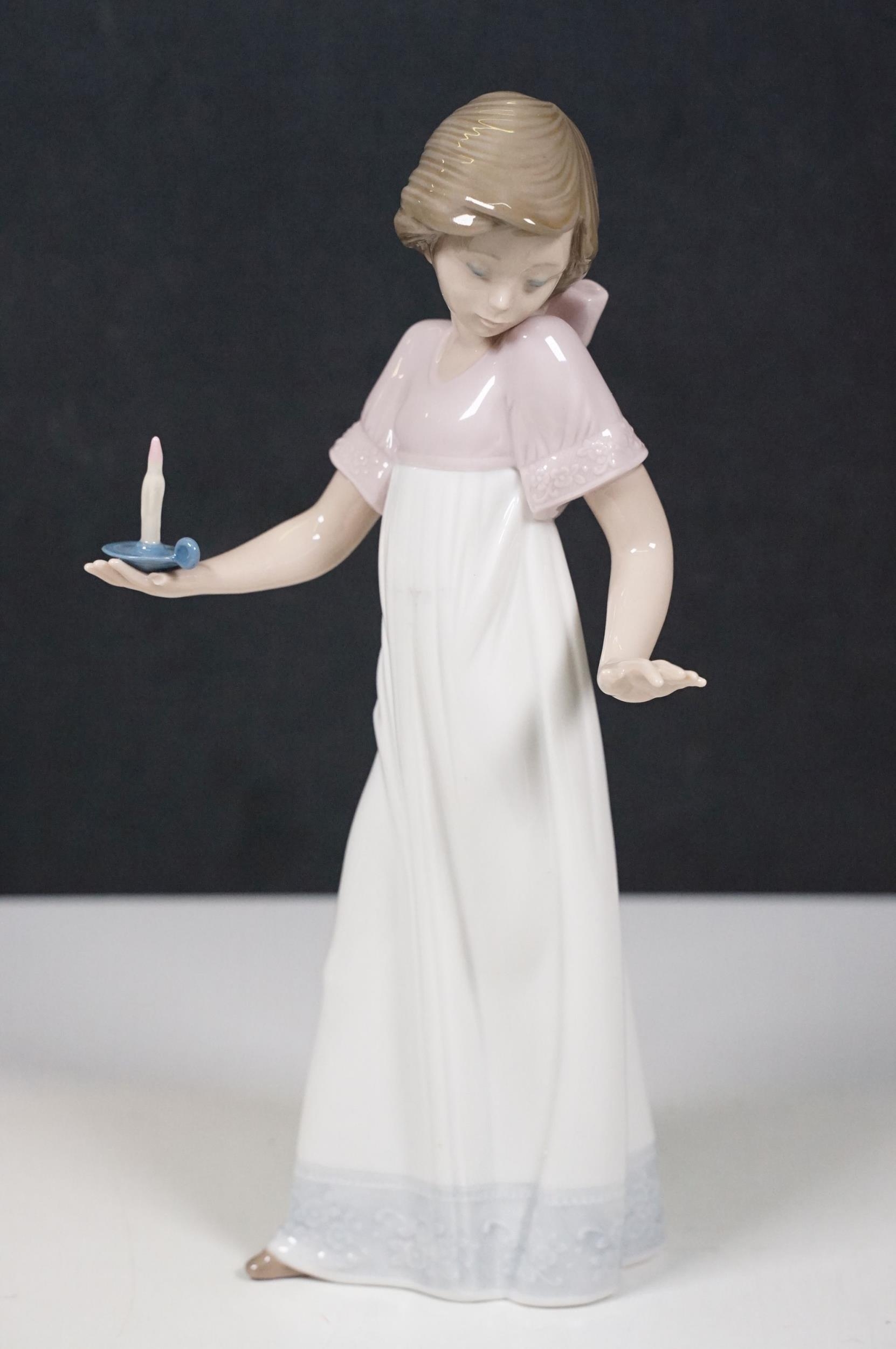 Group of Lladro and Nao figurines to include 'Little Lady', 'Seated lady with umbrella', 'Girl with toy rabbit', 'Seated ballerina' 1456, 'Girl with candle' 1155 and large example of 'Girl with dog and umbrella', H 39cm
