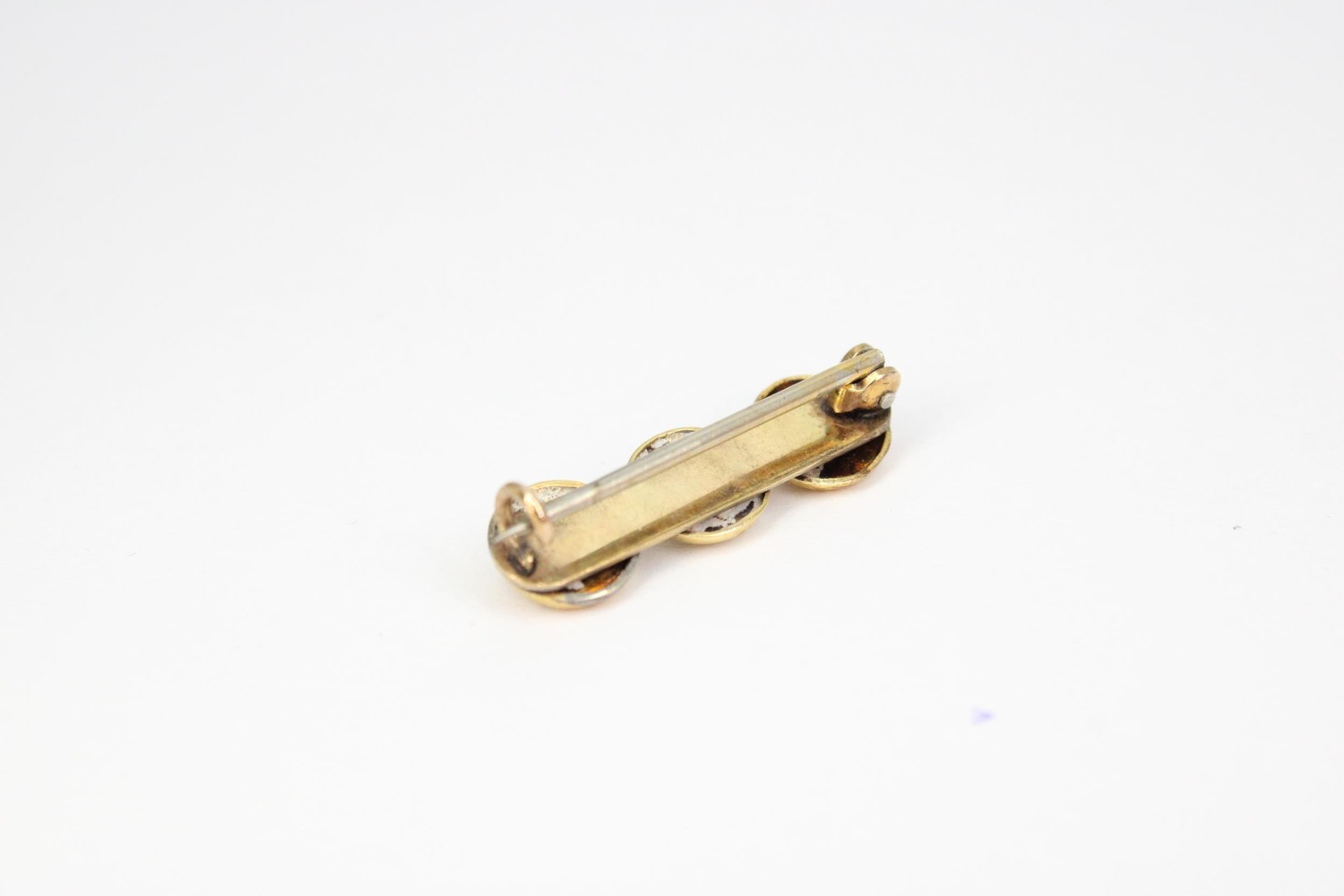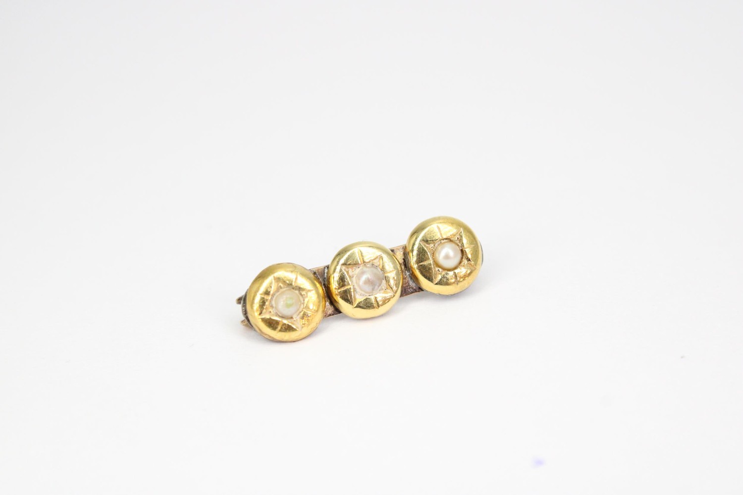 A bar brooch set with three cultured pearls. Tests 18ct and 9ct metal pin. Weight 3.04 grams