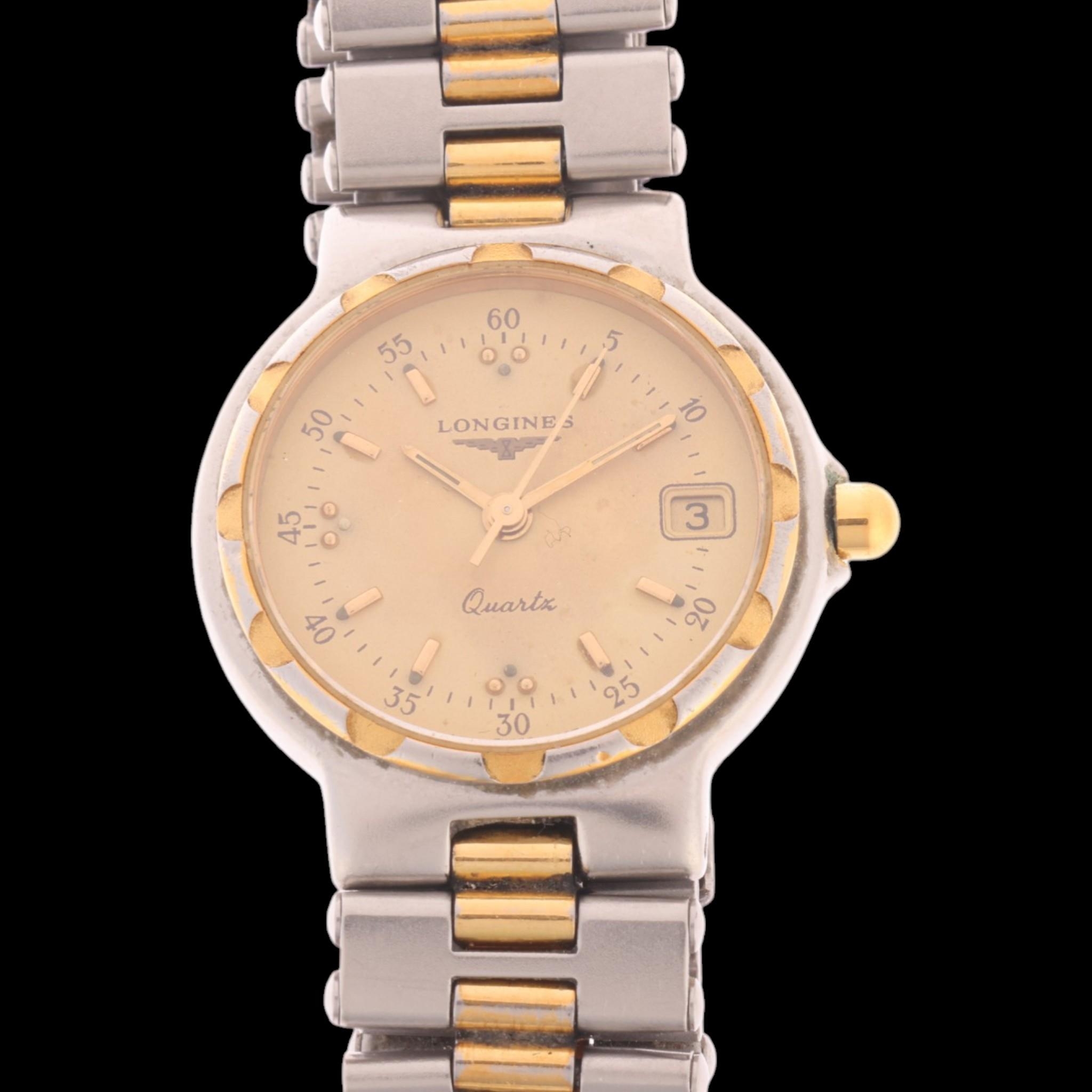LONGINES - a lady's gold plated stainless steel Conquest quartz calendar bracelet watch, champagne dial with gilt baton hour markers, pencil hands with luminous inserts, sweep centre seconds hand and date aperture, serial no. 21220002, case width 24mm