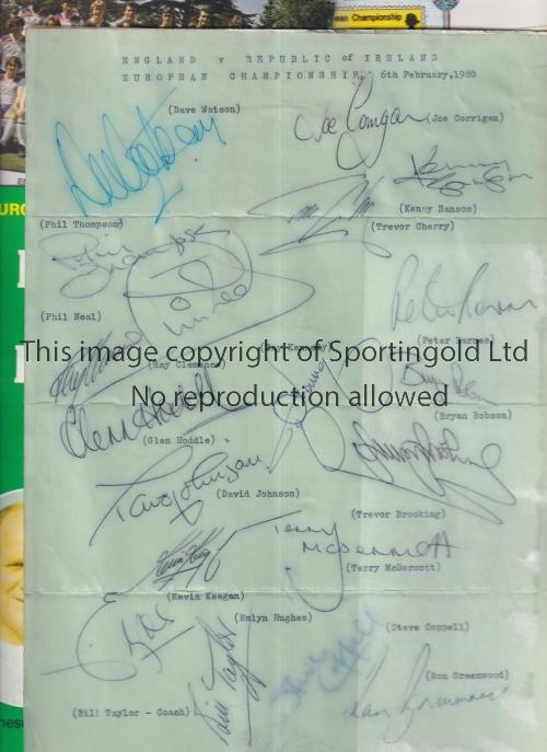 ENGLAND V REPUBLIC OF IRELAND 1980 Programme, ticket and First Day Cover for the match at Wembley 6/2/1980 plus a signed sheet 18 players and manager Ron Greenwood which has tape over all of the autographs and a colour England team group for 1980. Generally good