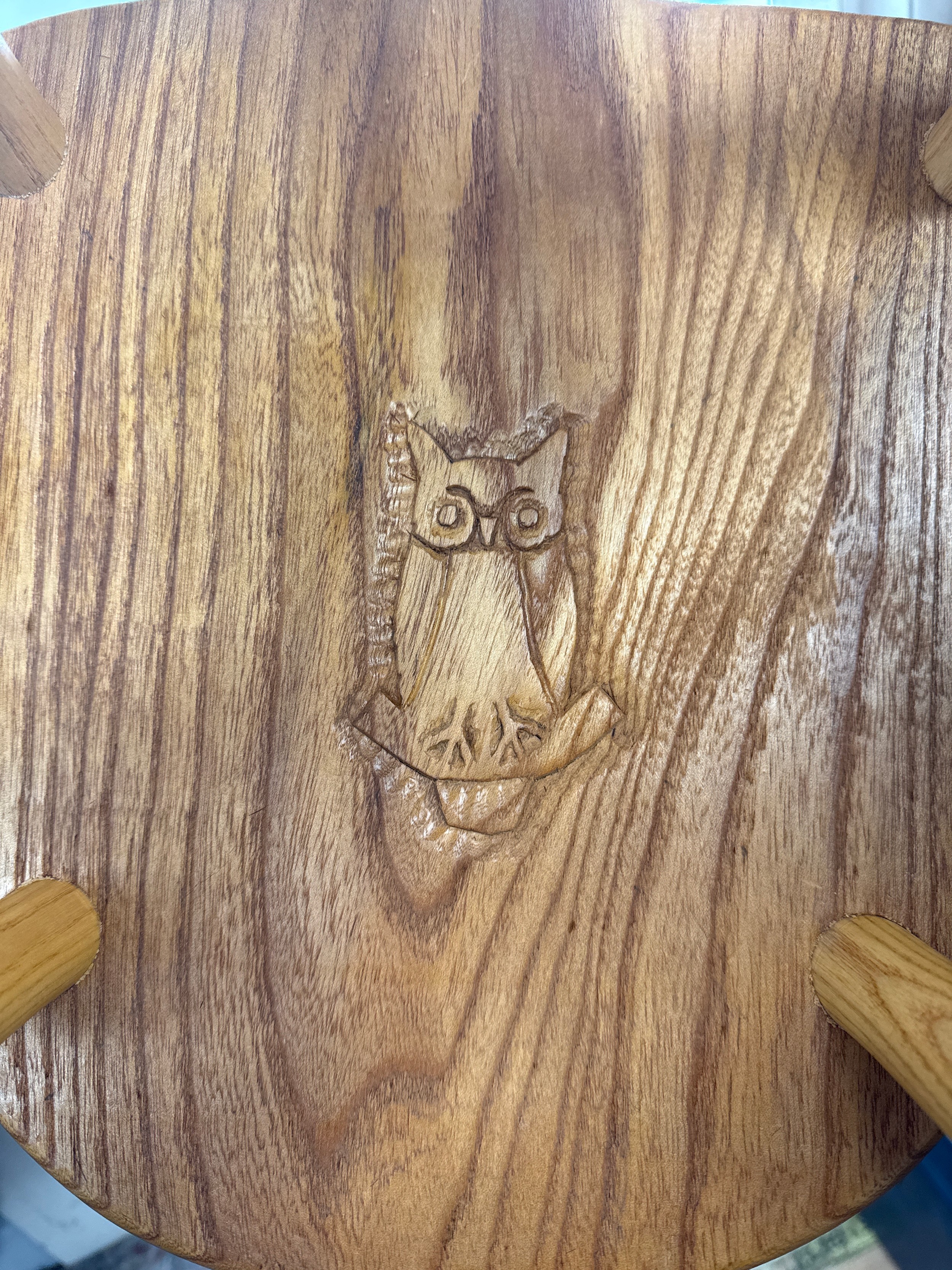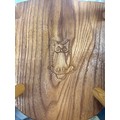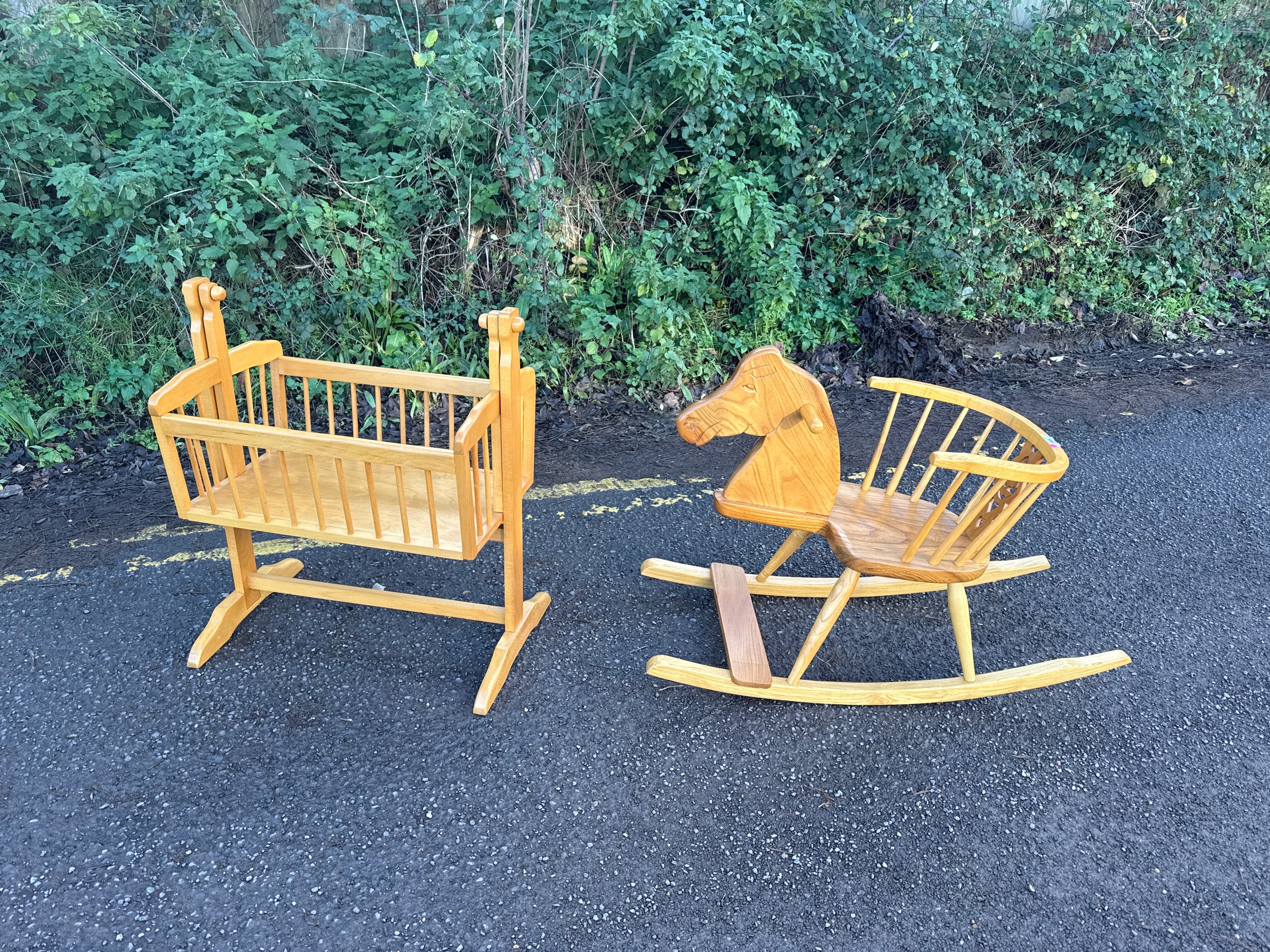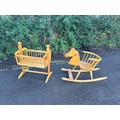 Hand made carved wooden chair rocking horse and a wooden dolls crib, Marked with an Owl
