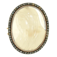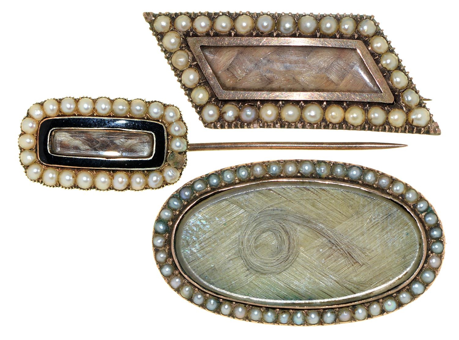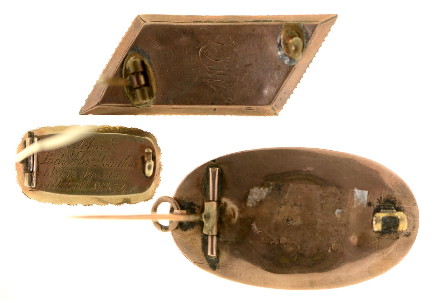 Three English mourning brooches, early 19th c, of gold or gold and enamel with split pearl surround and inset hair, reverse of one engraved Sir John & Lady Elizh Lowther OB 13 & 19 may 1844 at. 85 & 74, largest 36mm, 14.5g