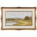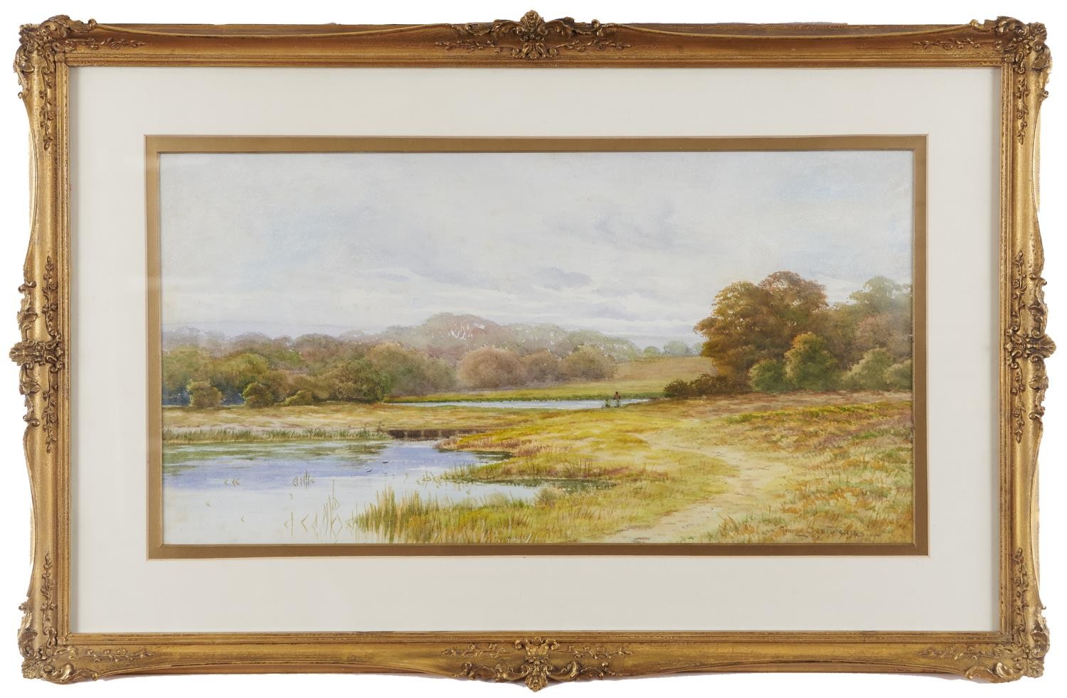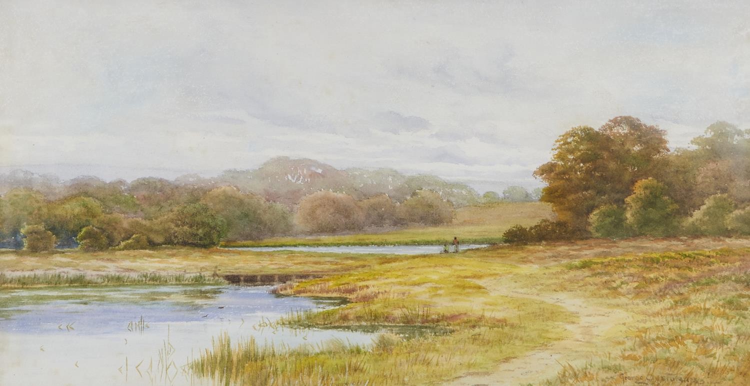 George Oyston (1861-1937) - Meandering River Landscape with Figures, signed, watercolour, 29 x 55cm
