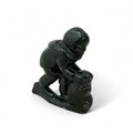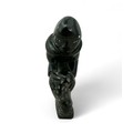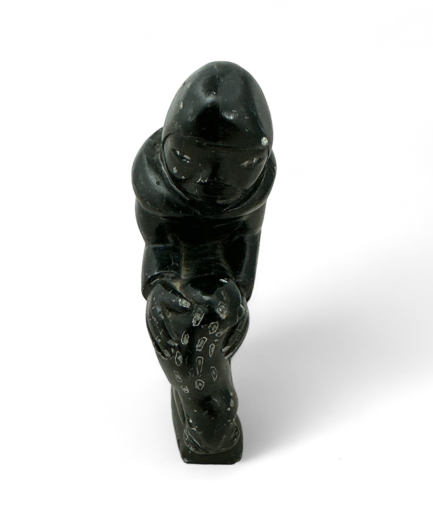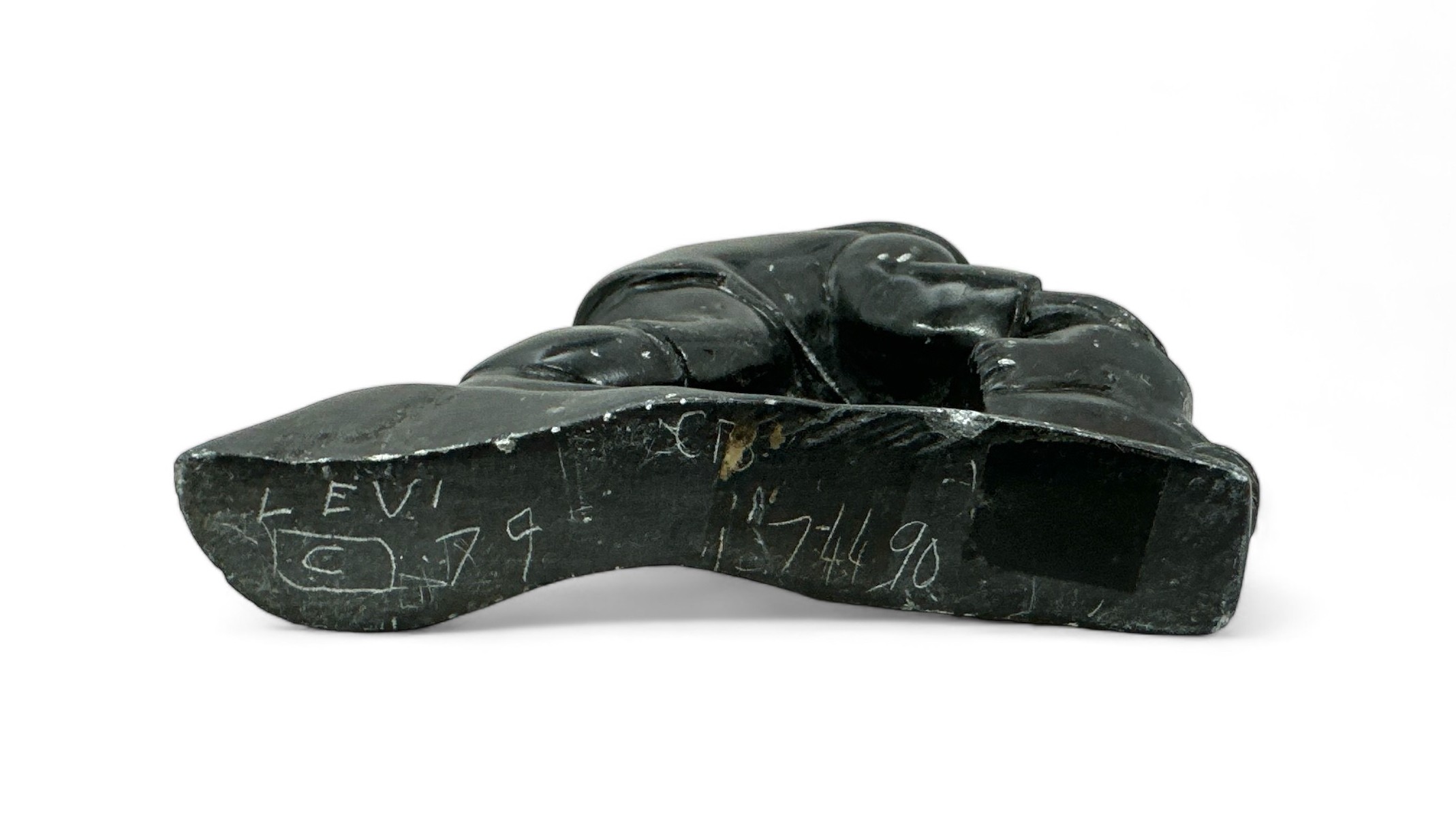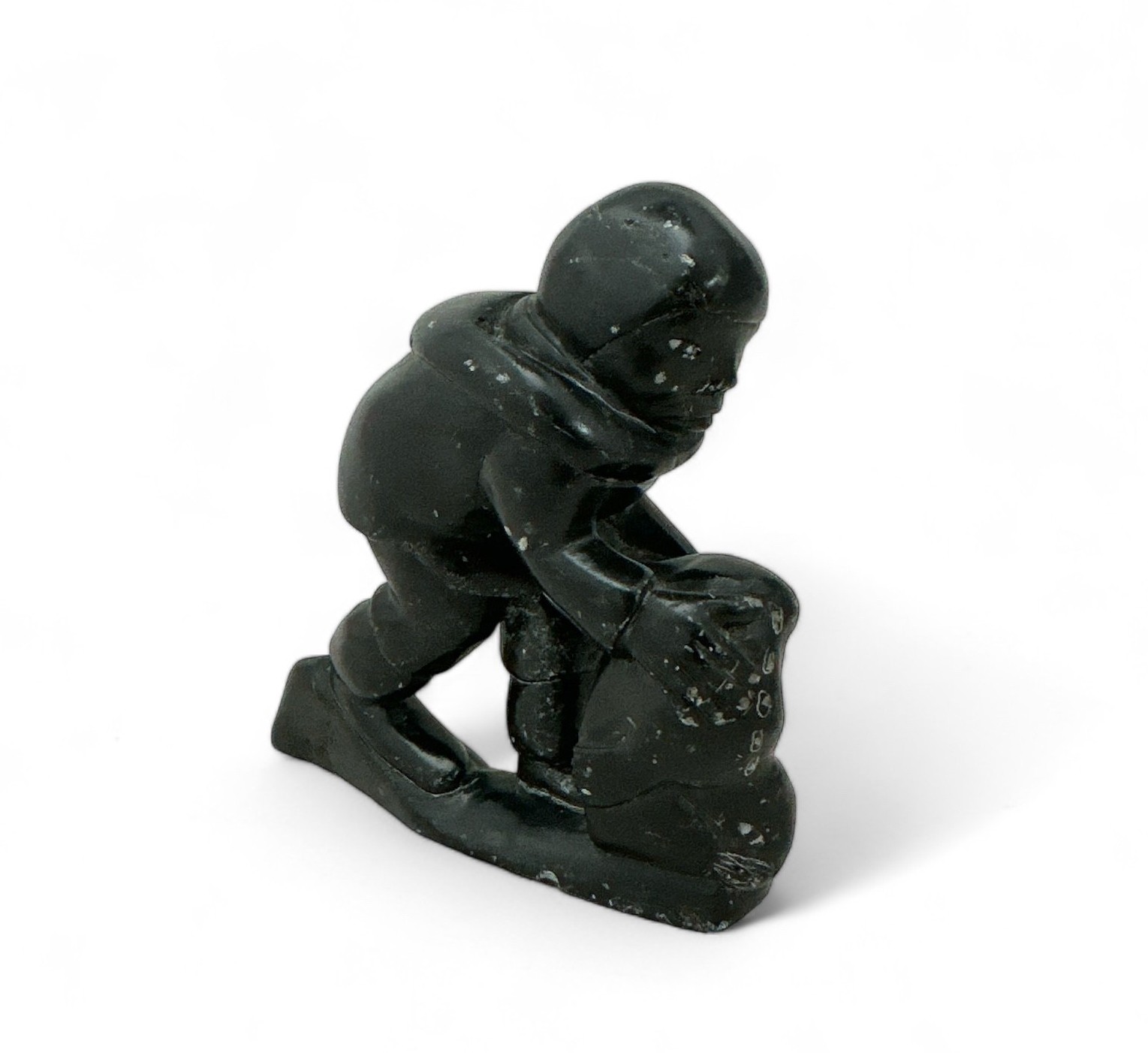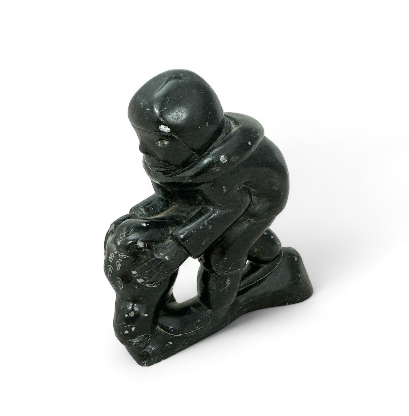 Levi Qumaluk (Inuit, 1919-1997), soapstone carving of a man holding a seal. Signed Levi to base, 74490. Height 12cm, width 4cm, length 12cm.