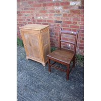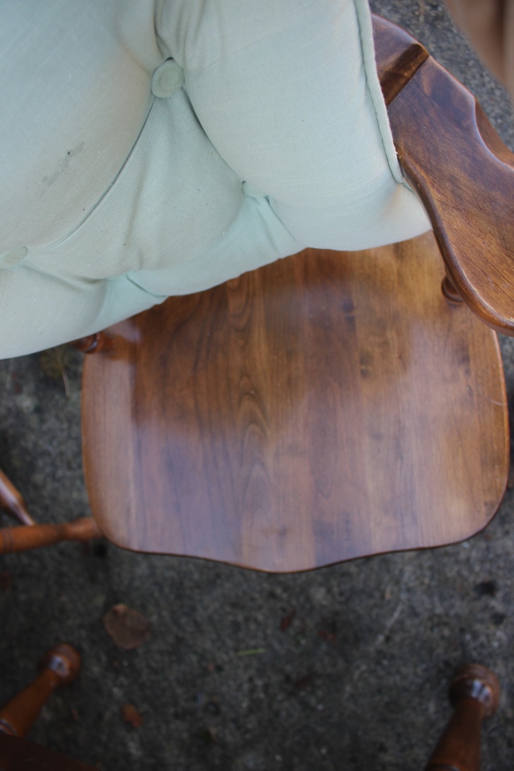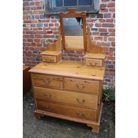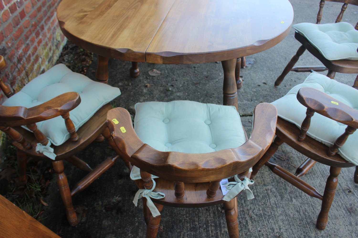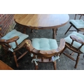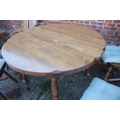 A pine circular extending dining table with two extra leaves, on turned column and quadruple splay supports, 65" long overall, and a set of six spindle back dining chairs