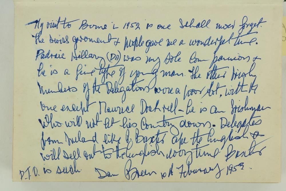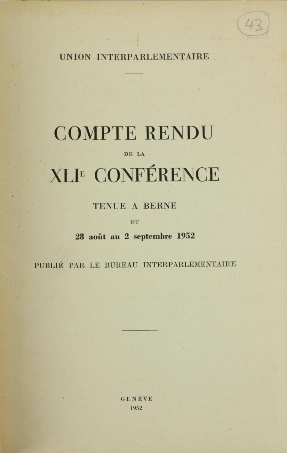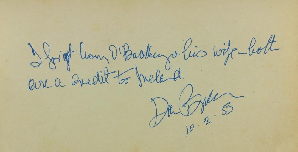 With a Long Inscription by Dan Breen, 1953 [Breen (Dan)] Union Interparliamentarie. Conpte Rendu de la XLIe Conference, roy 8vo Geneva 1962, orig. cloth (spine faded), text in French and English. With a long inscription on f.e.p. and following blank page by Dan Breen, evidently a delegate to this inter parliamentary meeting. 'The visit to Berne in 1952 is one I shall never forget. The Swiss Government & people gave me a wonderful time. Padraic Hillary (Dr.) was my sole companion & he is a fine type of young man,' also mentioning other Irish delegates, 'a poor lot.. ape the English & will sell out to the English any time...' (1) *Dan Breen (1894 - 1969) began the War of Independence with the ambush at Soloheadbeg, 1919. He was Fianna Fail T.D. for Tipperary 1932-65.