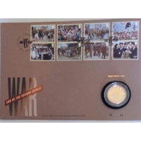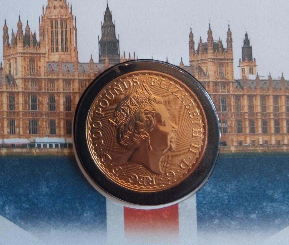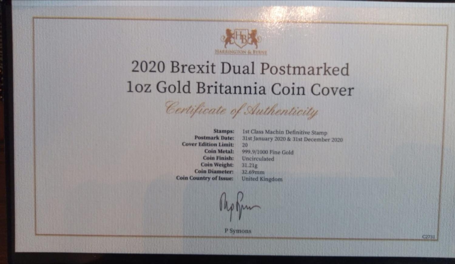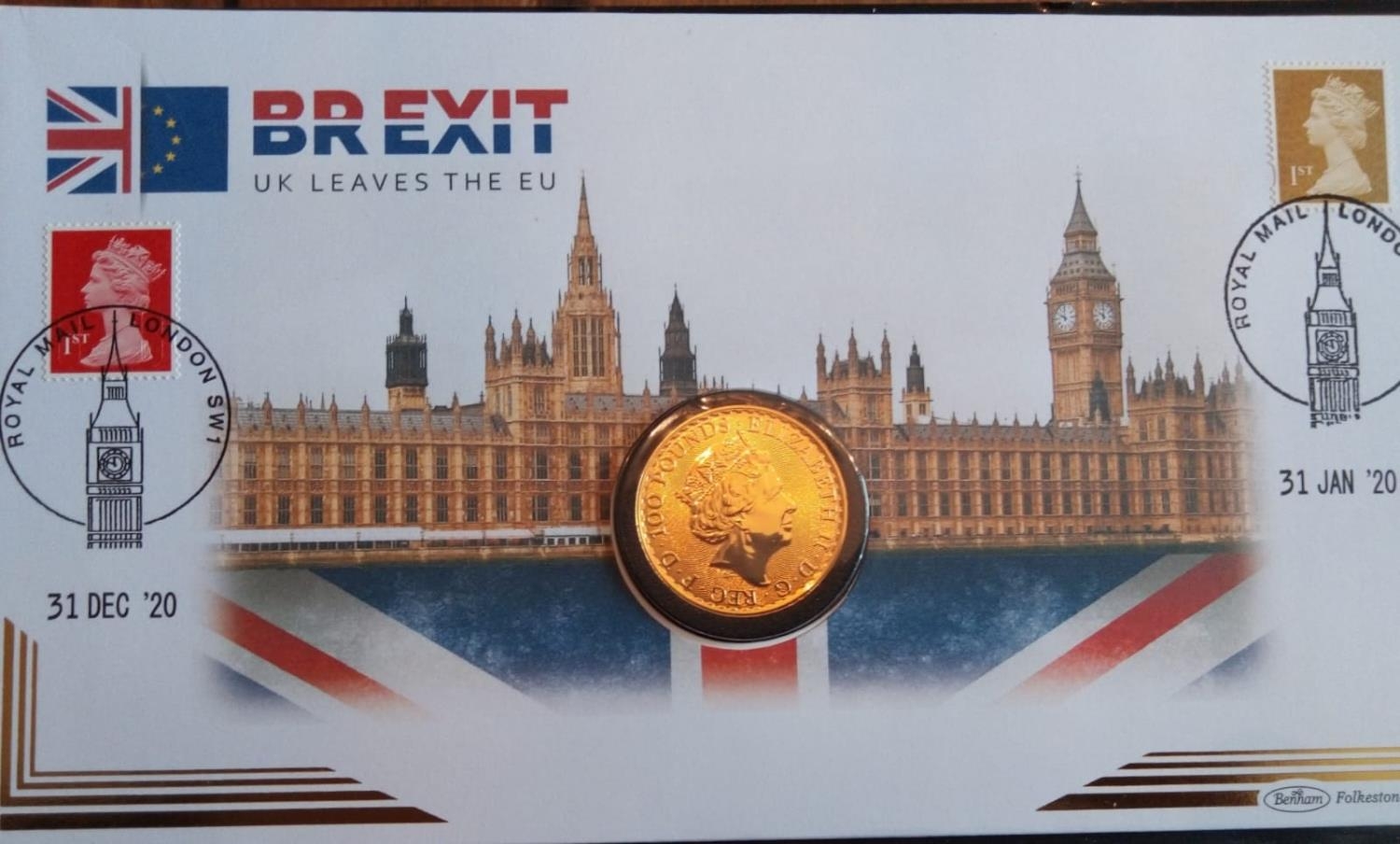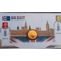 A 24CT GOLD 1OZ BREXIT PROOF COIN COVER, DATED 2020, BREXIT DUAL POSTMARKED 1OZ GOLD BRITANNIA COIN COVER